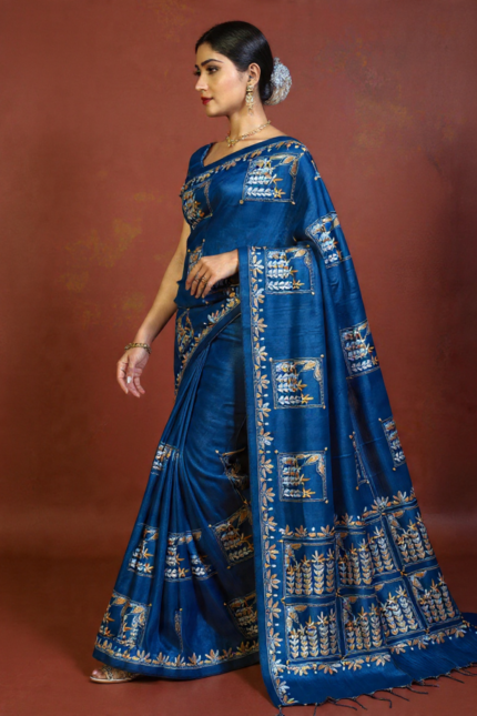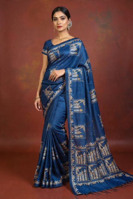 The Indigo Haven: Denim Blue Handloom Kantha Saree