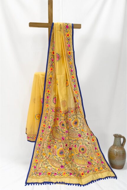# Mustard Yellow Chanderi Cotton Silk Phulkari Saree