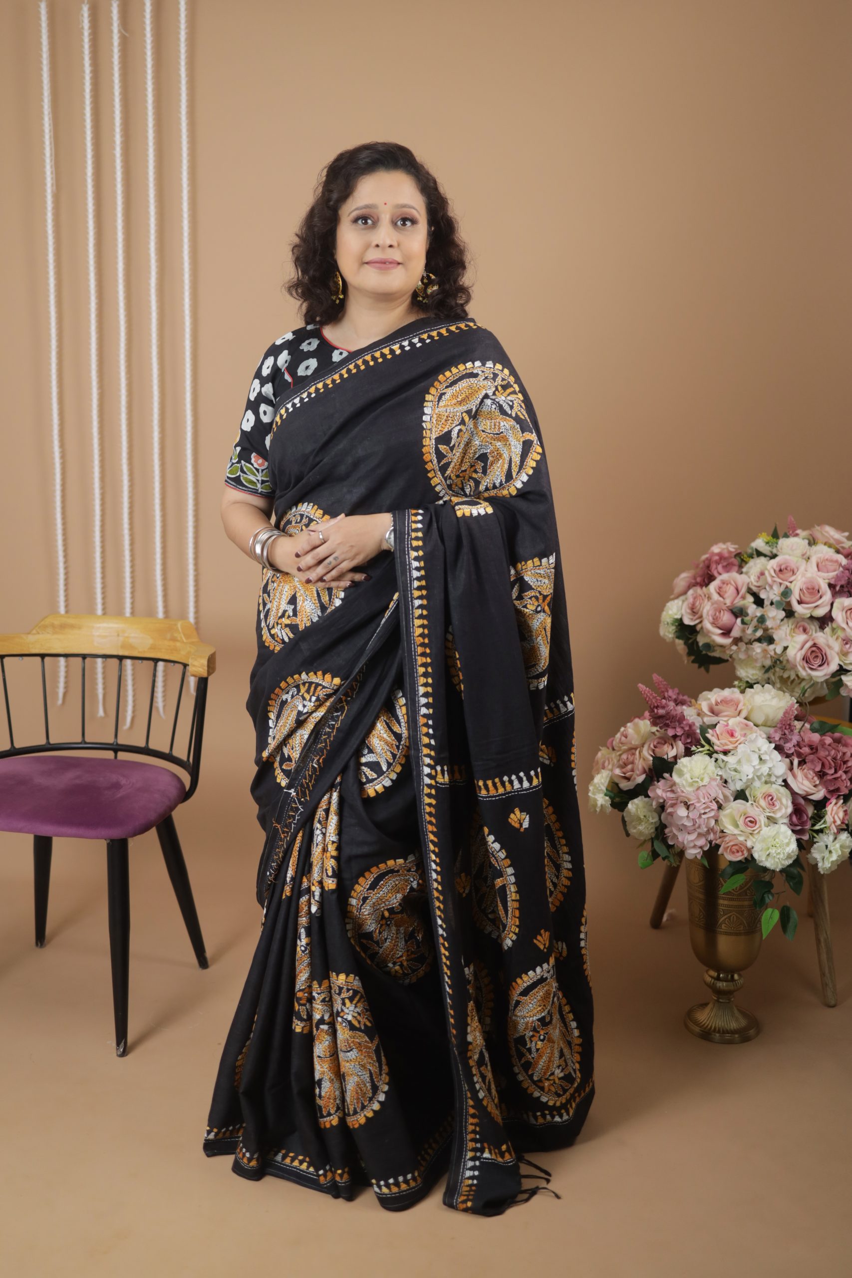 A beautiful Black Cotton Sari with intricate Pankhi kantha embroidery throughout the sari.