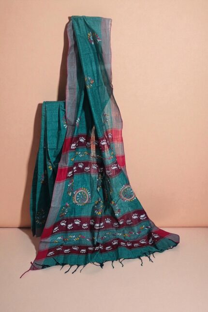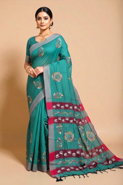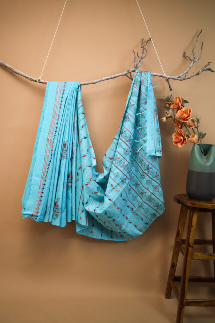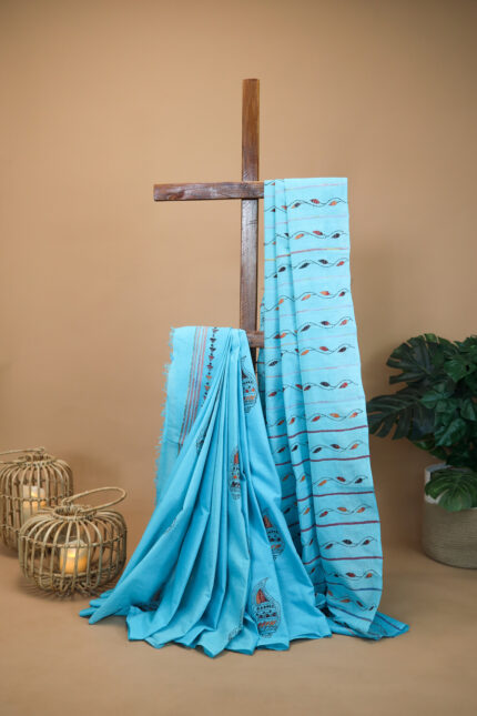 # Teal Blue Handloom cotton Kantha Embroidery Saree