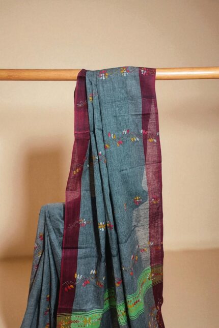 #The Steel Folklore-Blueish Grey Semi Silk Kantha Embroidery Saree