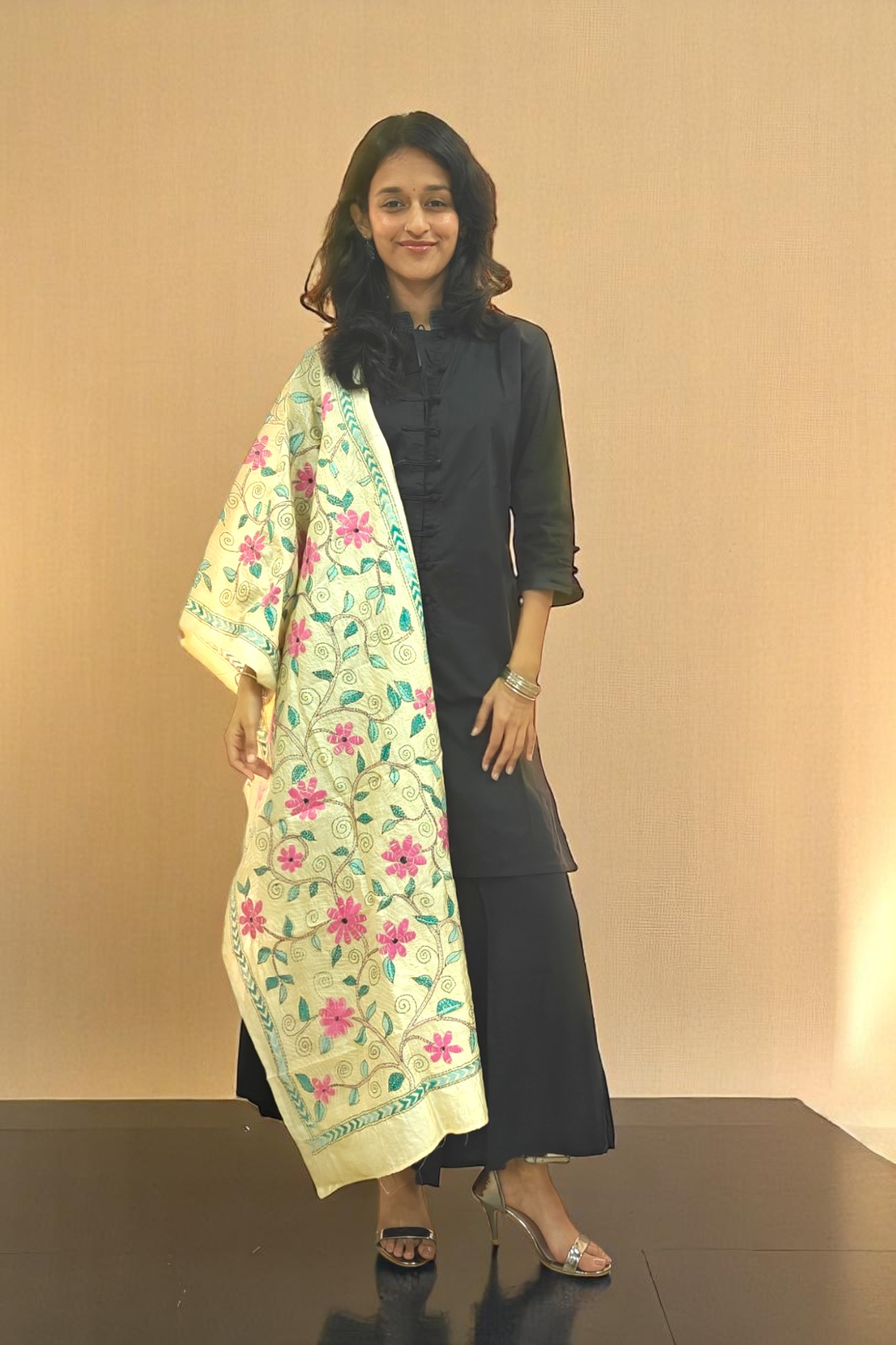 Stay cozy and chic with our Kantha embroidery Stole. A Cream colour semi tussar stole with intricate pink floral embroideries throughout with teal green embroidery border. Adorned with elegant Kantha embroidery throughout, this stunning piece effortlessly enhances your feminine appeal with a touch of refined sophistication. It complements both ethnic and western outfits, creating timeless signature looks.