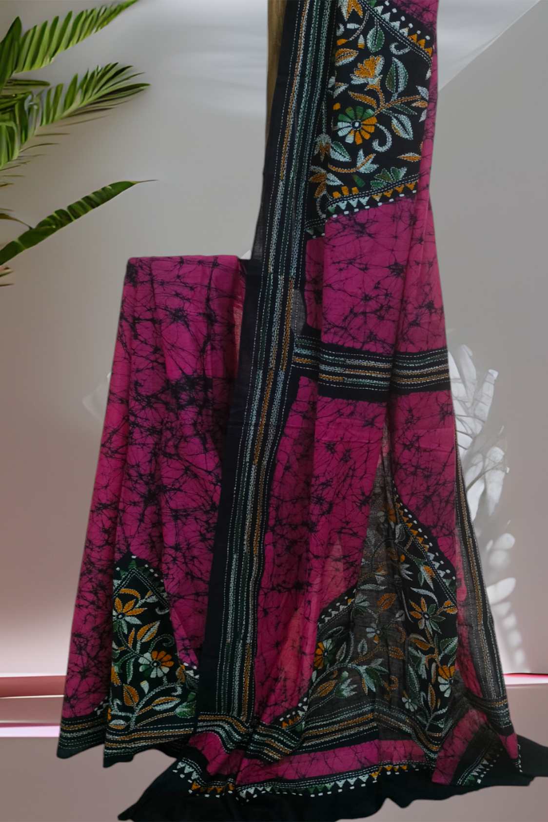Home Cotton Batik Dark Pink cotton batik Kantha embroidery sari