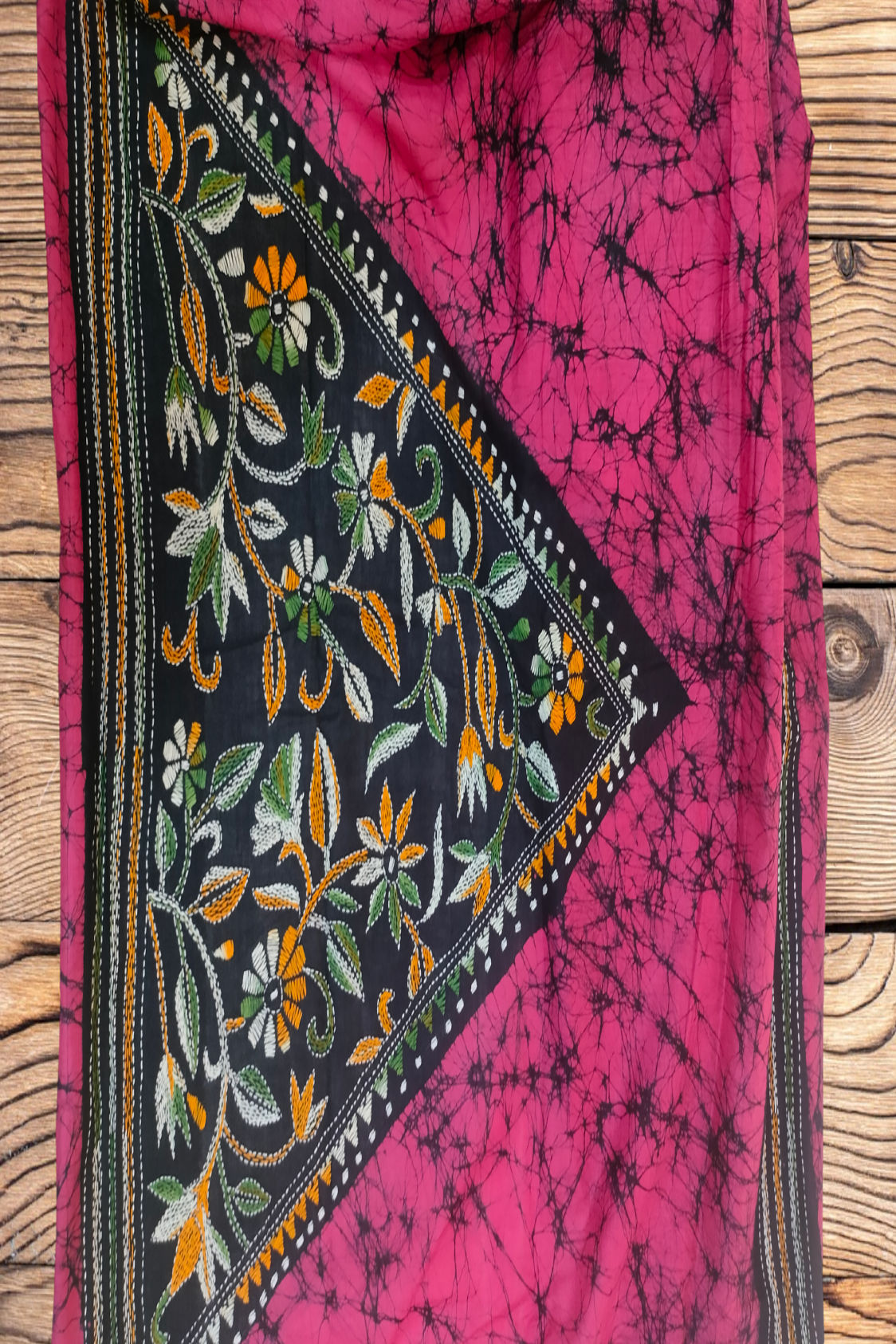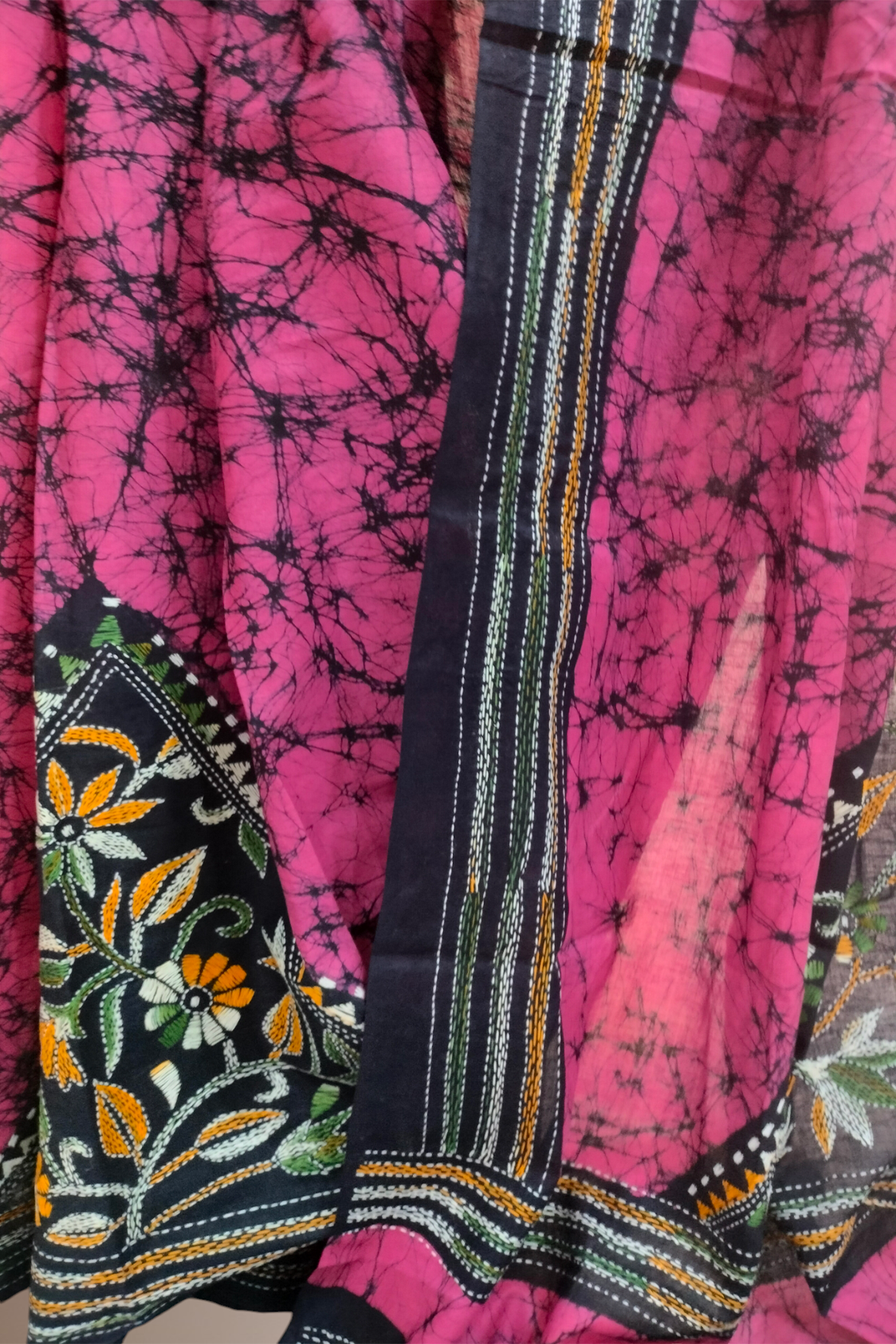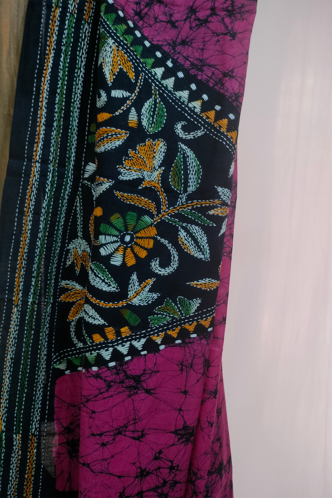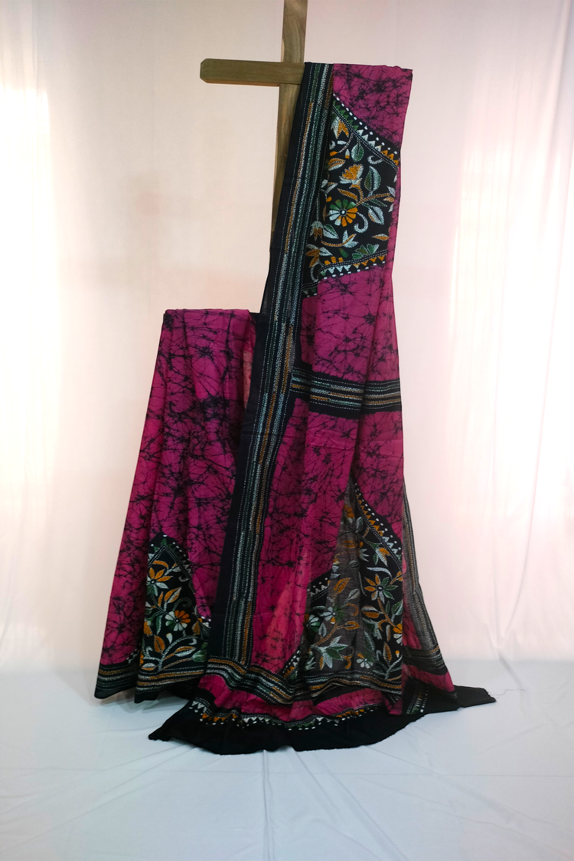 Rouge Pink and Black cotton batik Kantha embroidery sari