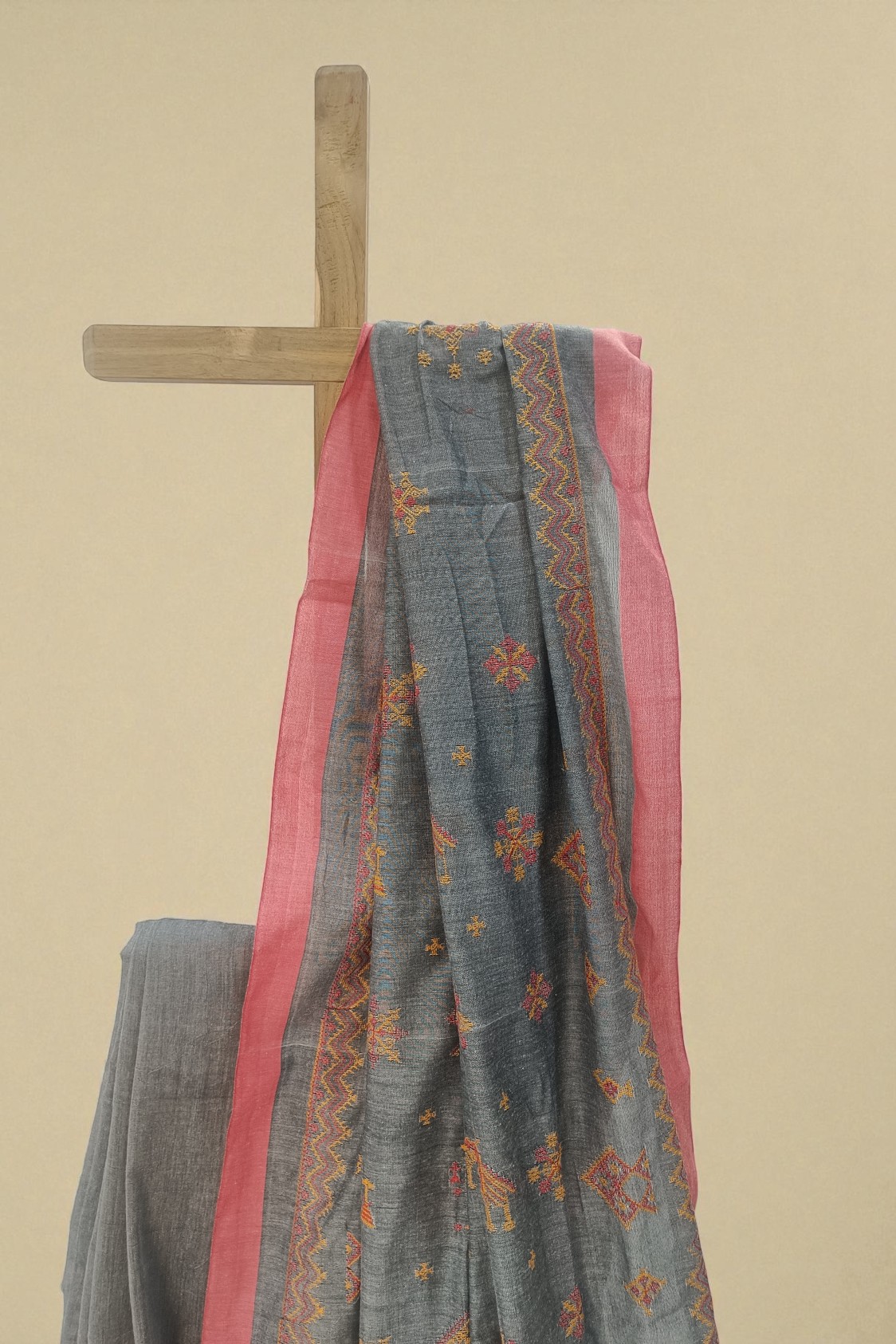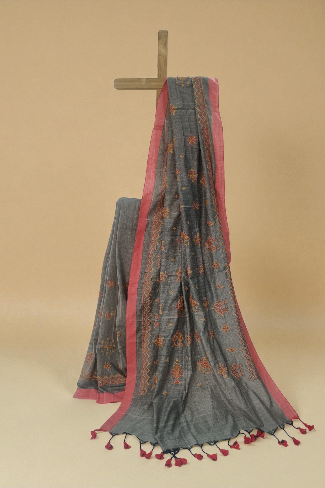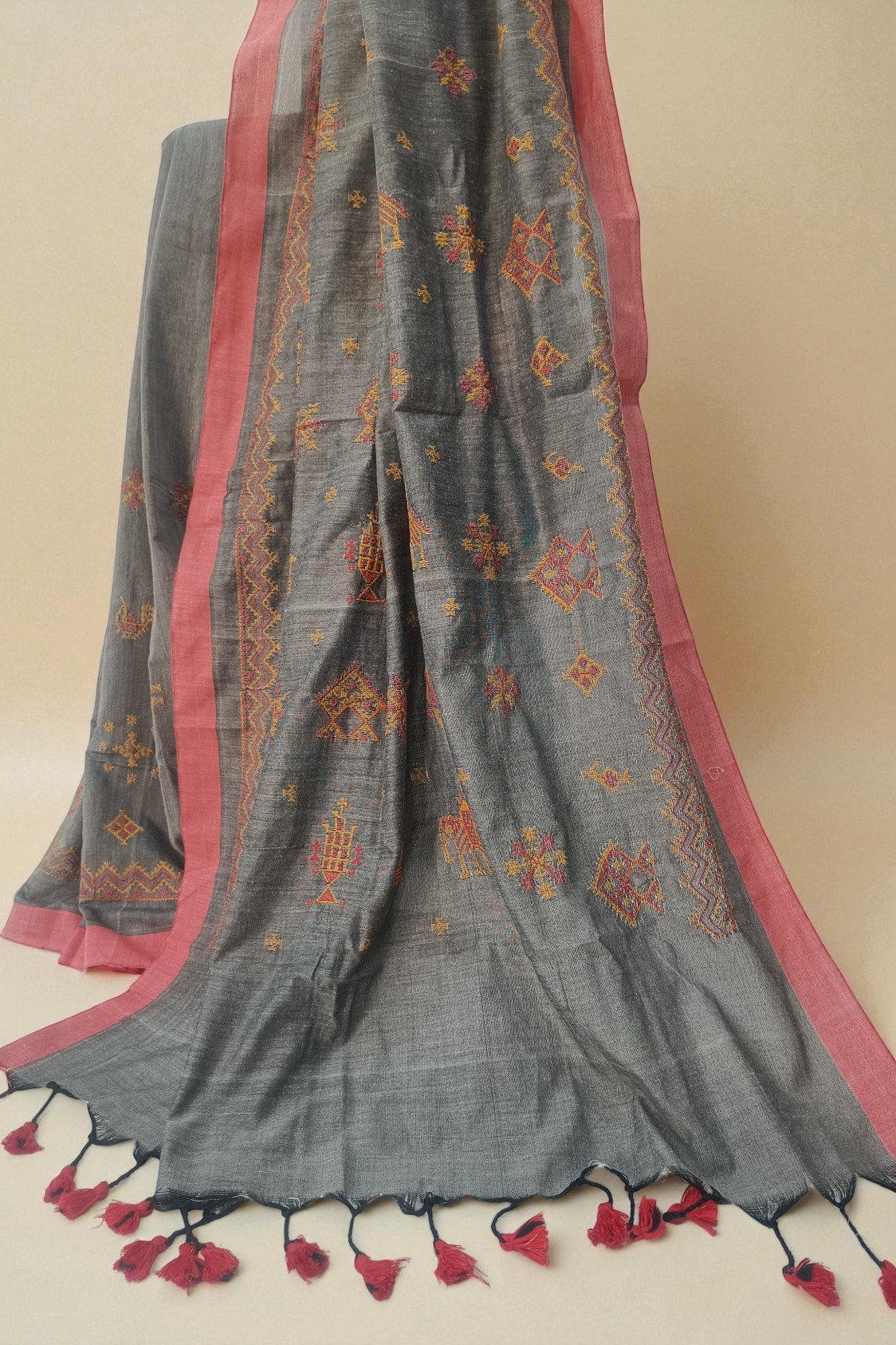 • Striking Border: The saree is finished with a continuous, rich Brick Red border running along both edges, perfectly framing the Grey body and tying together the embroidery colors.