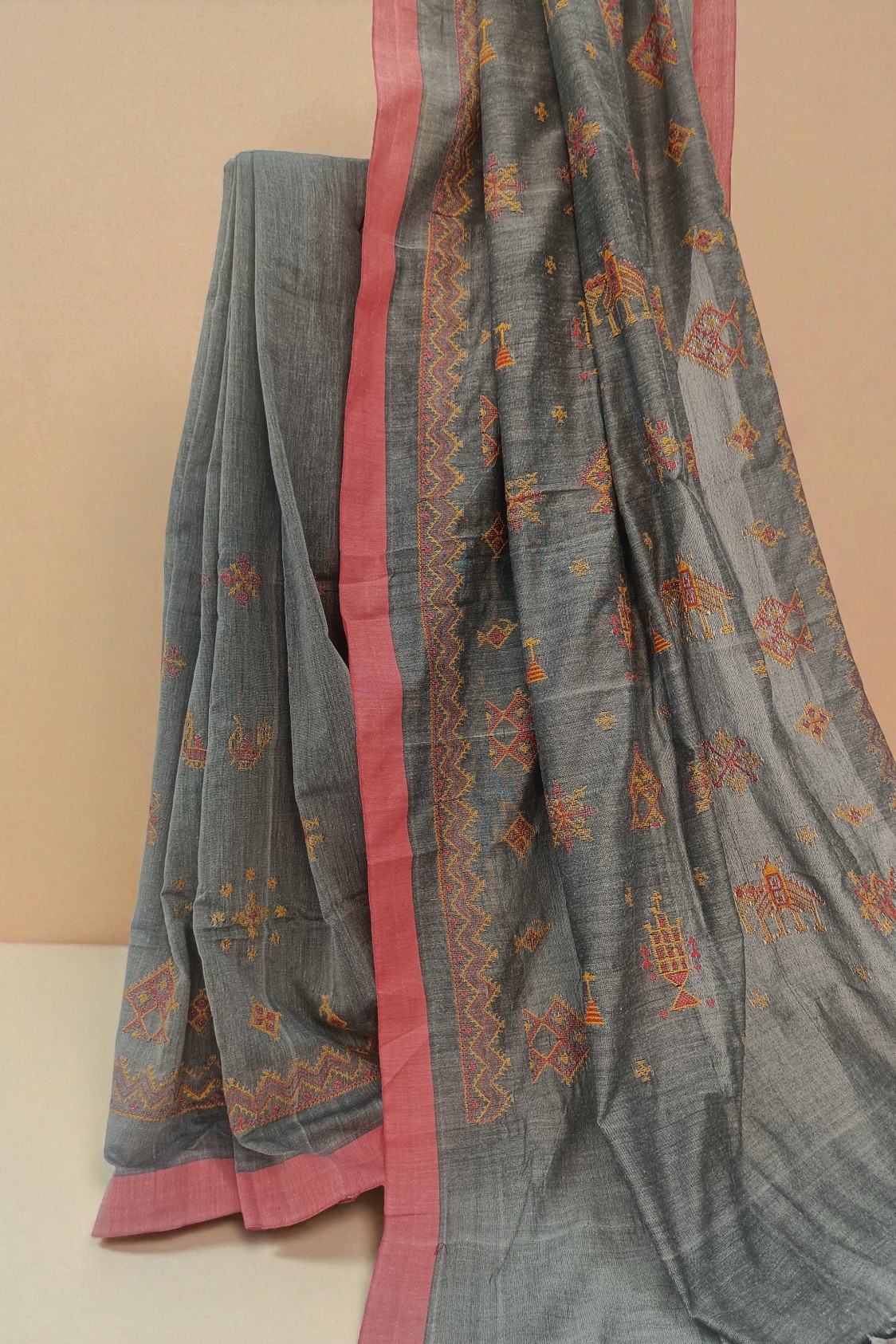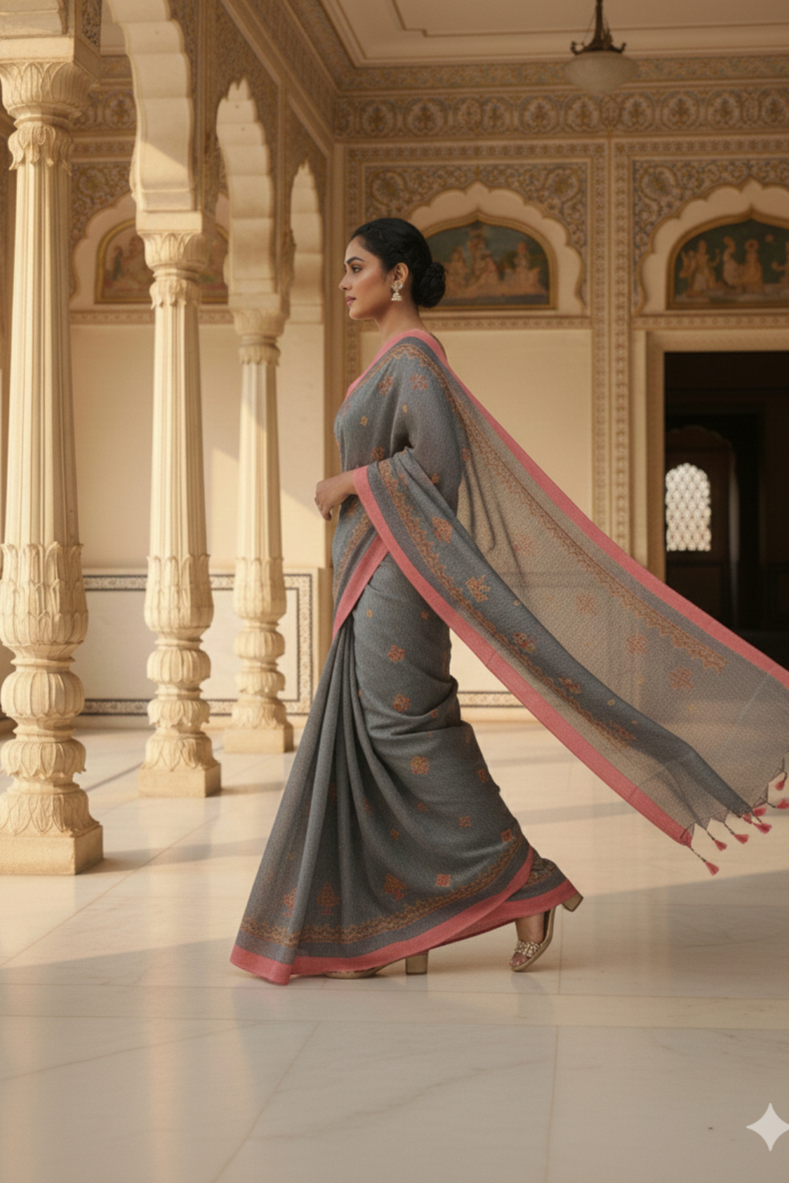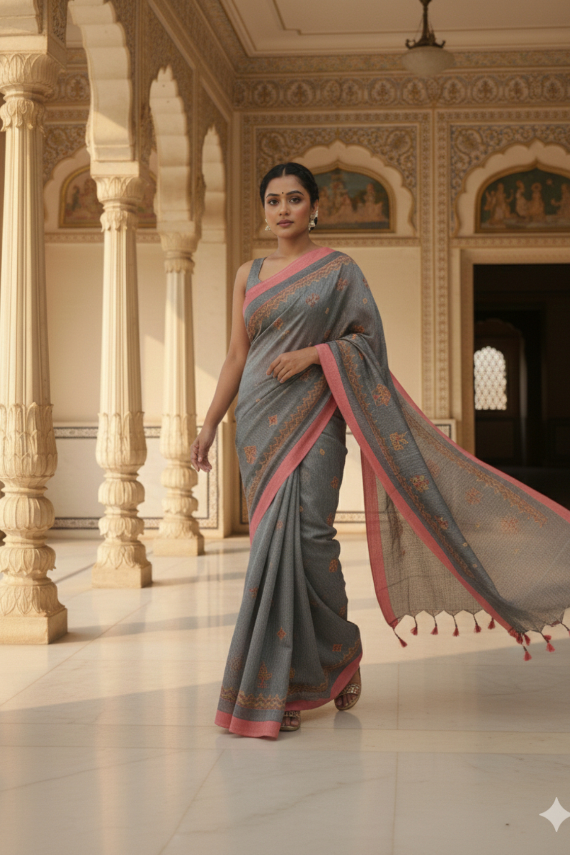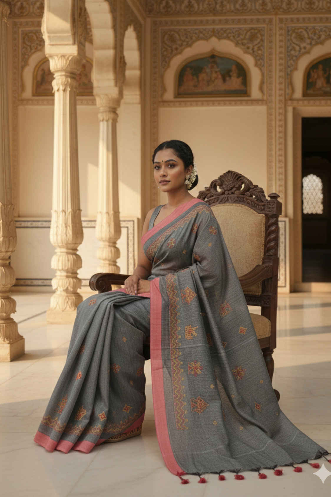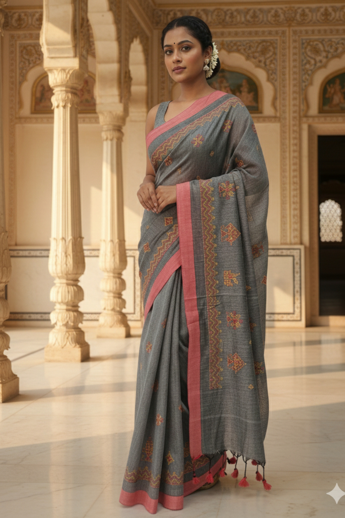 Step out in contemporary elegance and traditional artistry with this beautifully crafted Cotton Saree. The base fabric, made from soft, breathable cotton, is rendered in a chic, versatile Grey hue, offering a modern backdrop for heritage craft.