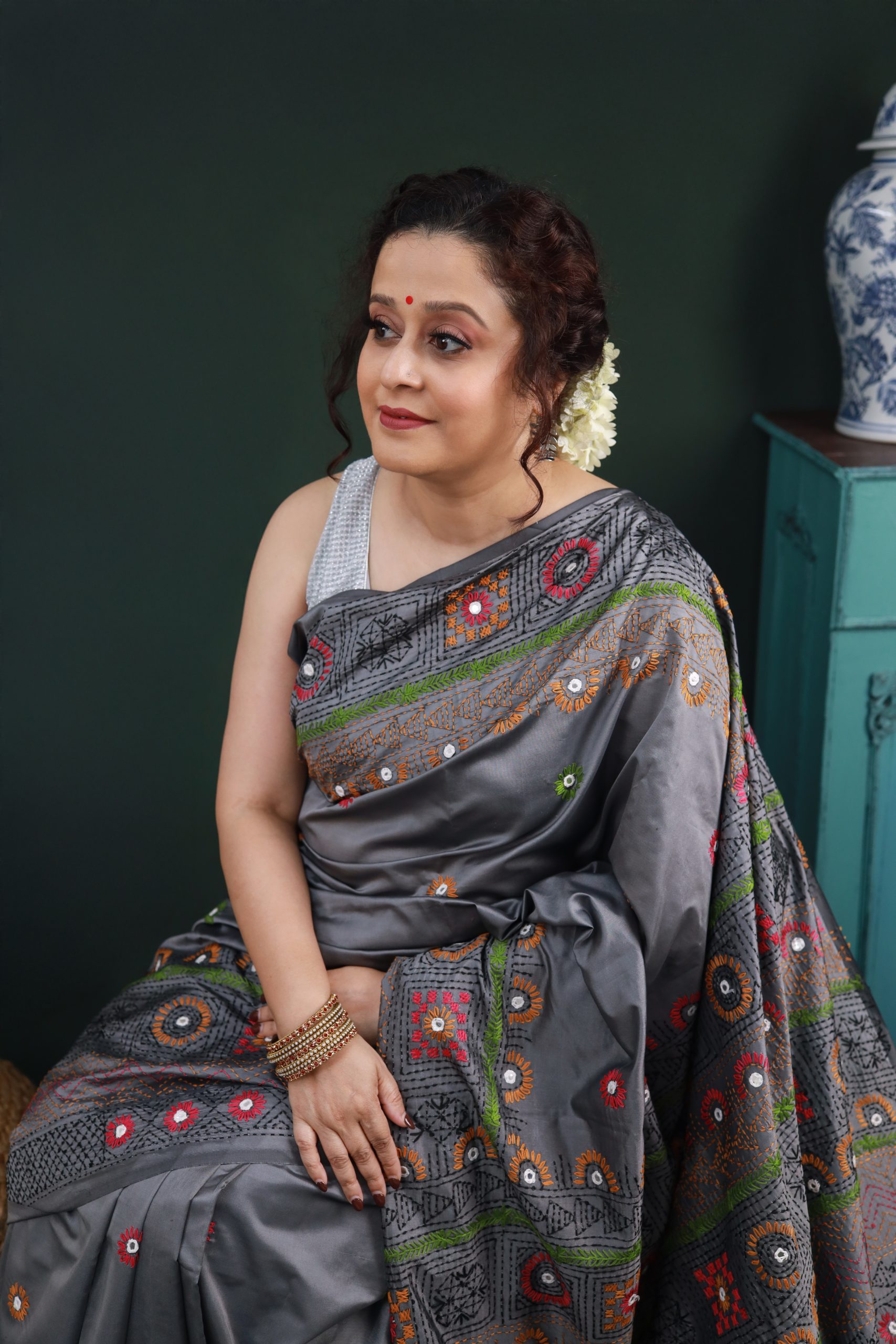 This is an exquisitely crafted Grey Lambani Hand Embroidery Saree on semi silk with vibrant colour threads and foil mirrors. The sari comes with a running blouse piece with Lambani embroidery border.