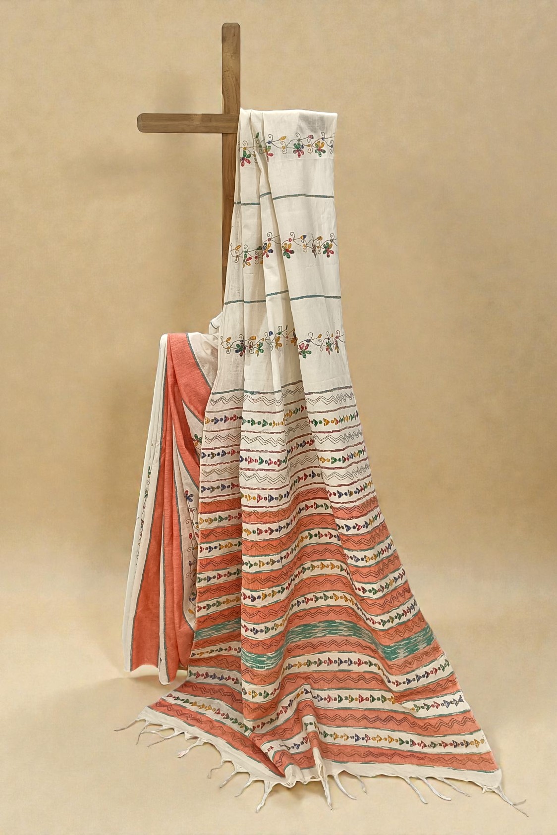 • Color: Alternating Ivory White and Light Orange Columns with Multicolor Embroidery