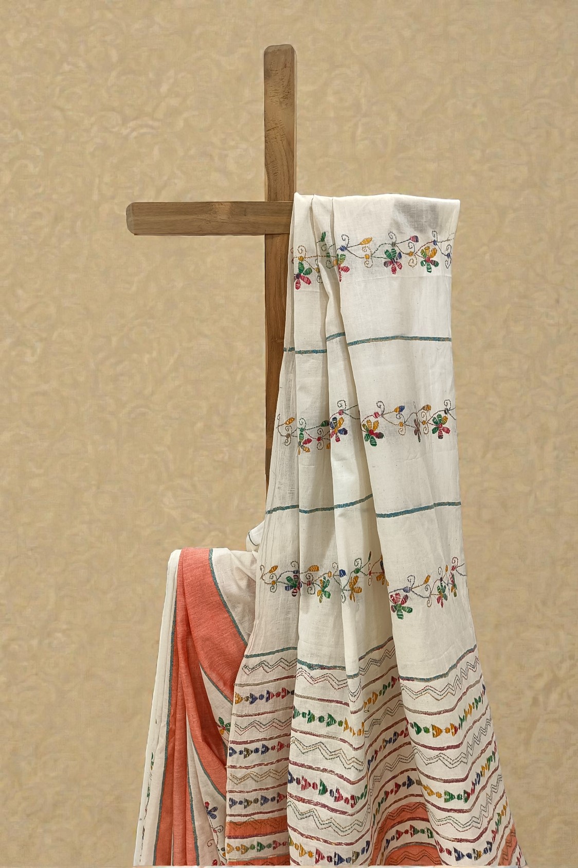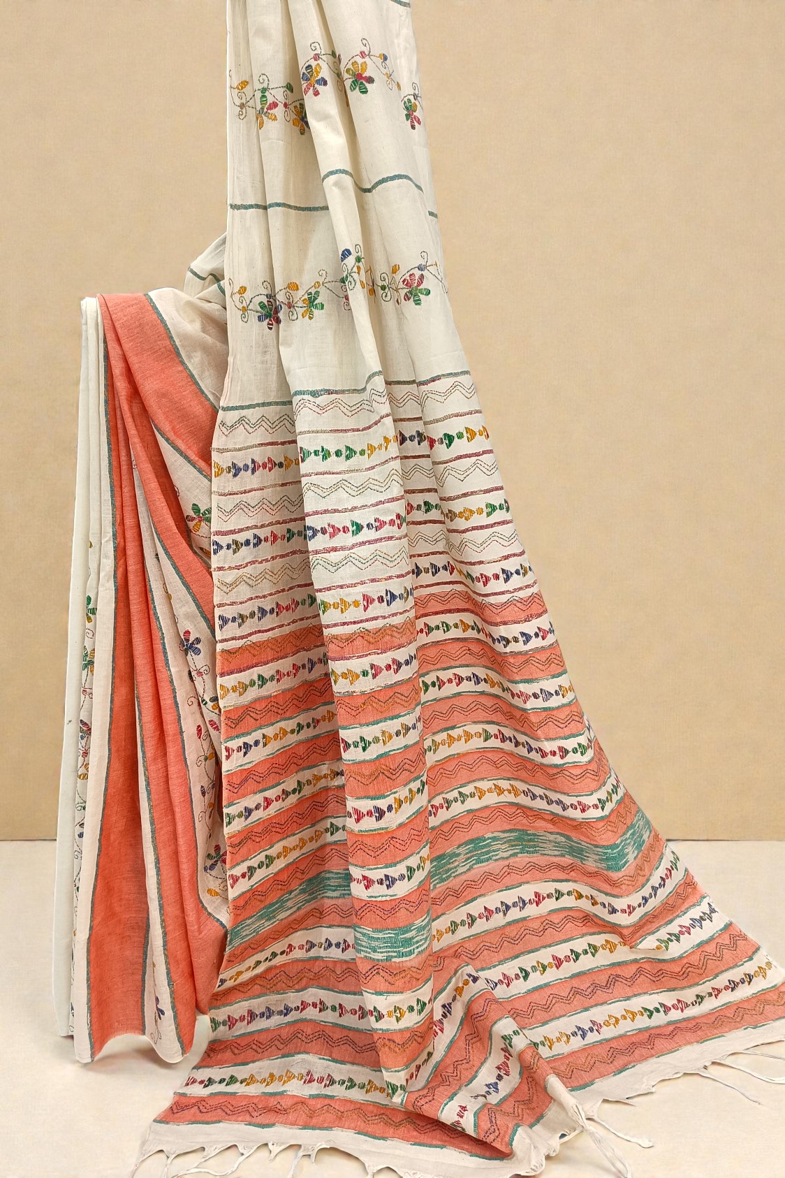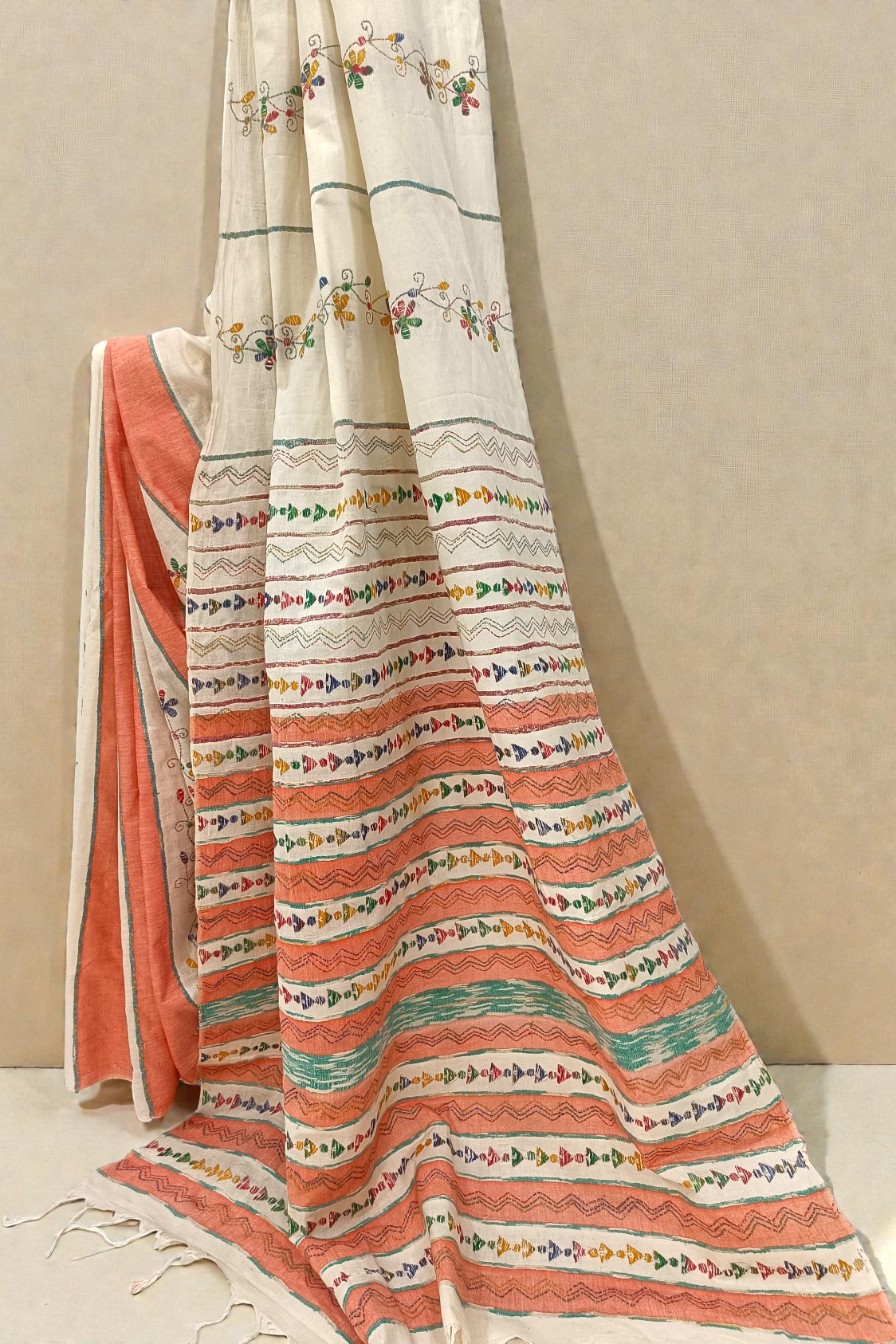 Ivory White and Light Orange Khesh Cotton Kantha embroidery Saree