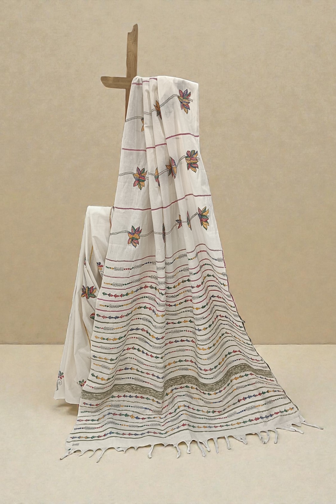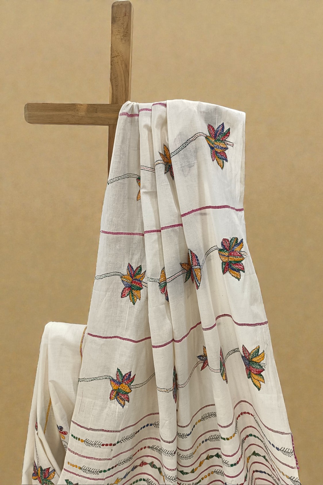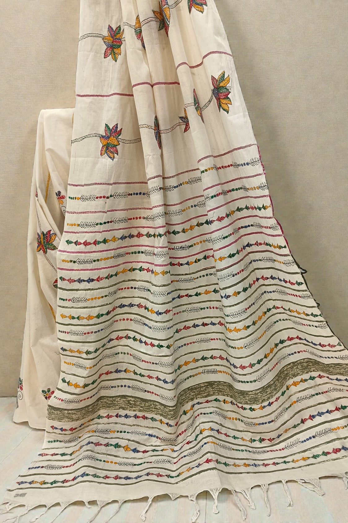 Ivory White Khesh Cotton Kantha embroidery Saree