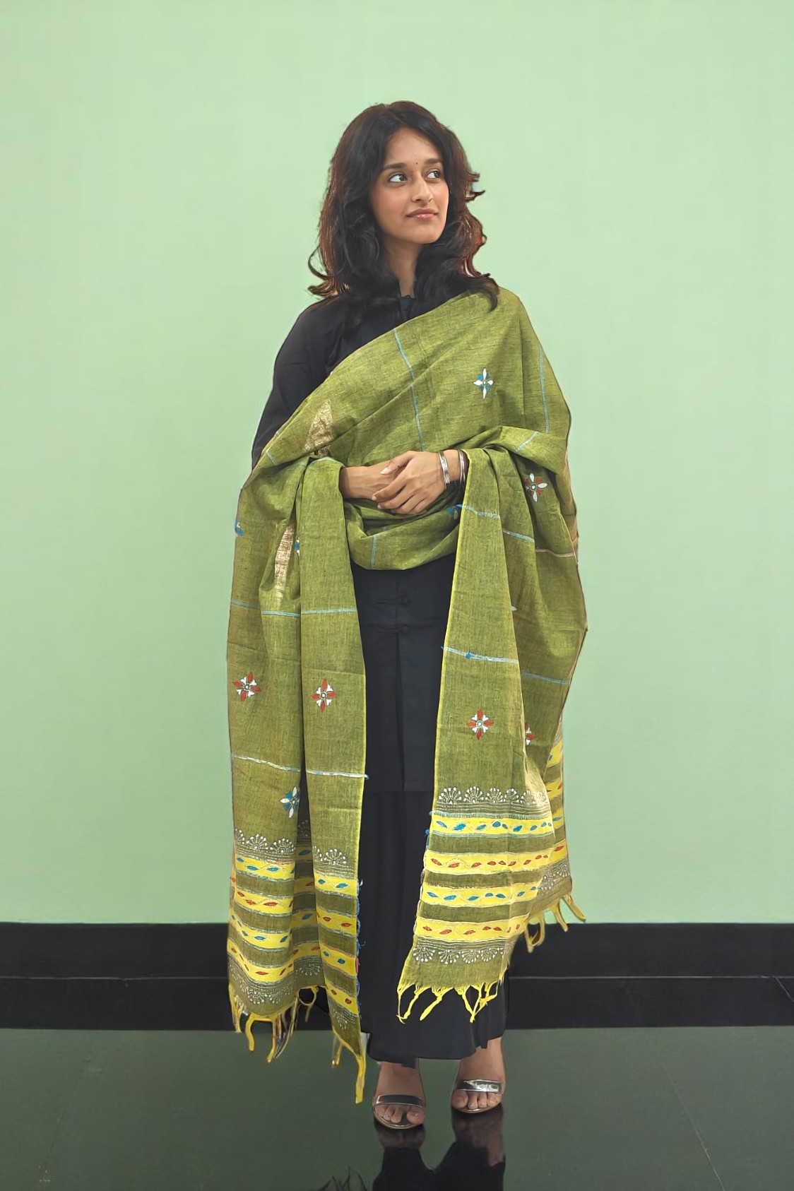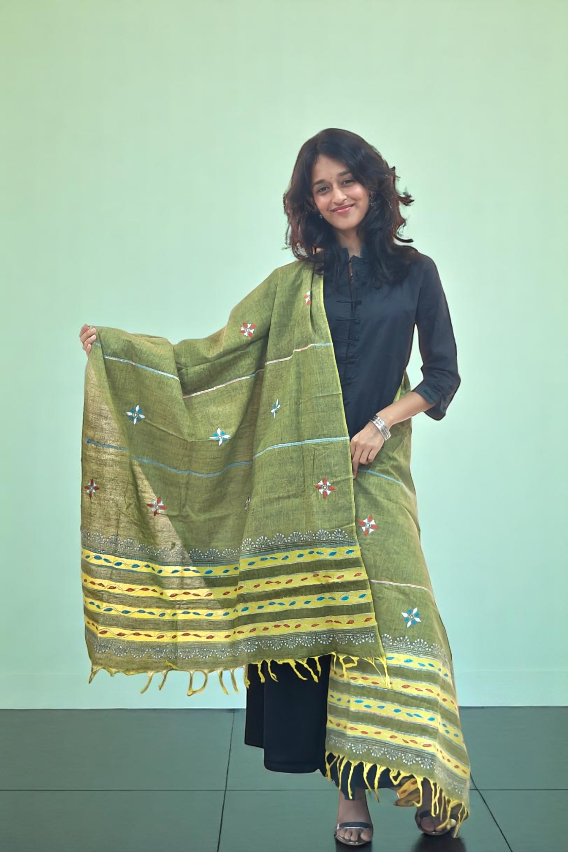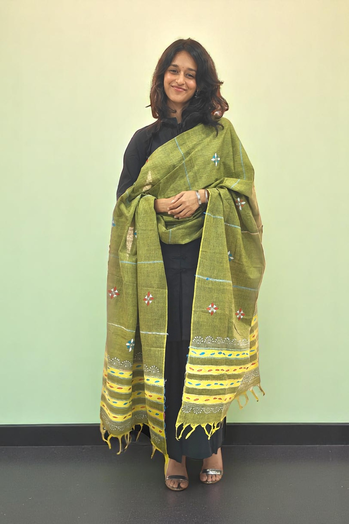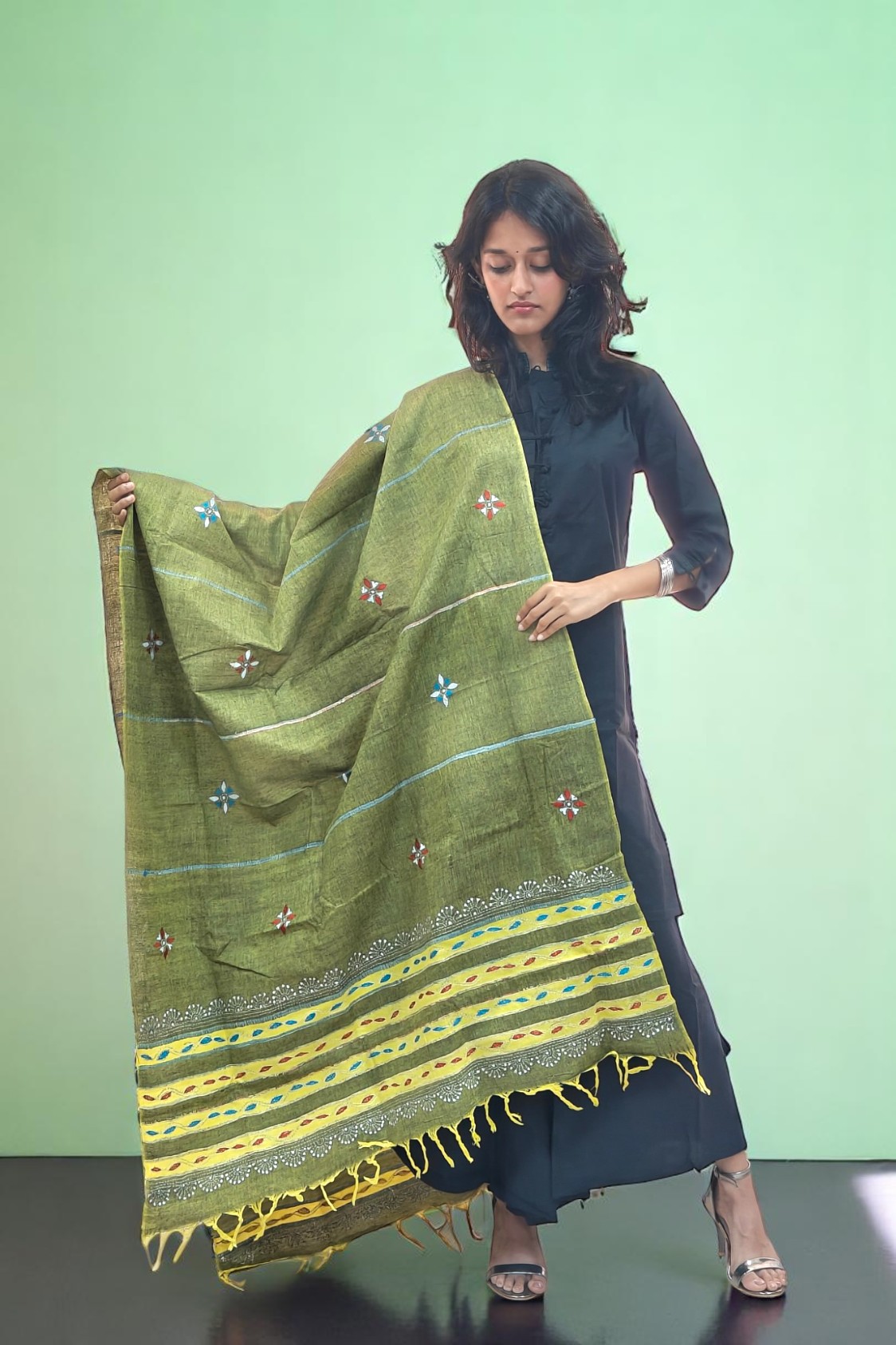 # Khaki Green Khesh cotton Kantha embroidery Dupatta