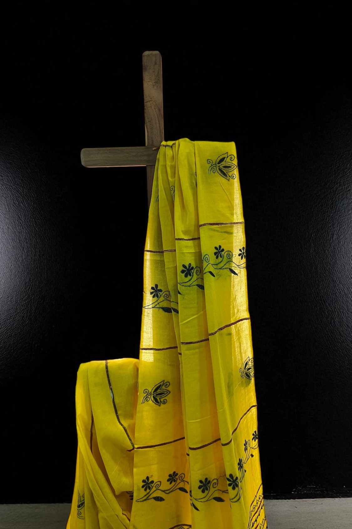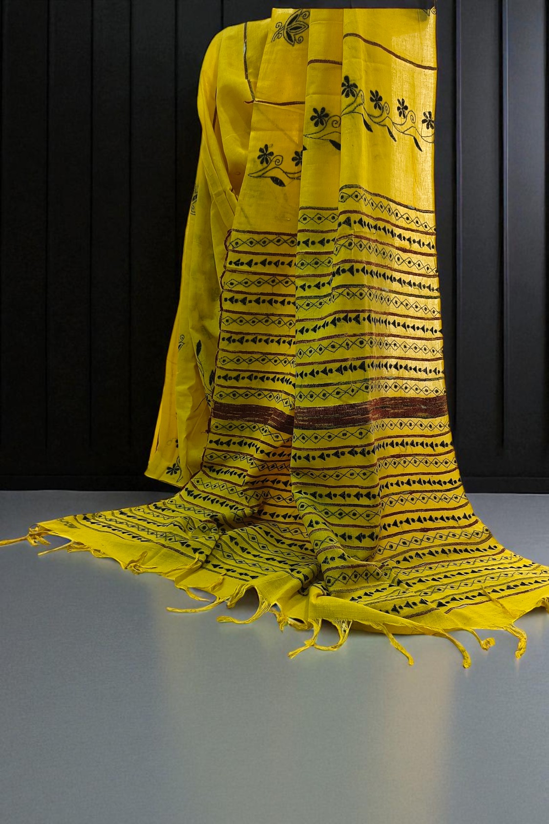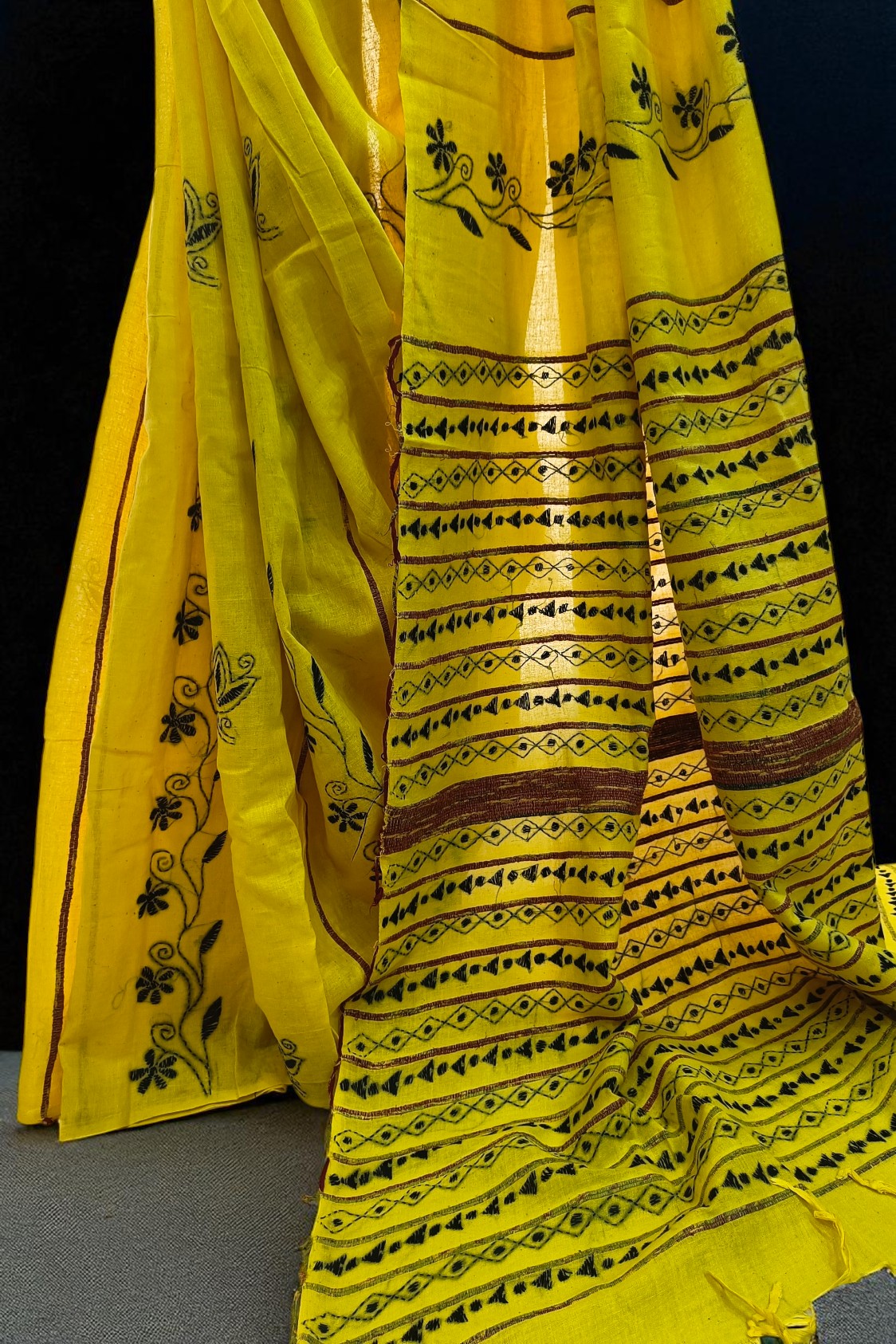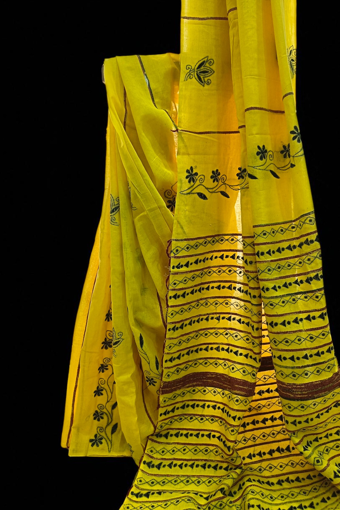 Home Sarees # Lemon Yellow Khesh cotton Kantha embroidery sari