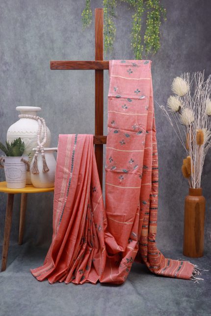 A beautiful Light Grey and white Khesh Cotton Sari with Multi-colour Floral and petals intricate Kantha Embroidery throughout the sari.