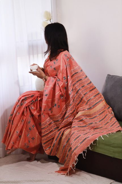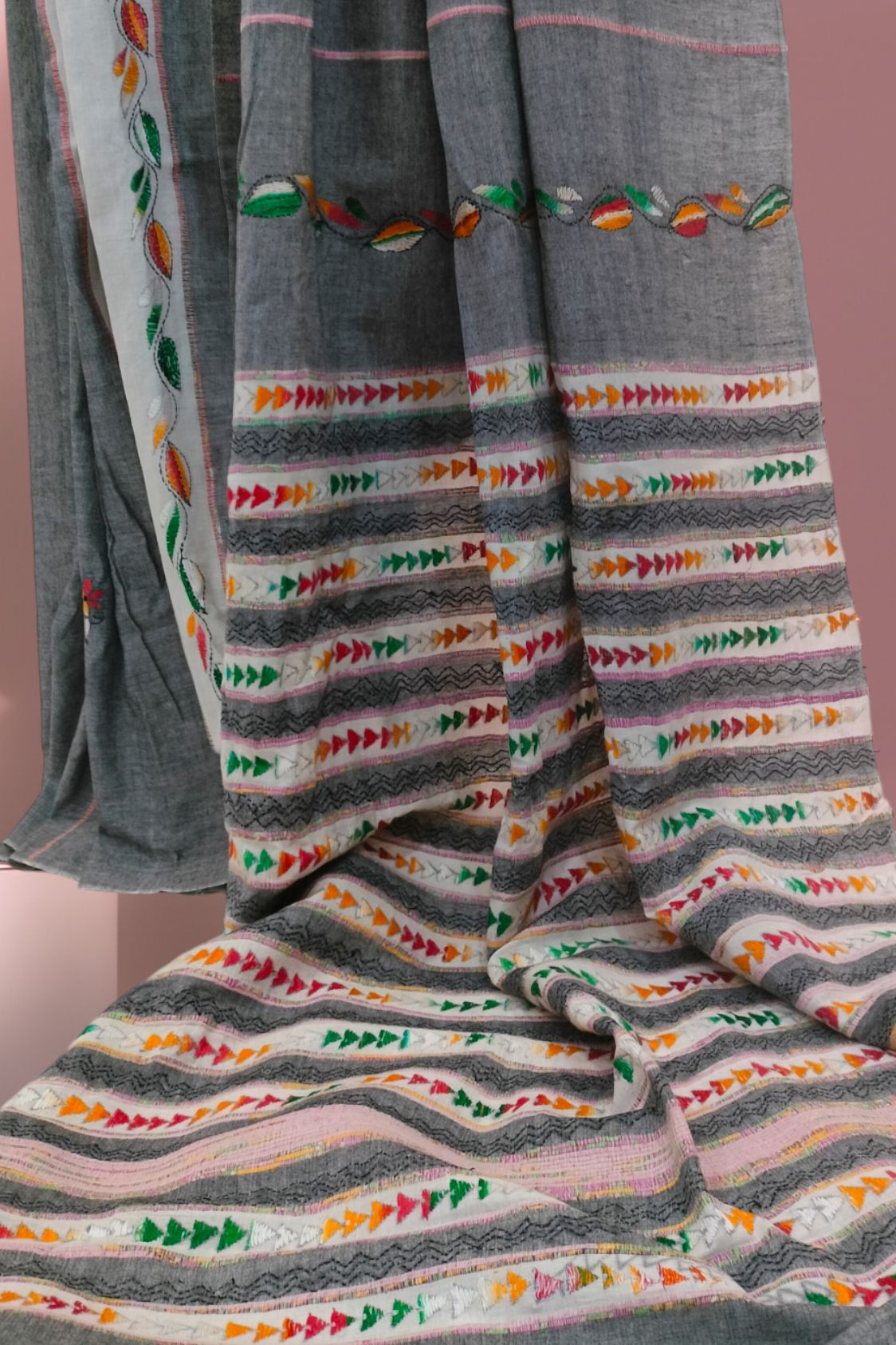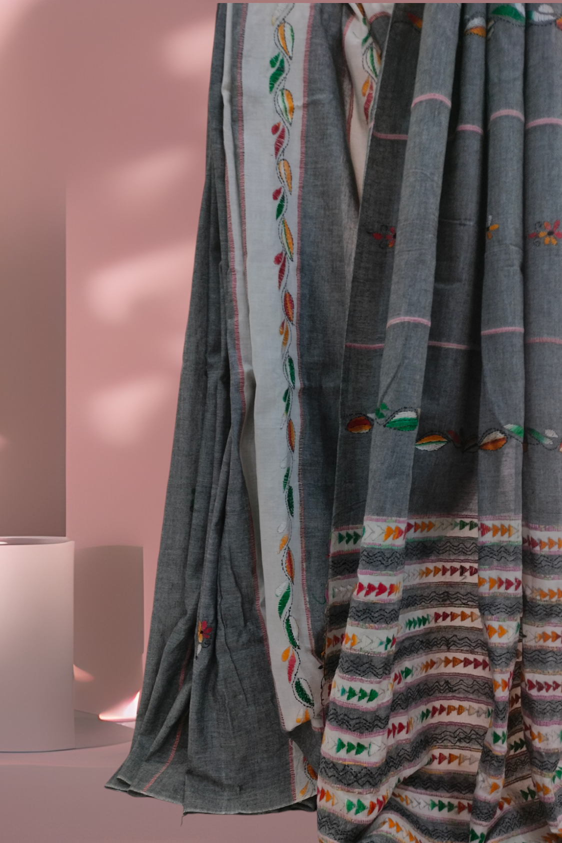 Grey and white Khesh Cotton Kantha Embroidery Sari