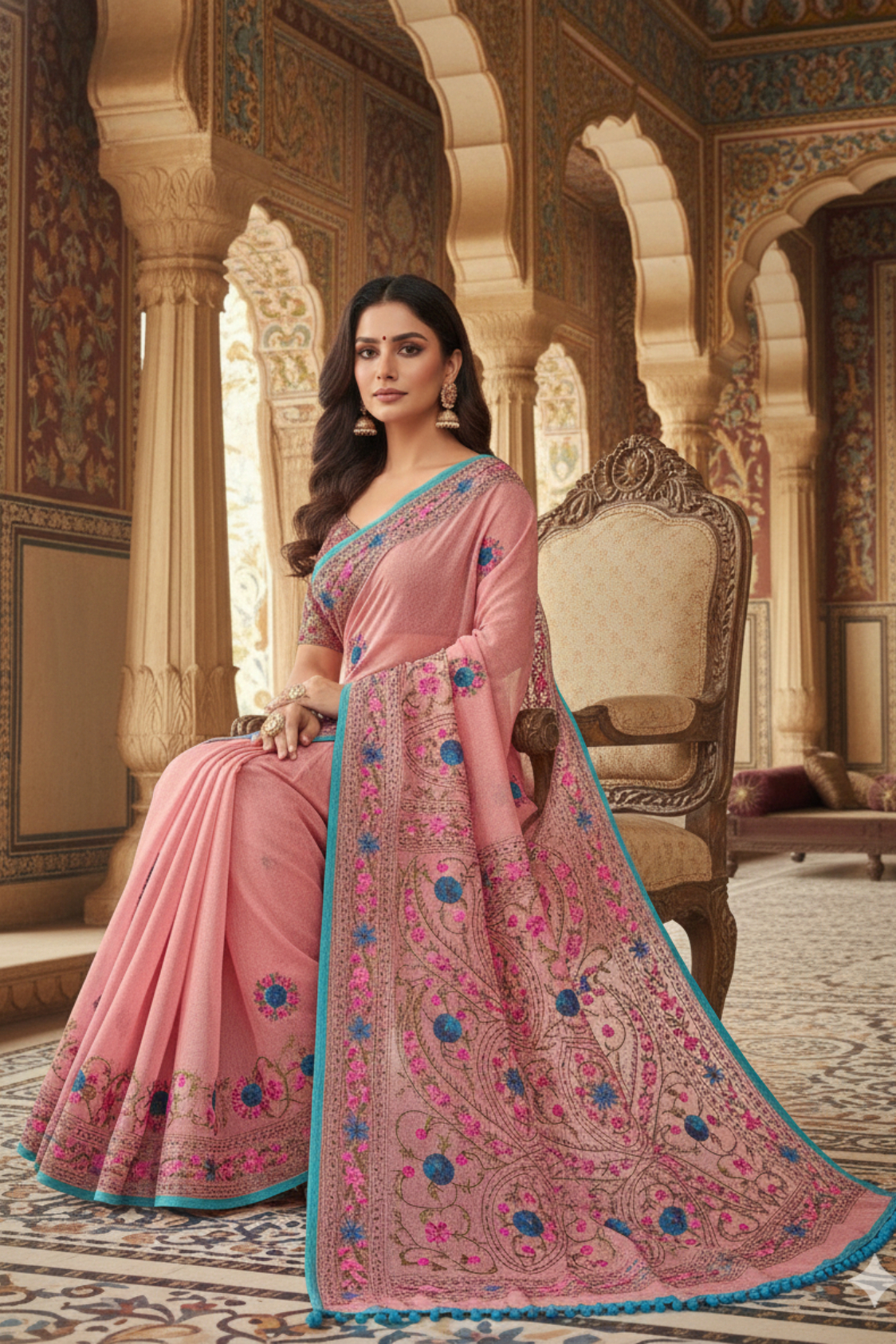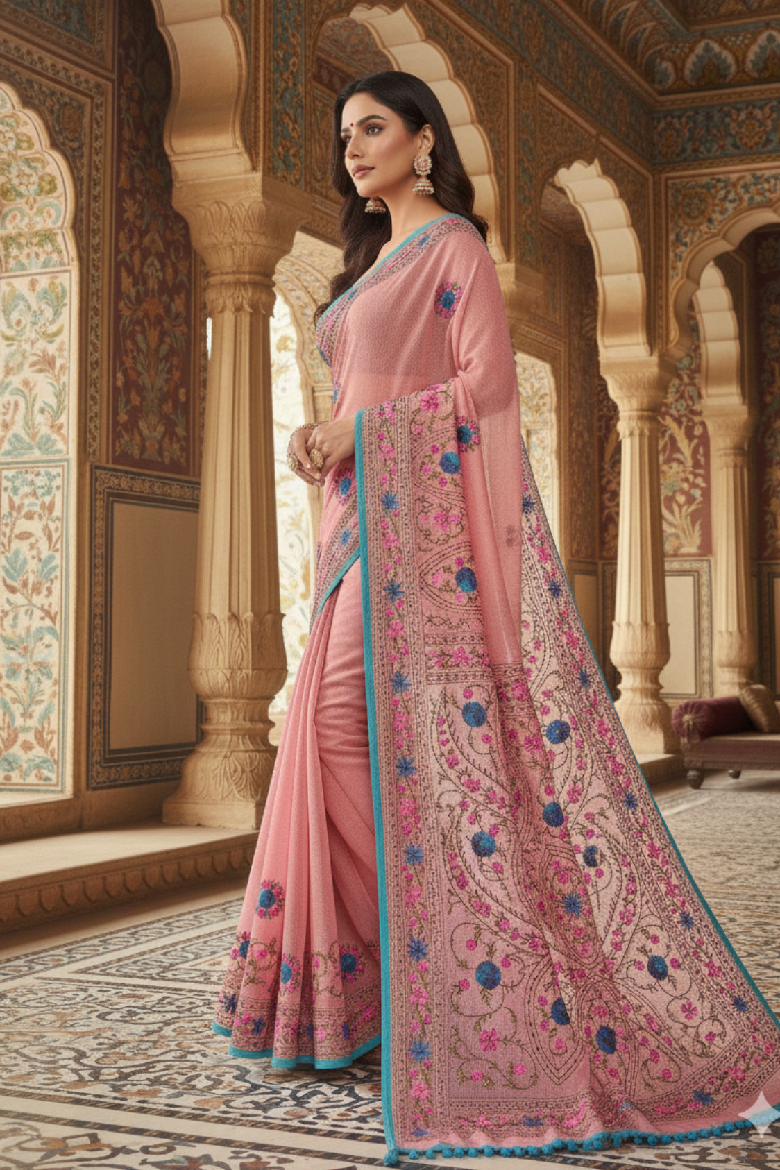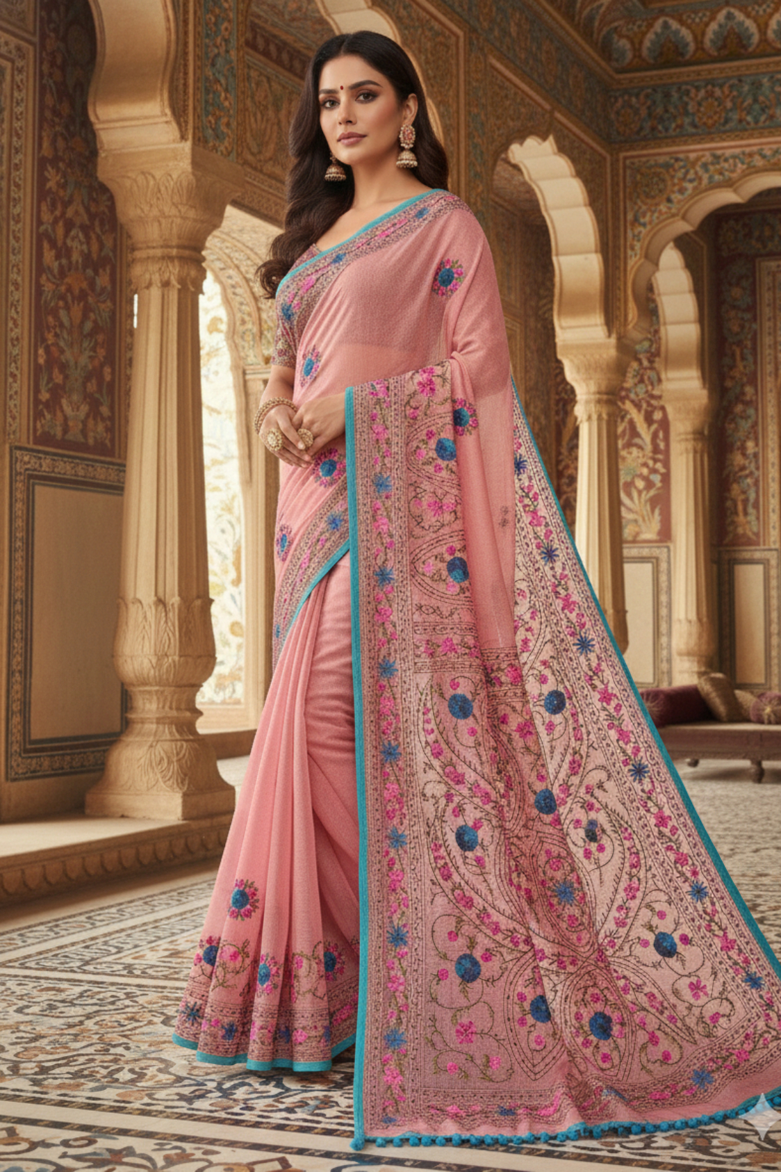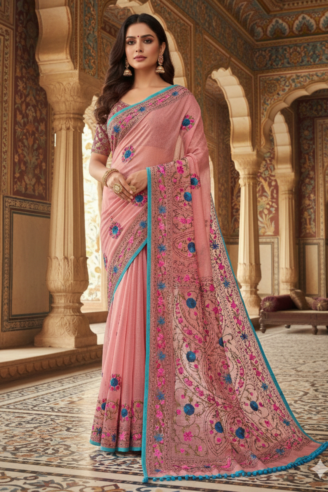 The lightweight flow, the refined color palette, and the rich hand-stitching make this saree an excellent choice for weddings, grand parties, festivals, or any joyous event where soft elegance and traditional vibrancy are desired.