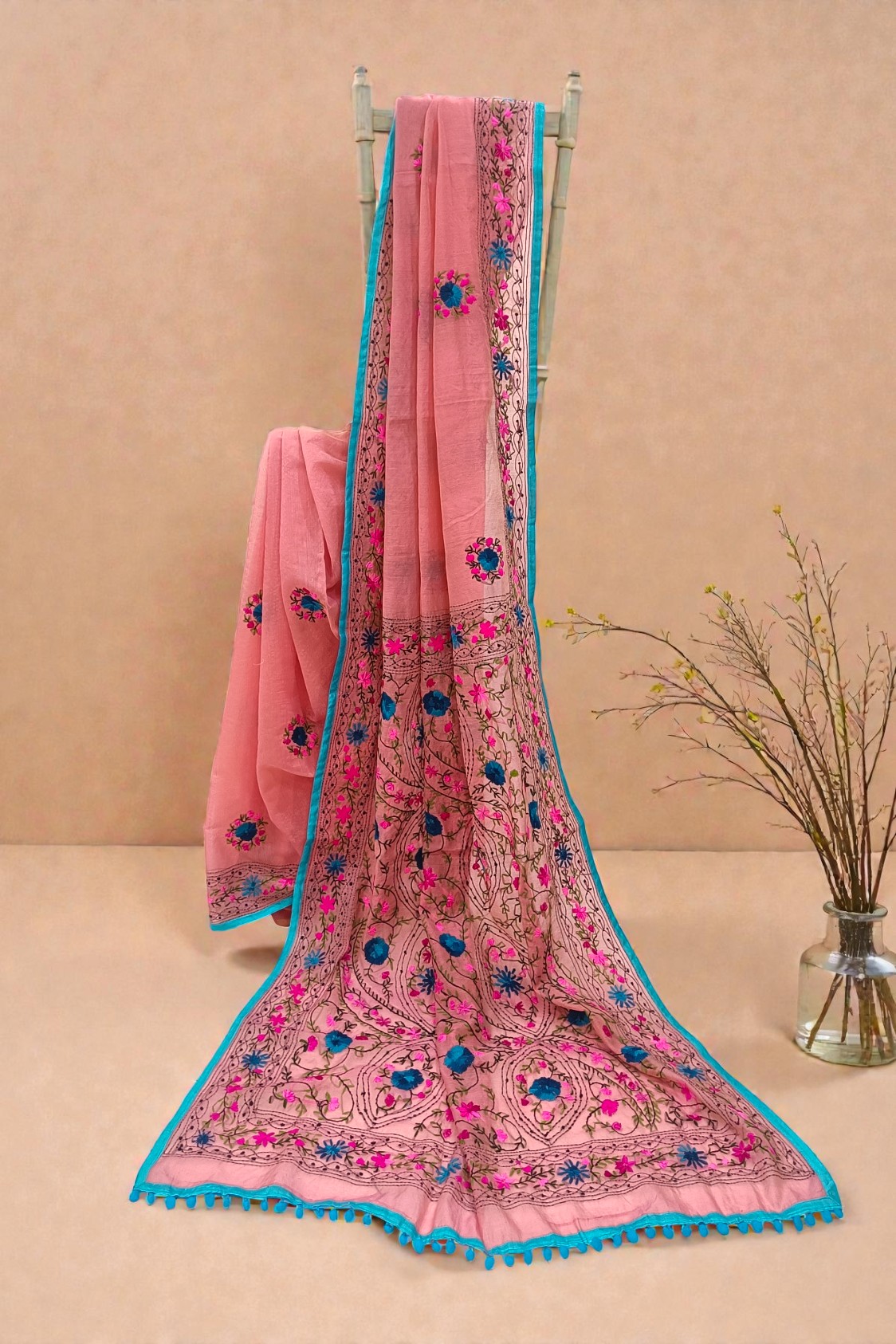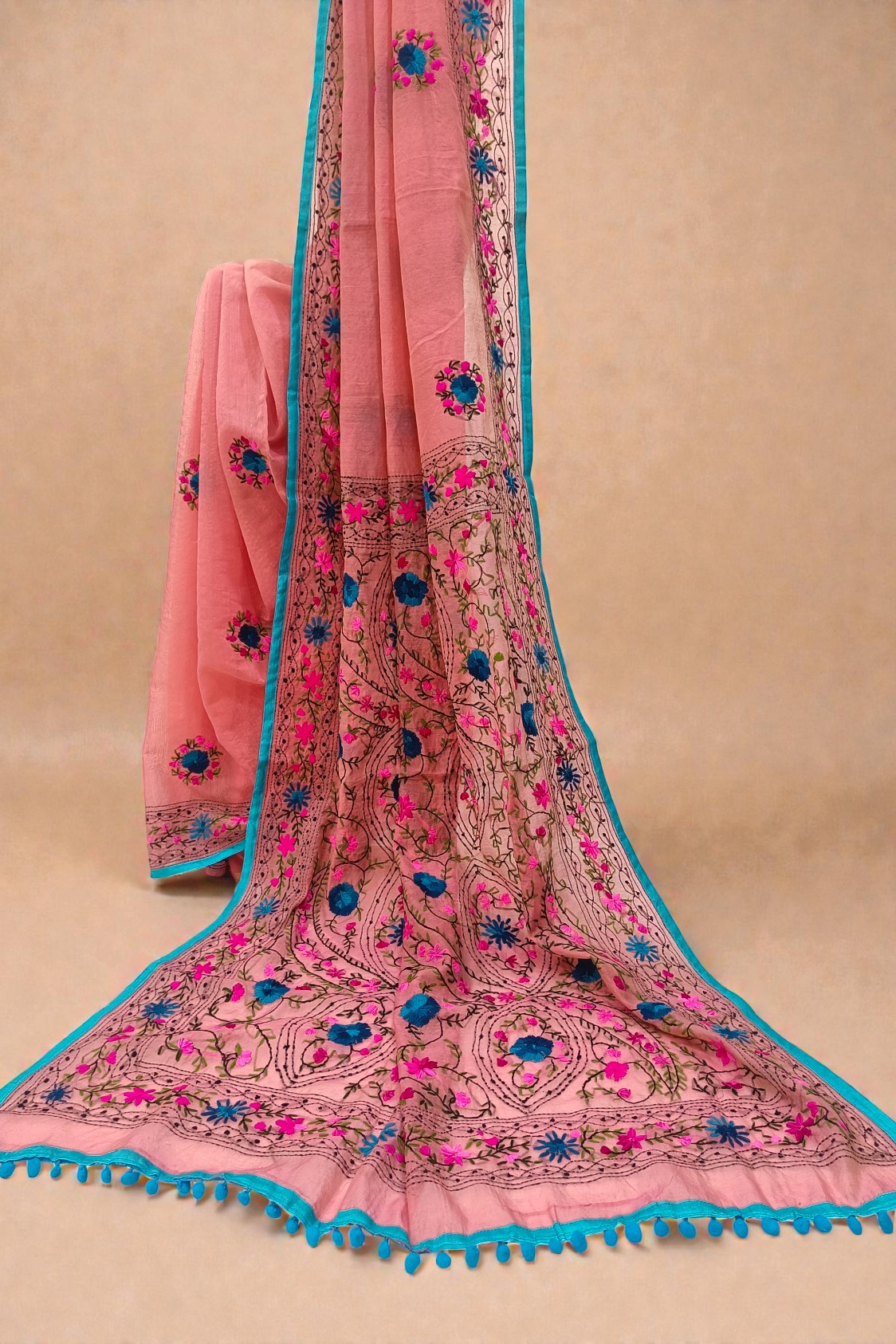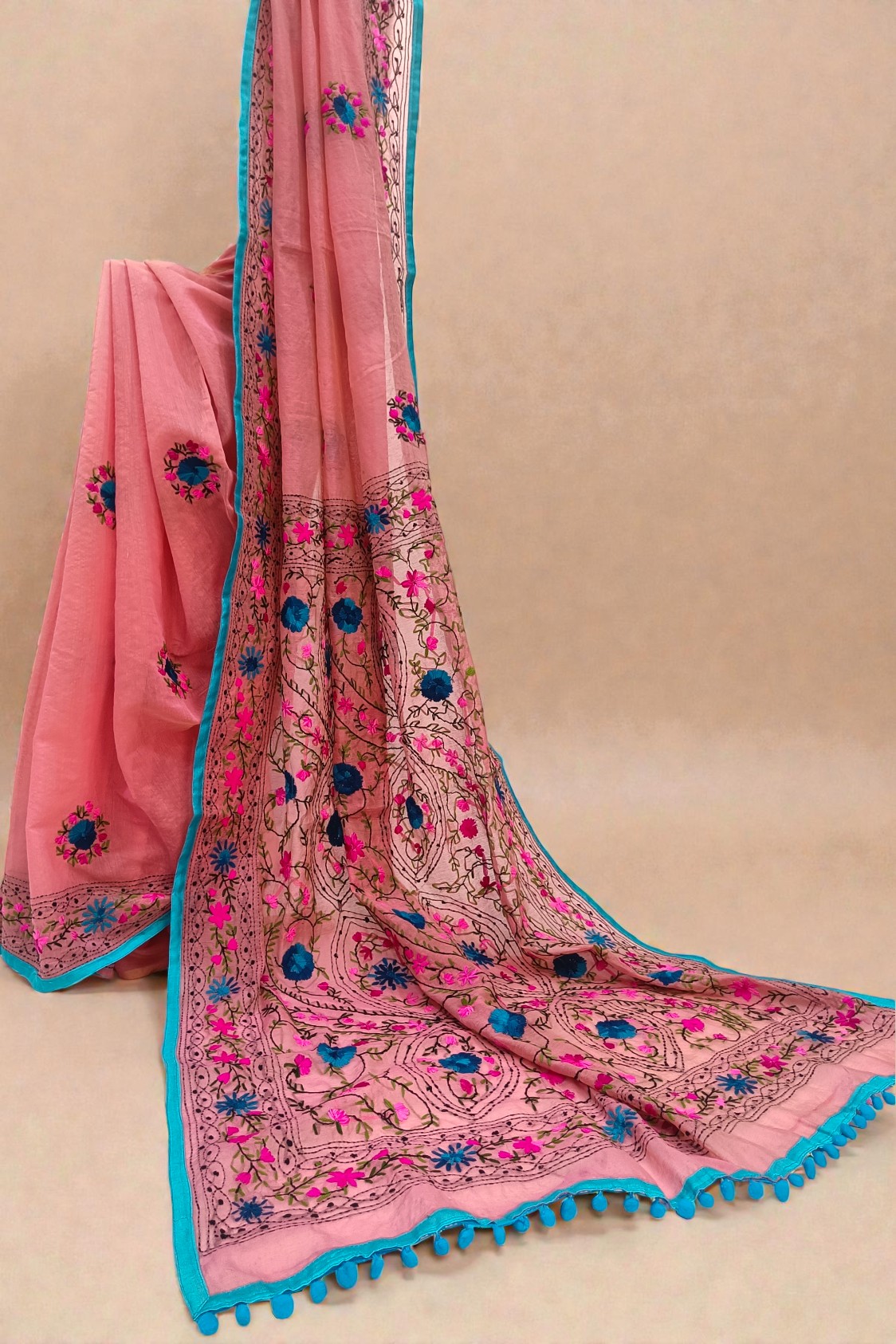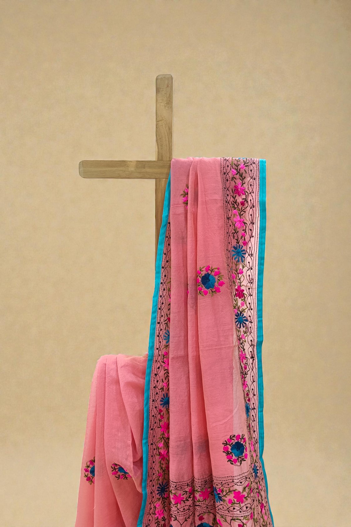 Light Pink Chanderi Cotton Silk Phulkari Saree