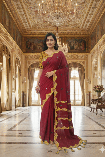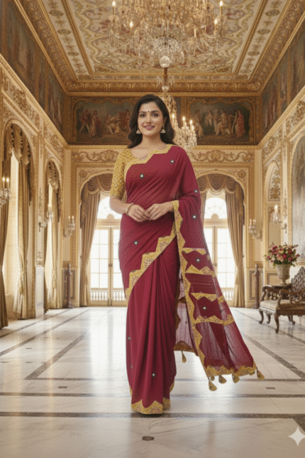 The rich embroidery and festive sheen make this saree an excellent choice for any party, wedding, or celebratory event. Drape yourself in tradition, luxury, and vibrant color that promises to turn heads.