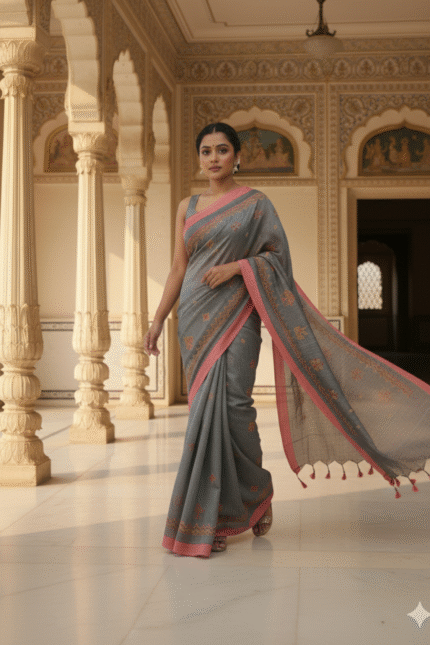 # Grey Cotton Kasuti Embroidery Saree