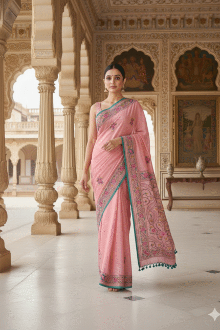 • Graceful Body: The rest of the saree body is beautifully balanced with floral ‘butis’ (small motifs) that are evenly spread, adding continuity and charm without overpowering the delicate silk base.