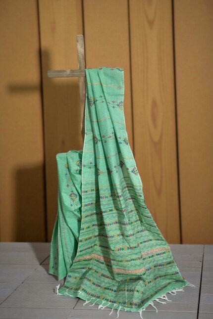 Sea Green Khesh Cotton Kantha embroidery Saree
