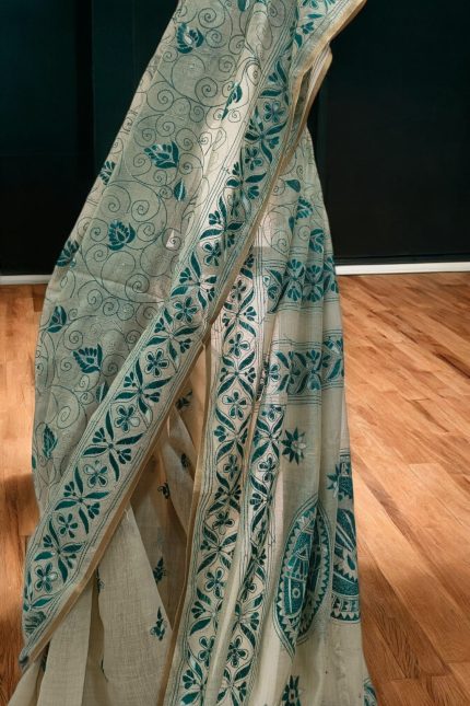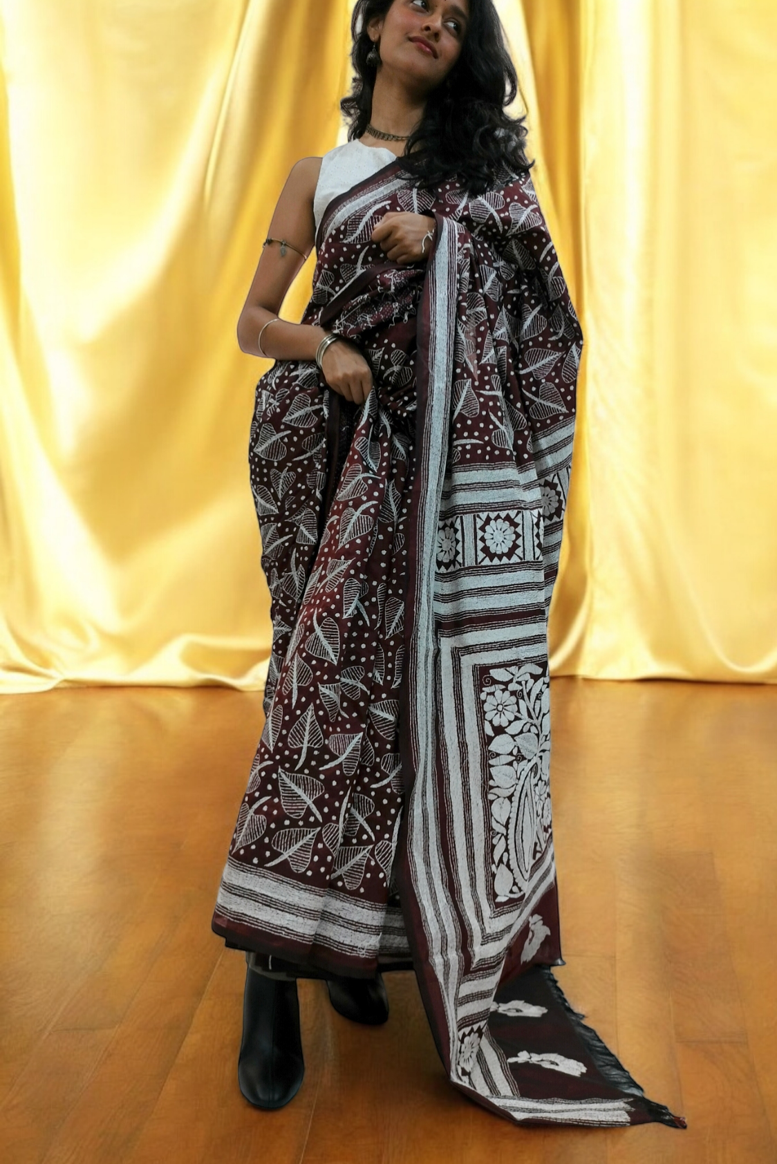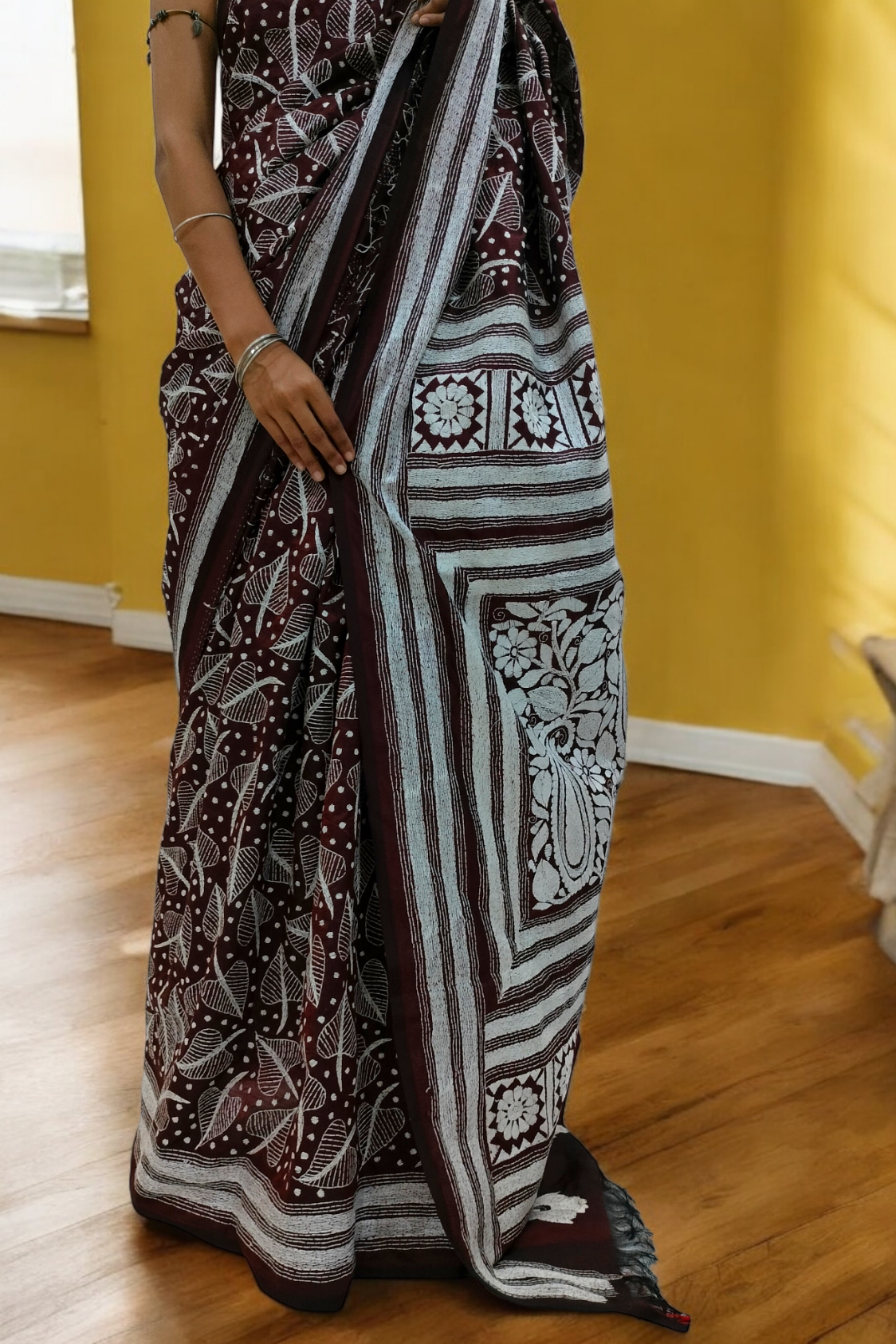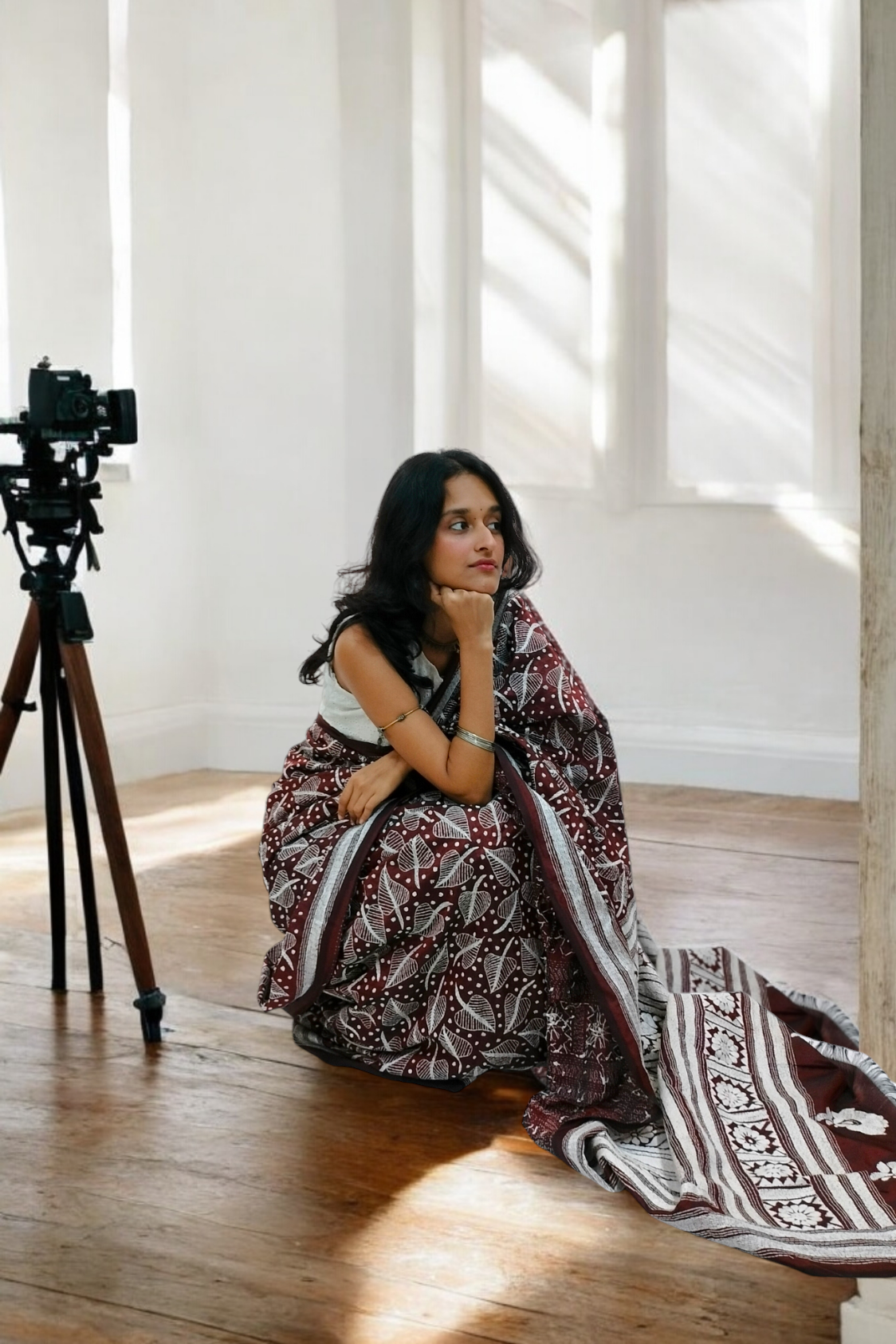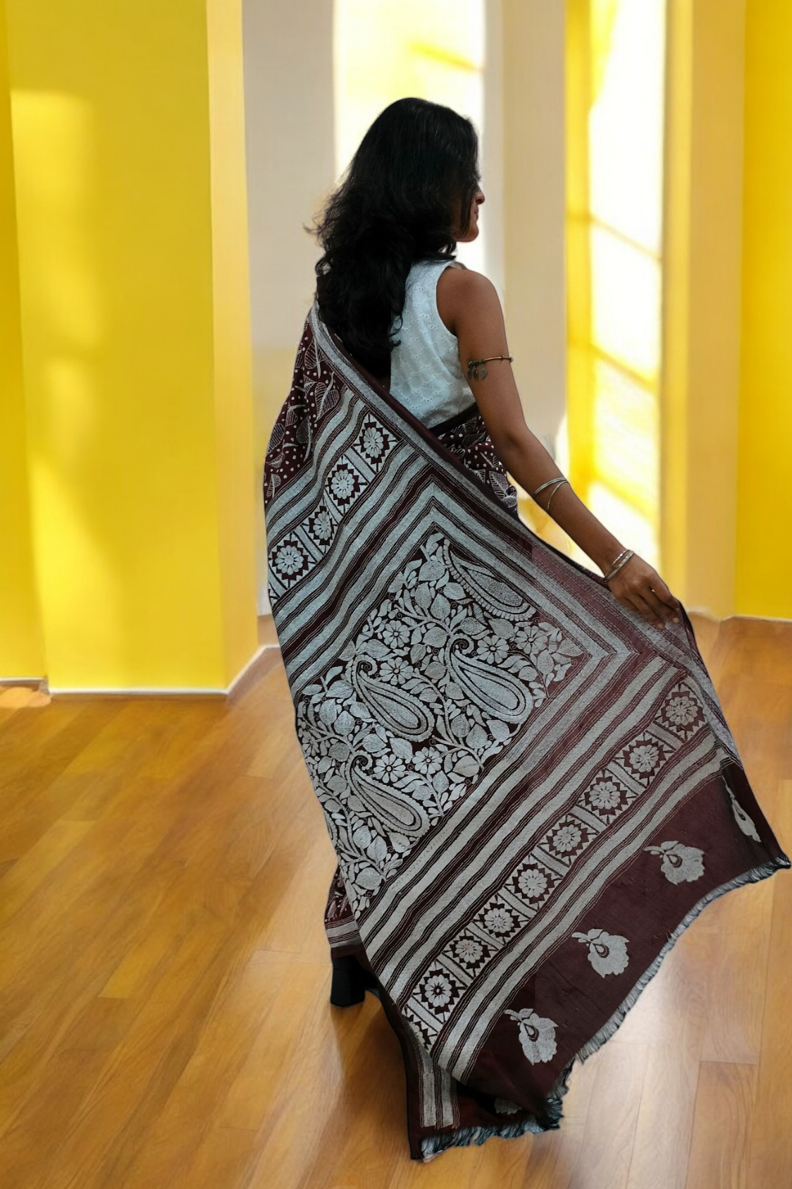 A beautiful Maroon Semi Silk Kantha Embroidery Saree with its intricate leaf motif design throughout the saree. The sari comes with a running blouse piece with Kantha embroidery border.