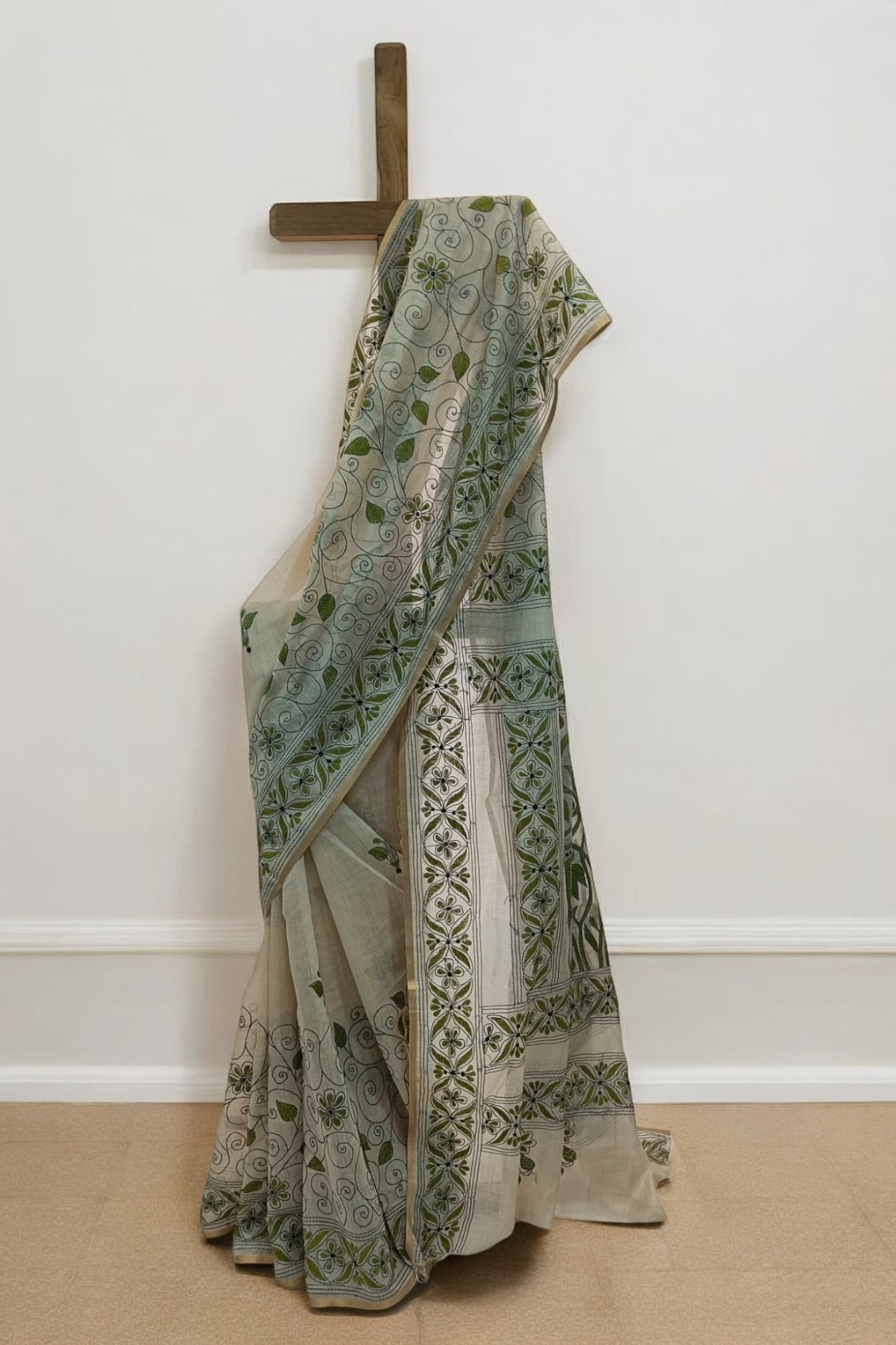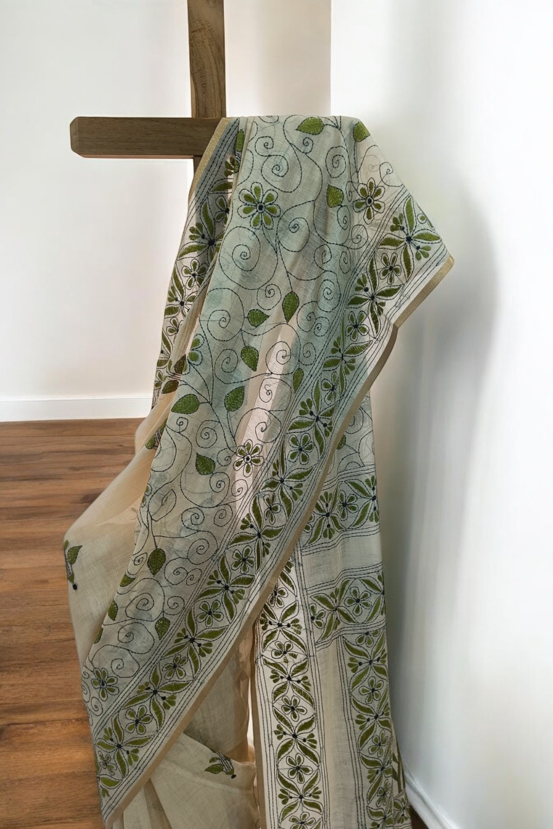 This is an exquisitely crafted Off-white Chanderi Cotton-silk saree with Intricate Olive green Kantha Embroidery. The sari comes with a running blouse piece with Kantha embroidery border for sleeves.
