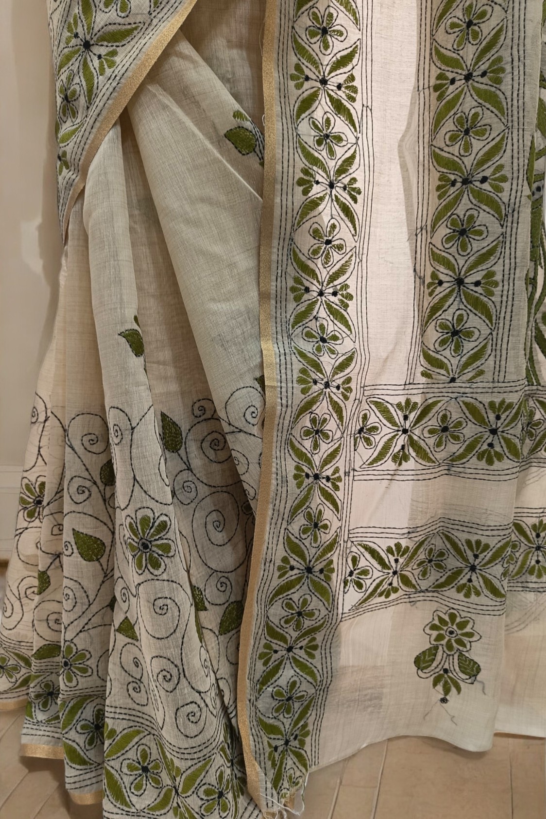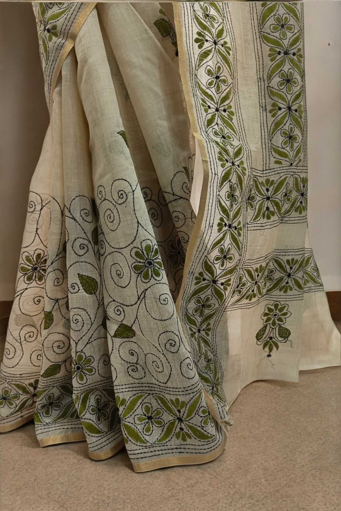 Off-White Chanderi Cotton-Silk with Olive Green Kantha Embroidery Saree