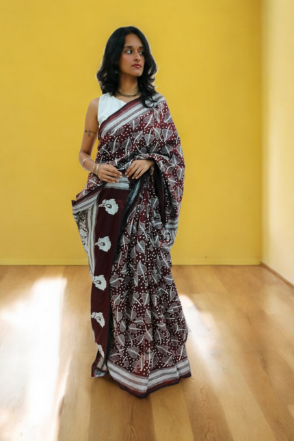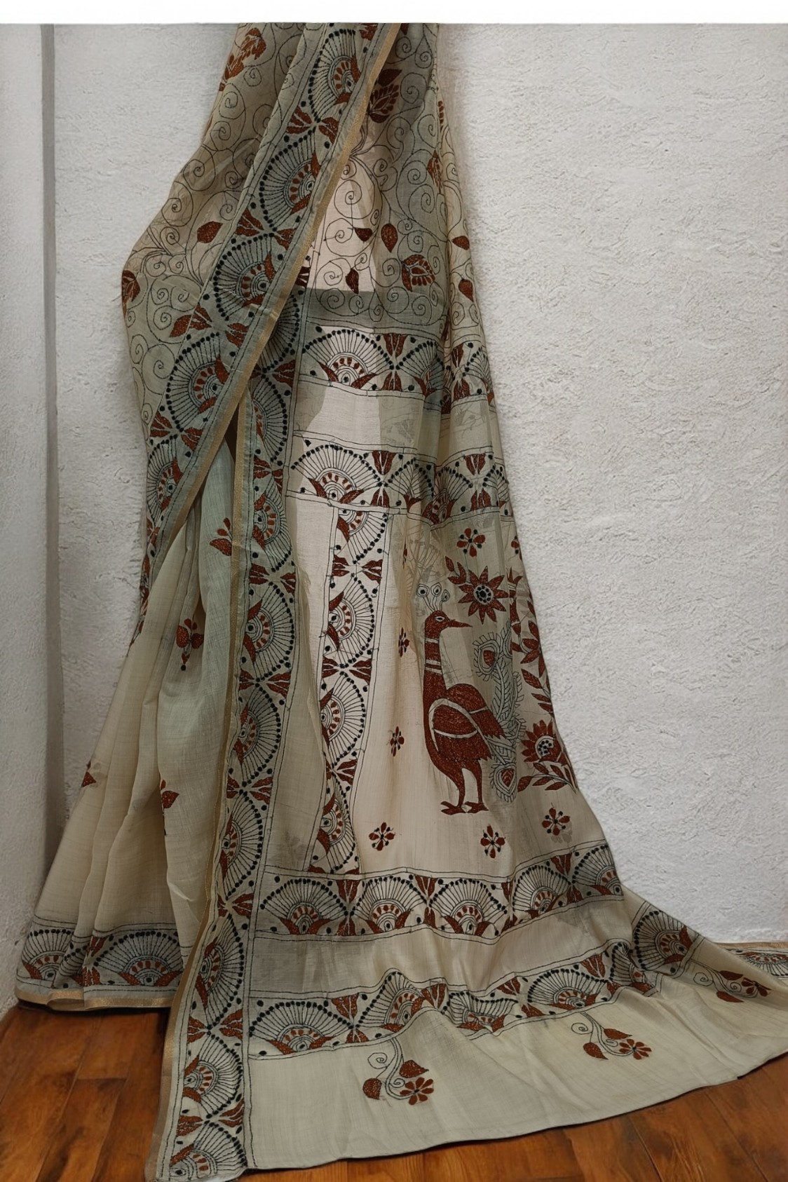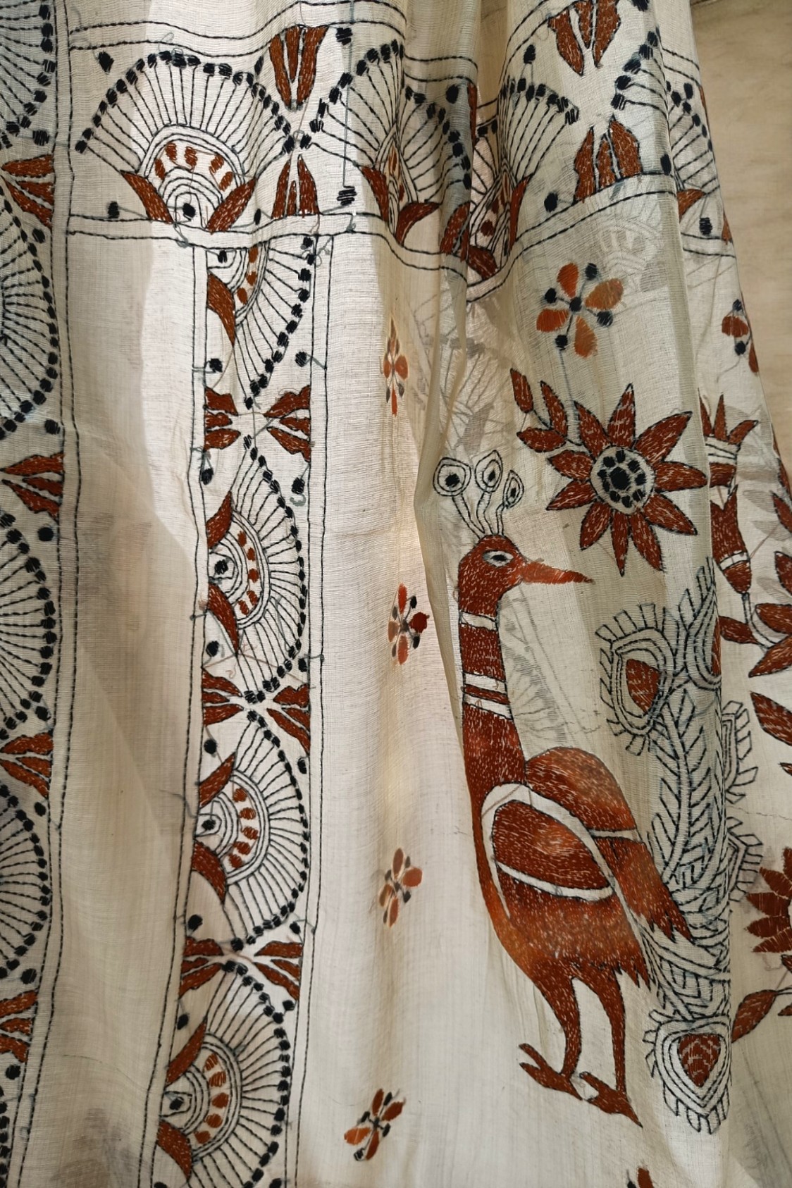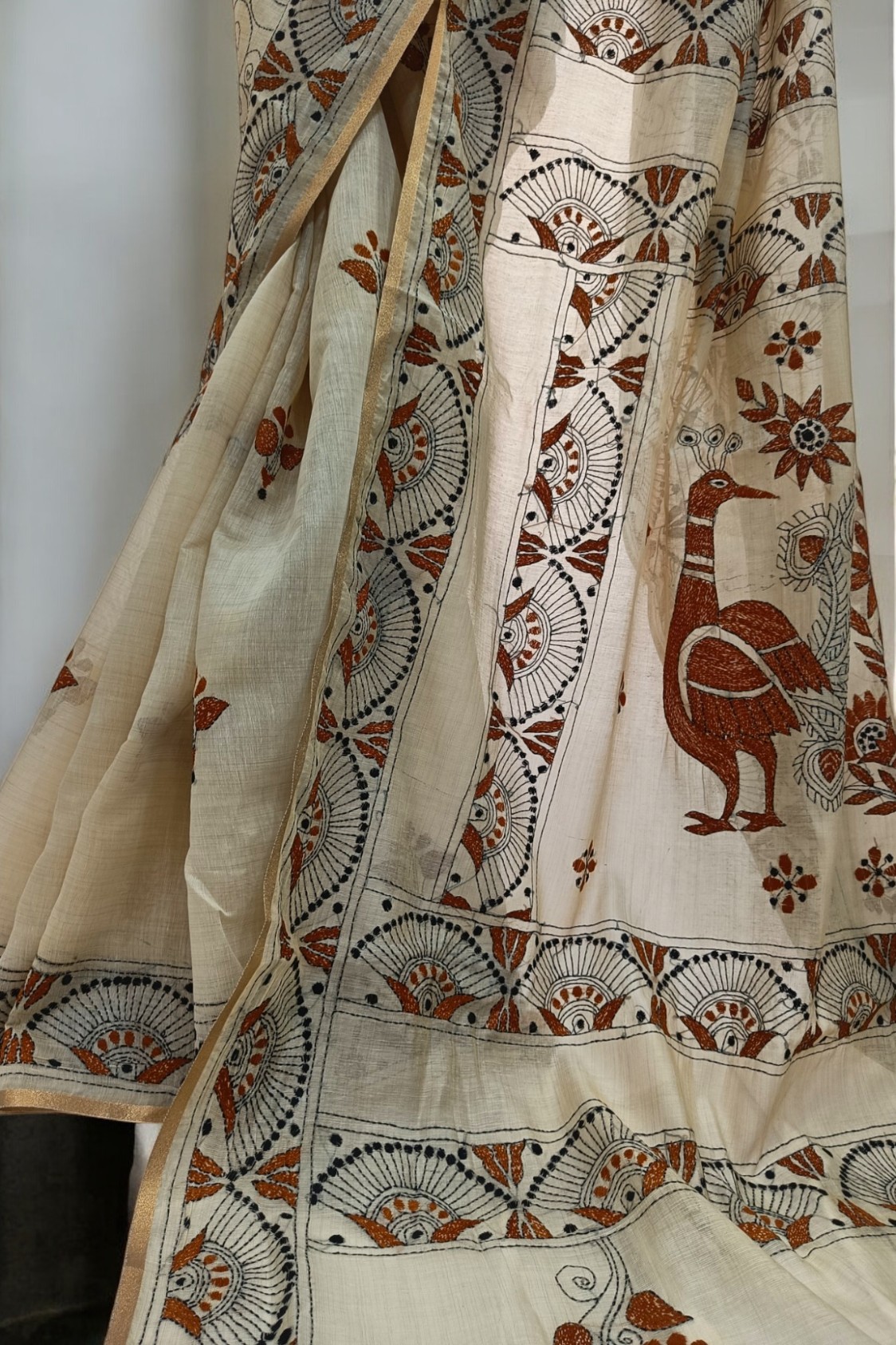 This is an exquisitely crafted Off-white Chanderi Cotton-silk saree with Intricate Brown Kantha Embroidery. The sari comes with a running blouse piece with Kantha embroidery border for sleeves.