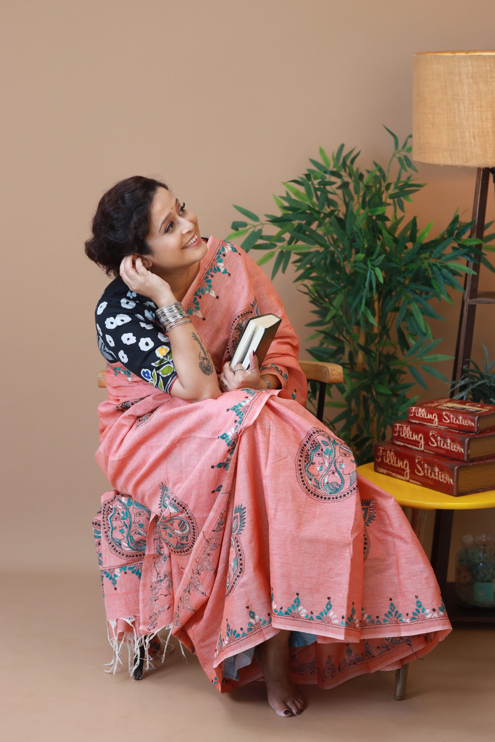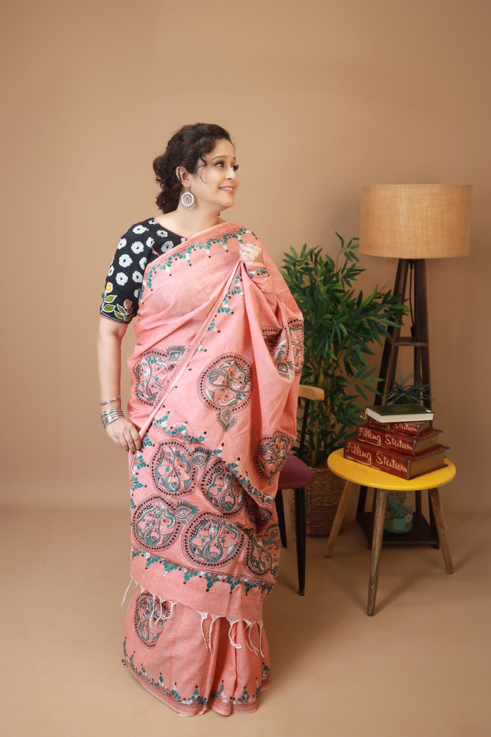 A beautiful Peach Radha Krishna cotton sari with intricate kantha embroidery of Radha Krishna Motif throughout the sari. The sari comes with a running blouse piece with kantha embroidery border.