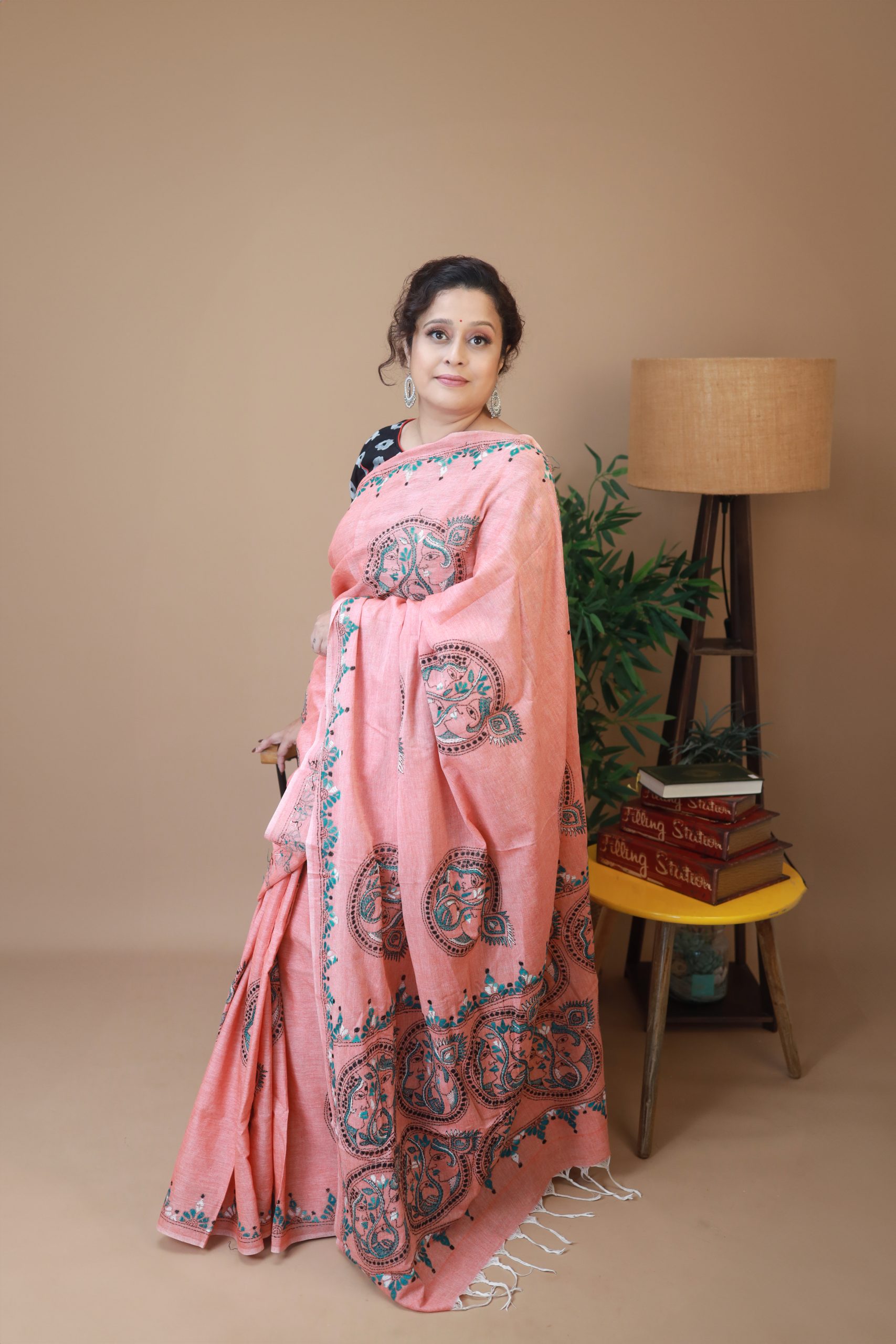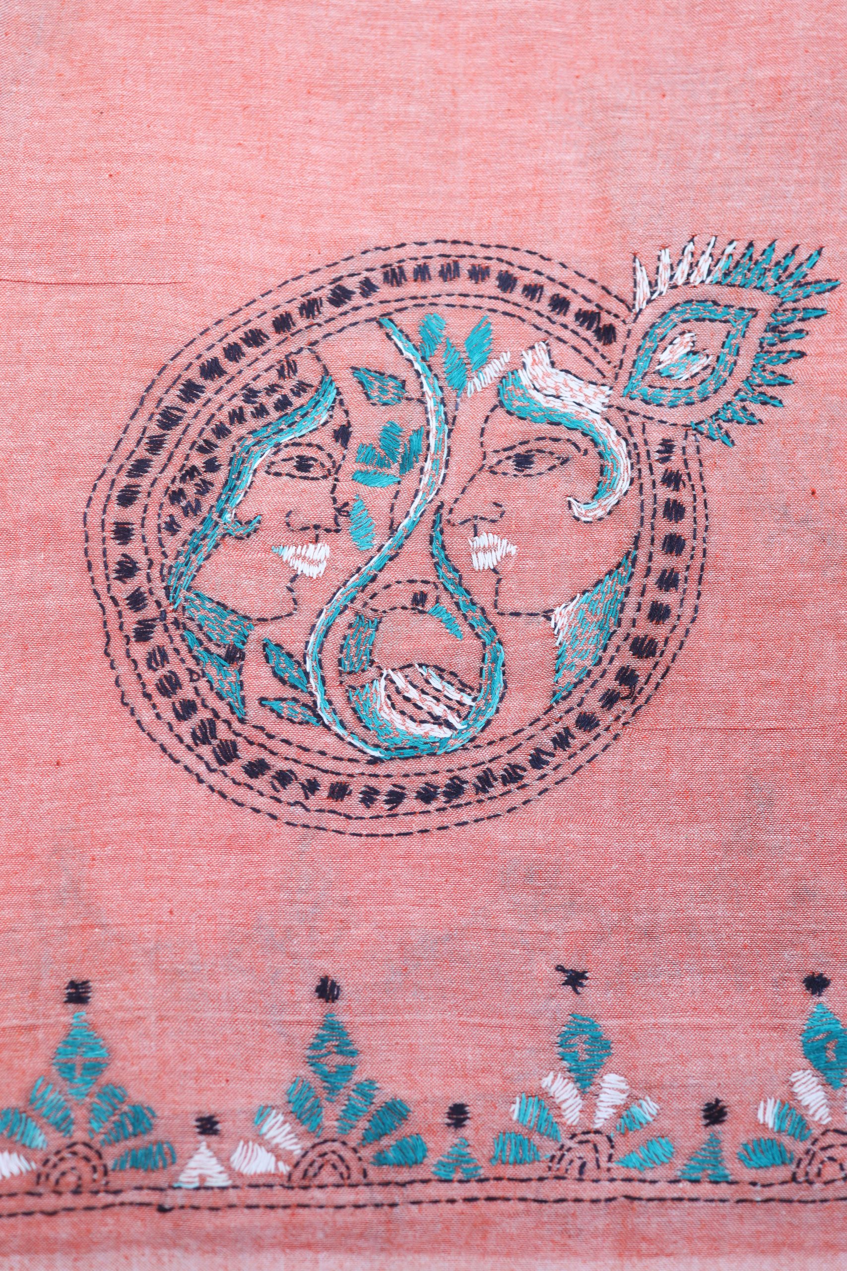 Peach Cotton Radha Krishna Kantha Embroidery Sari