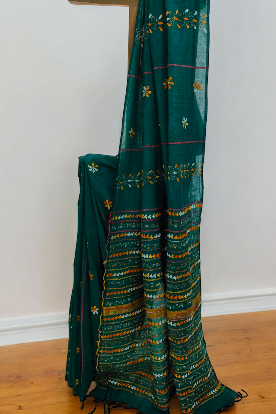 A beautiful Pine Green Khesh cotton sari with intricate kantha embroidery throughout the body and palla.