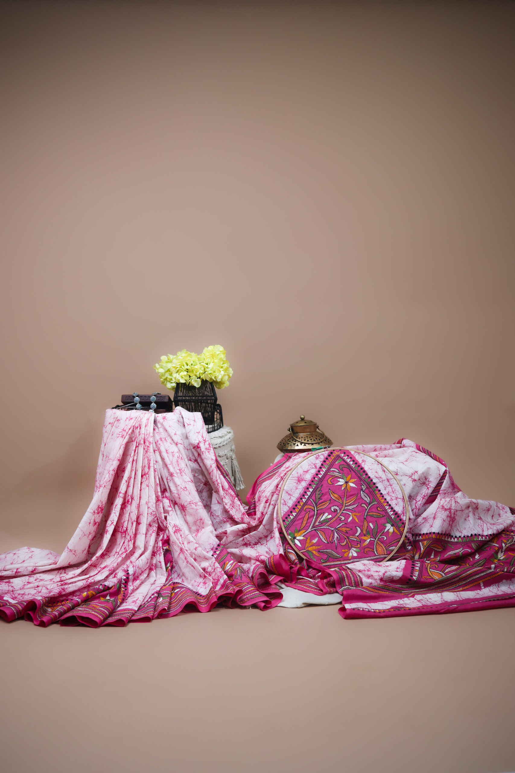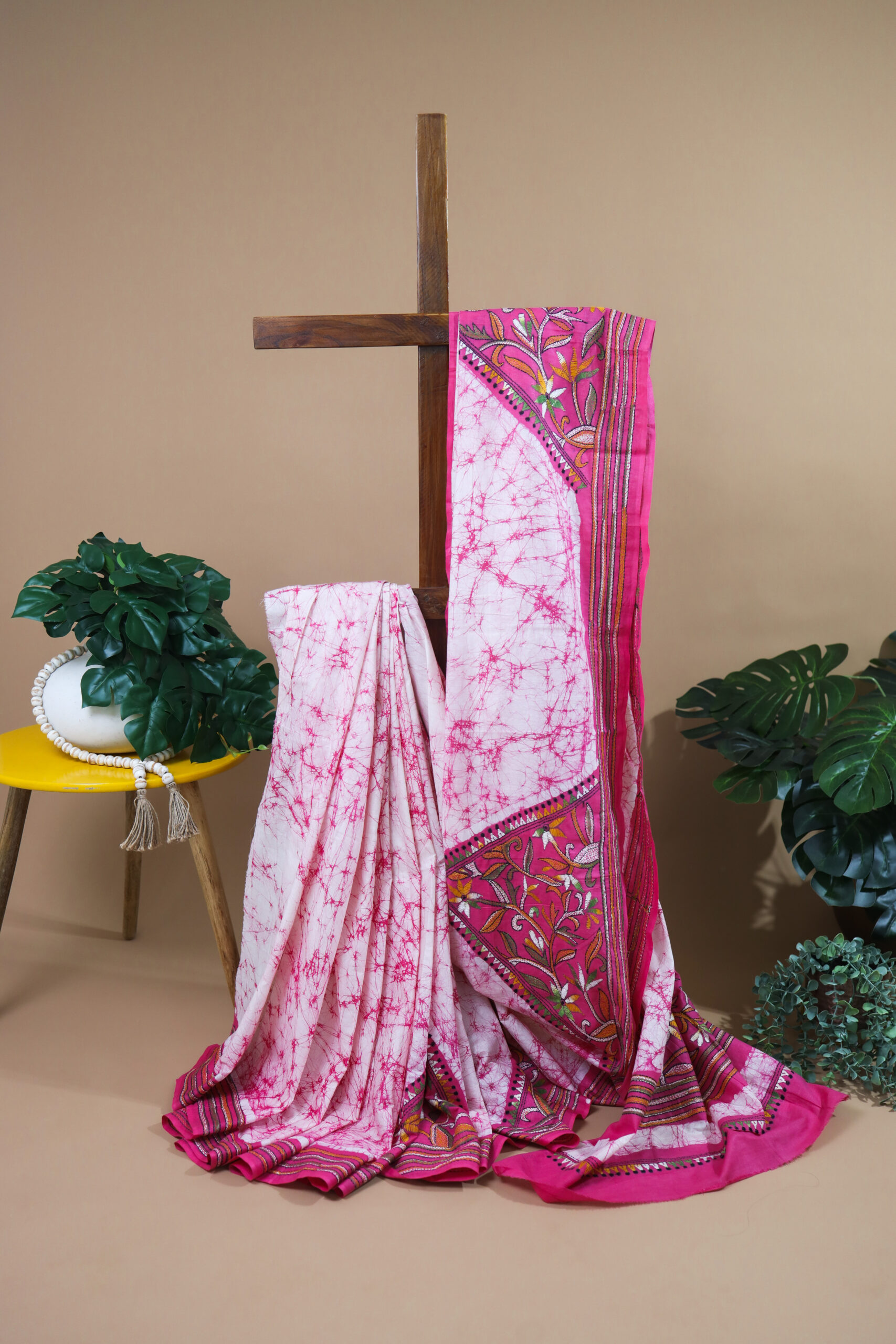 Home Cotton Batik Pink and white cotton batik Kantha embroidery saree