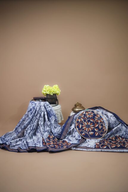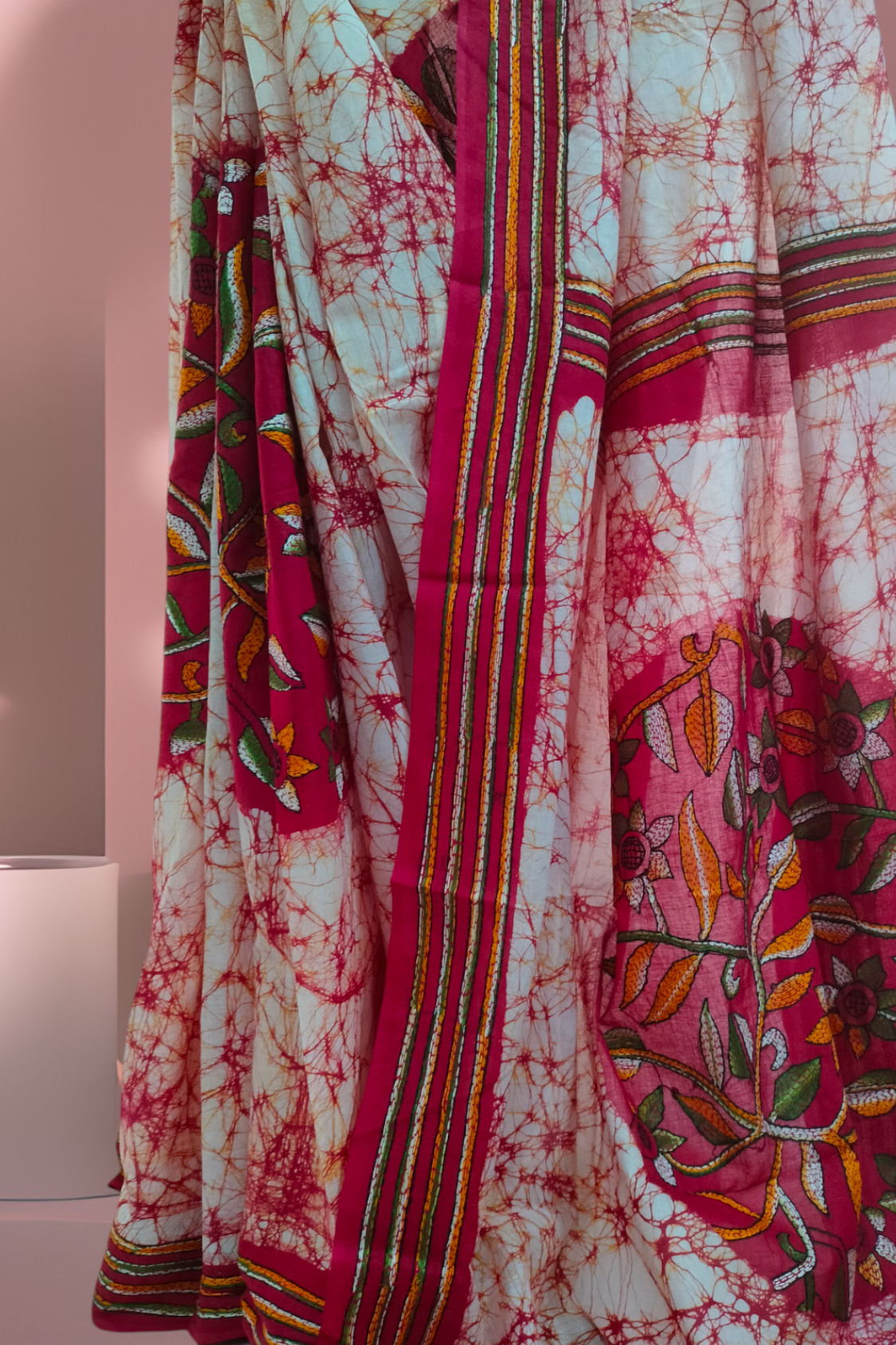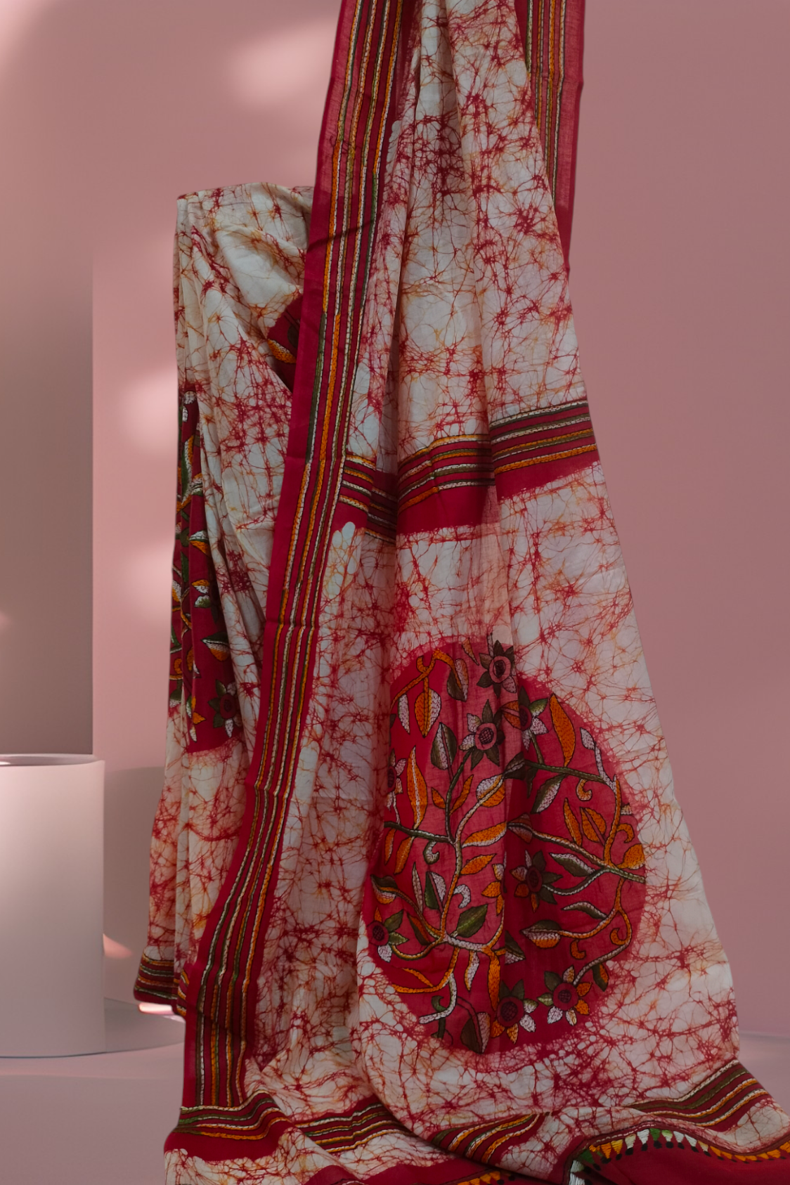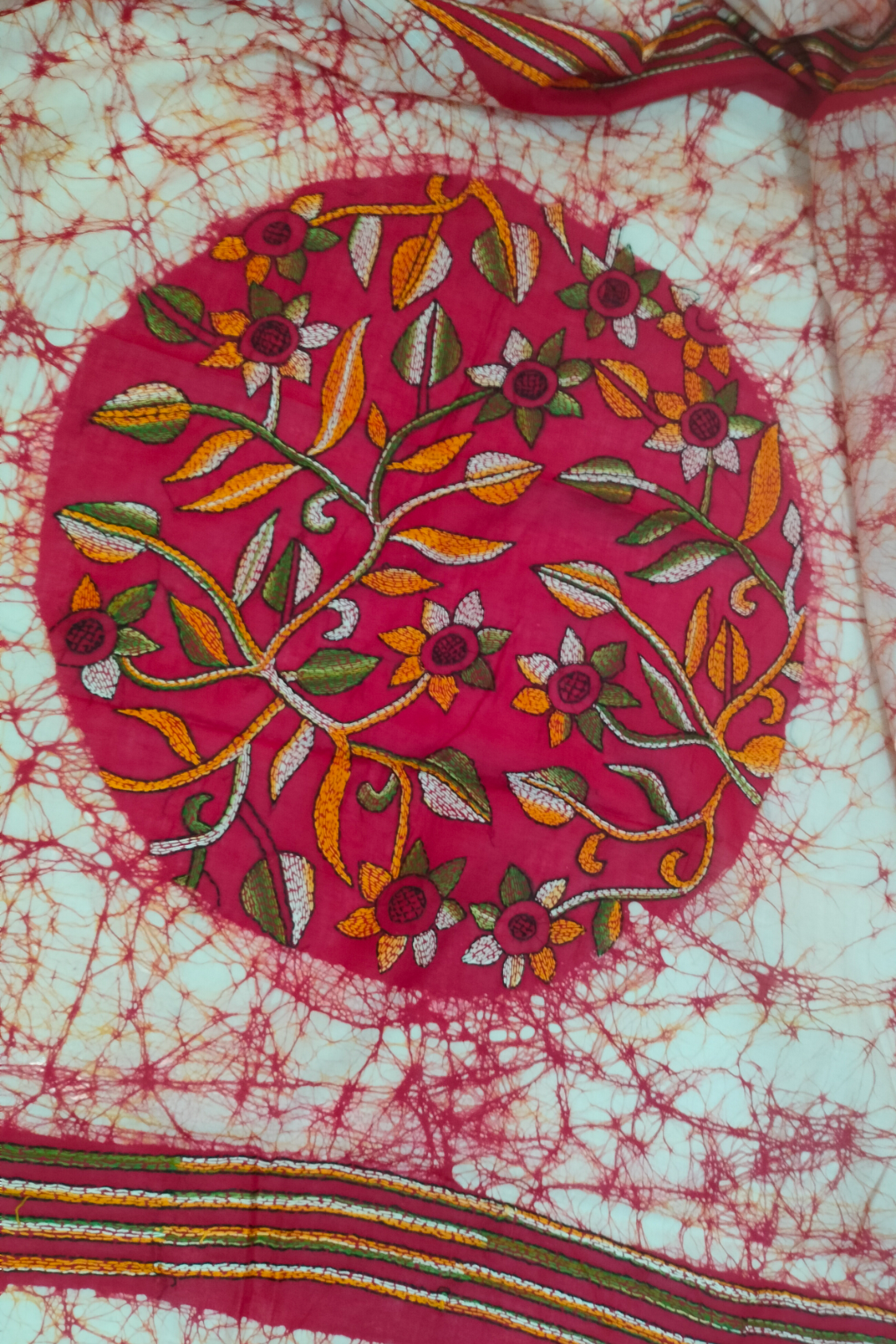 A beautiful Red and White cotton batik sari with intricate kantha embroidery floral circular panels in the border. The sari has a kantha panel in the palla. The sari comes with a running blouse piece with kantha embroidery border.
