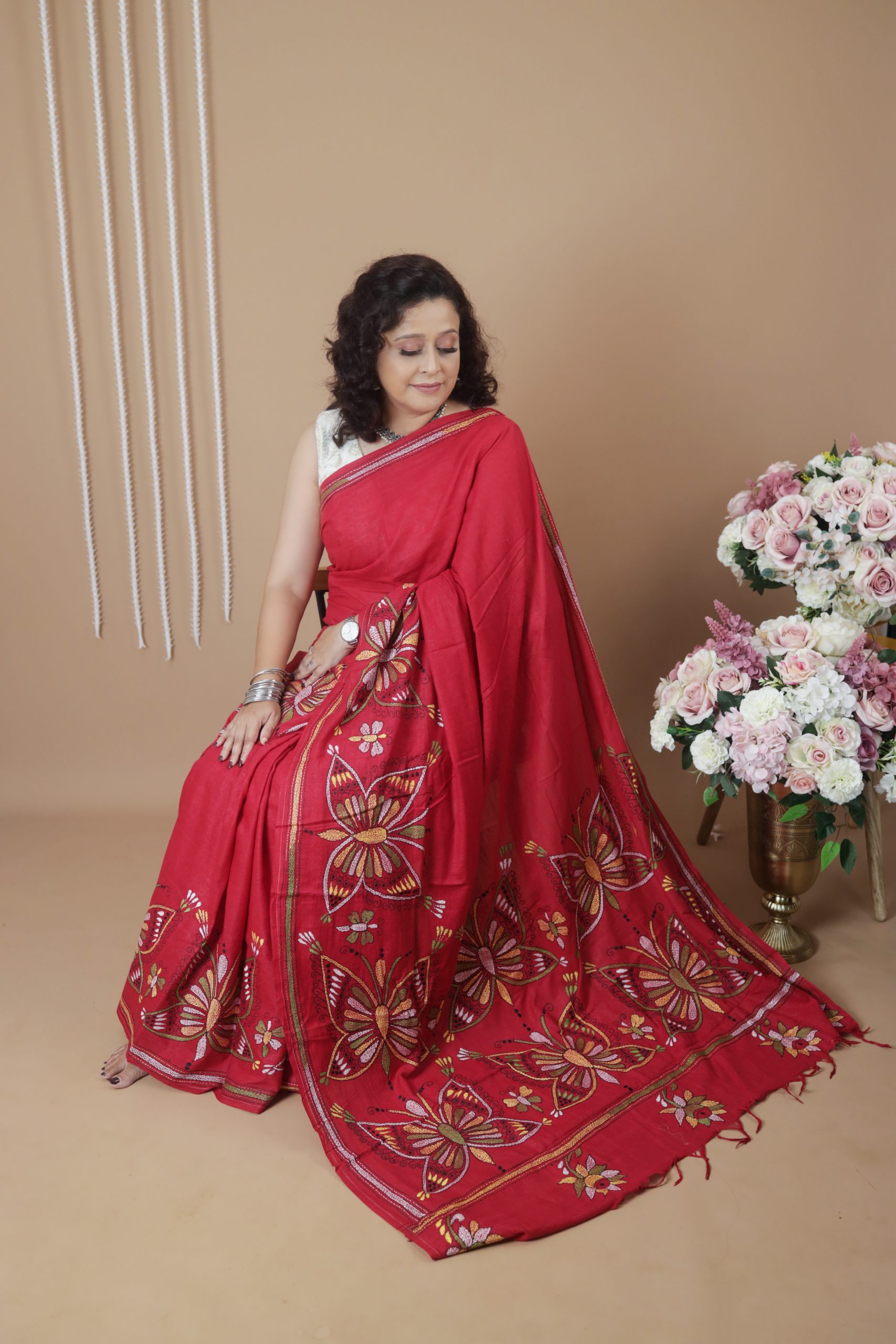 The Scarlet Flutter-Butterfly Motif Red Cotton Kantha Embroidery Saree