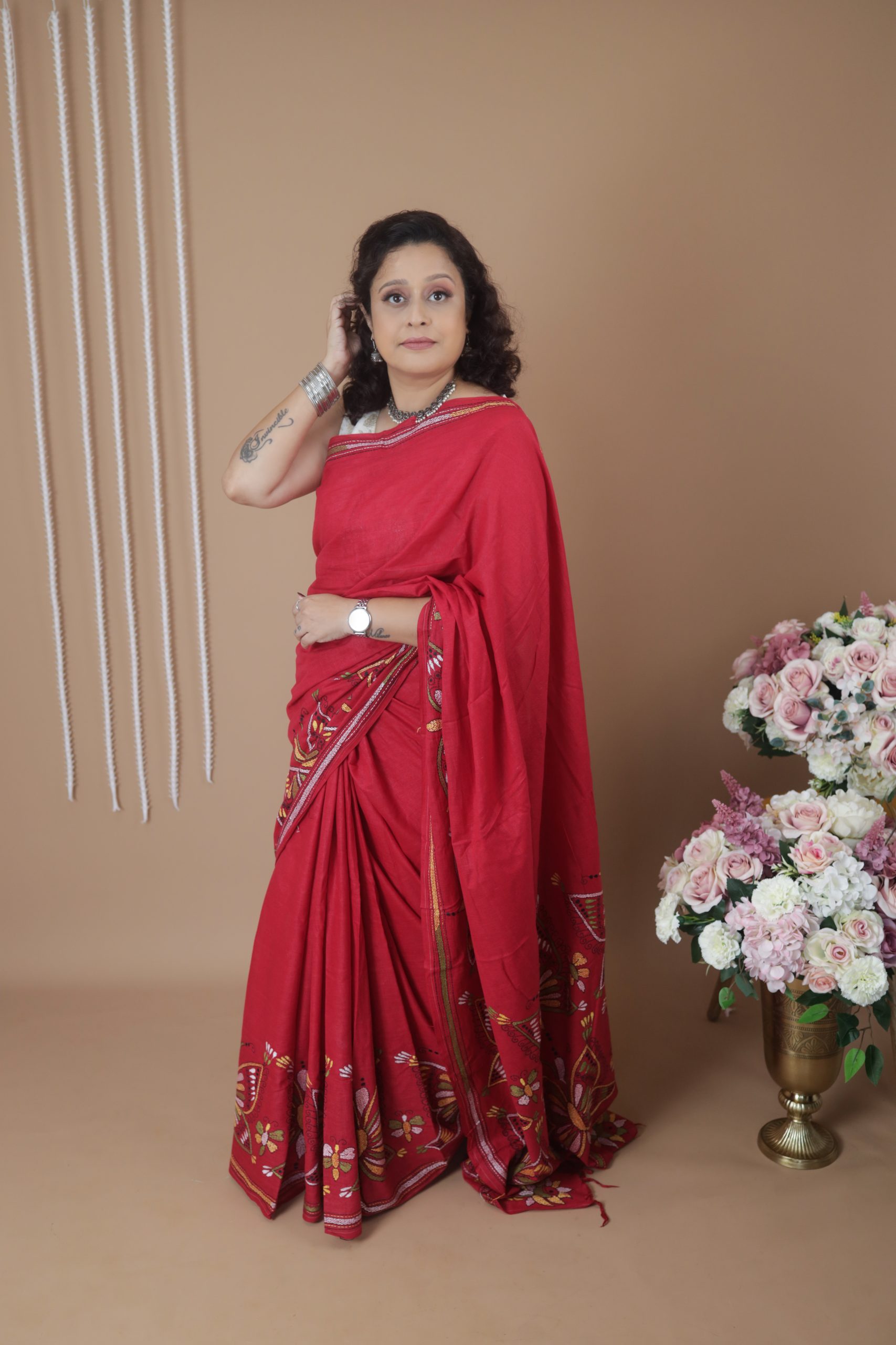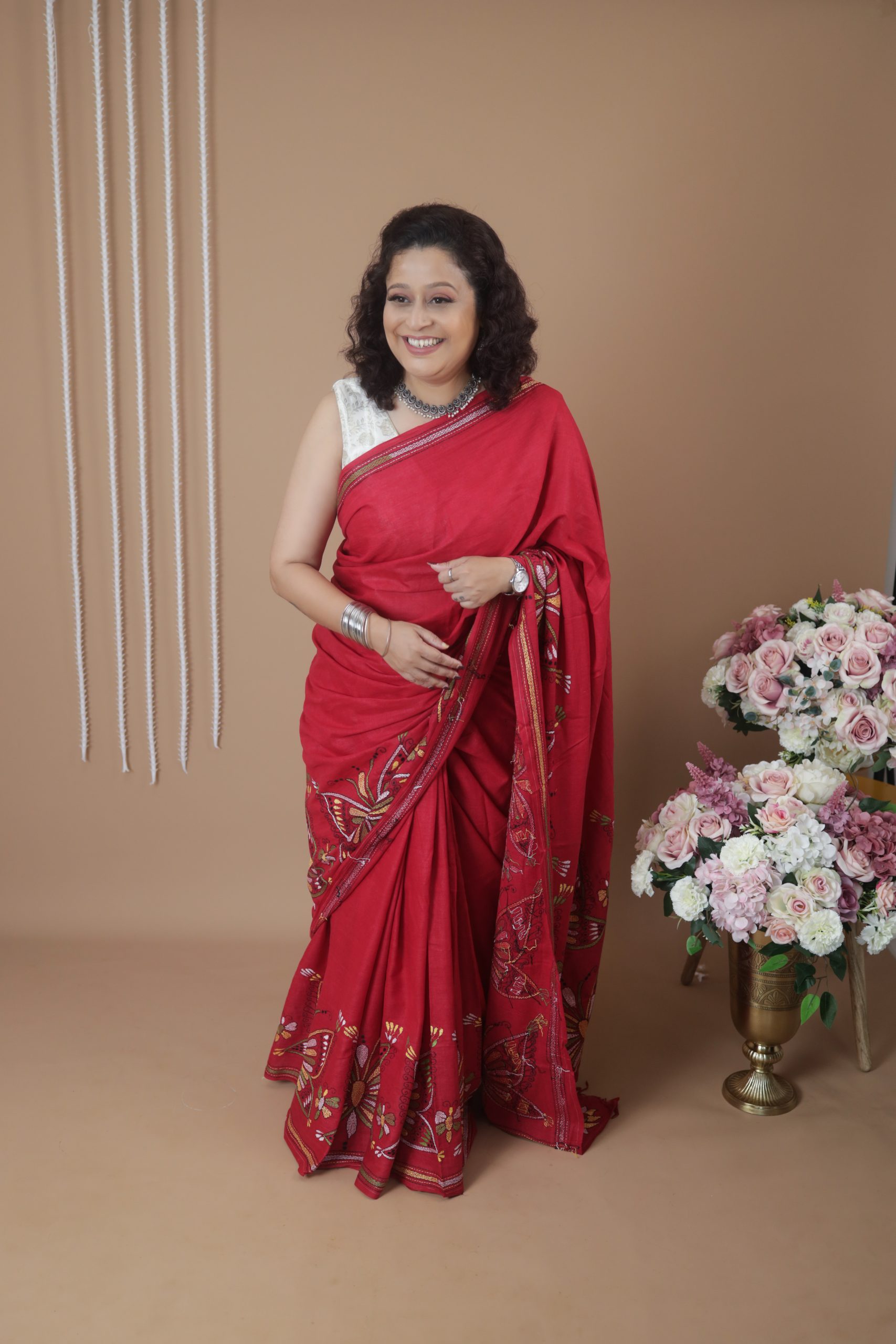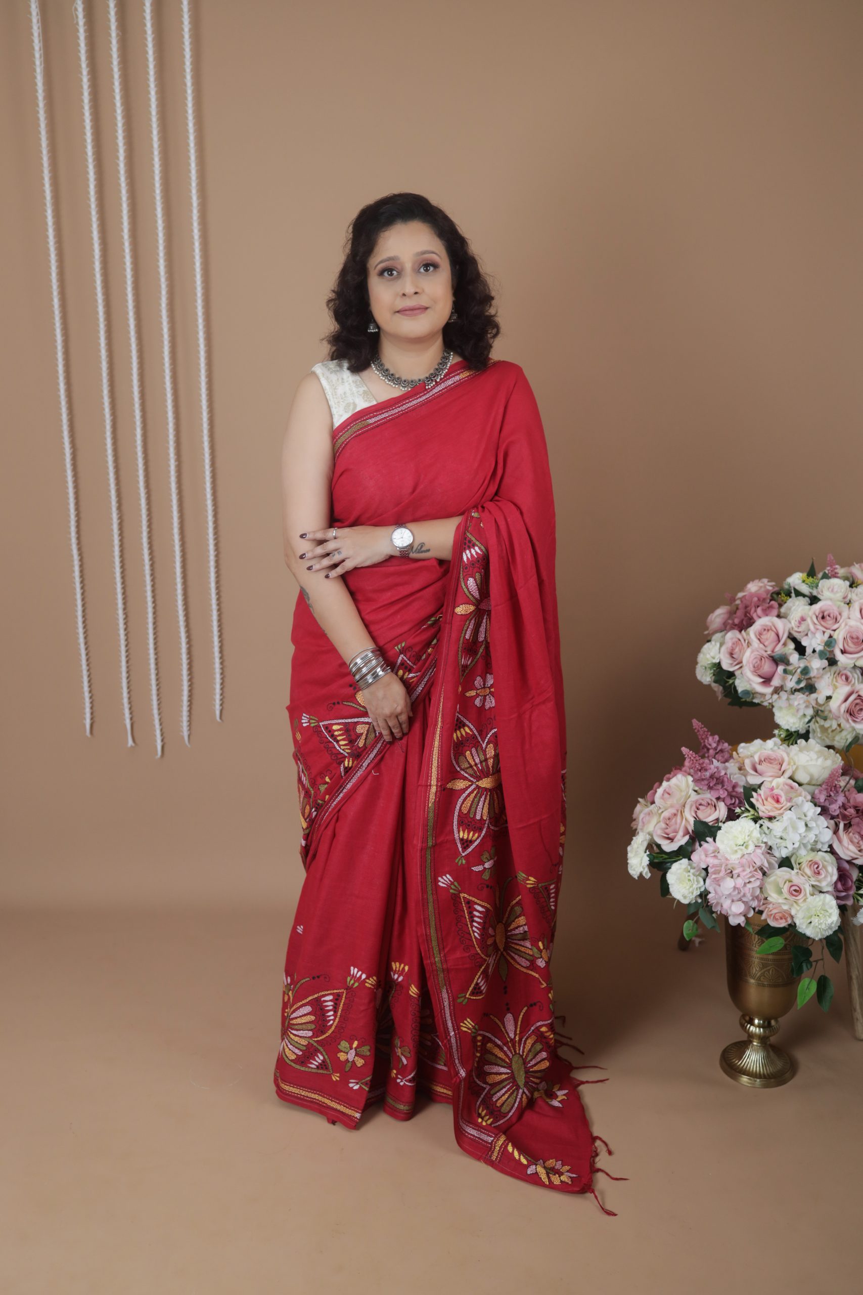 Home Handloom Cotton The Scarlet Flutter-Butterfly Motif Red Cotton Kantha Embroidery Saree