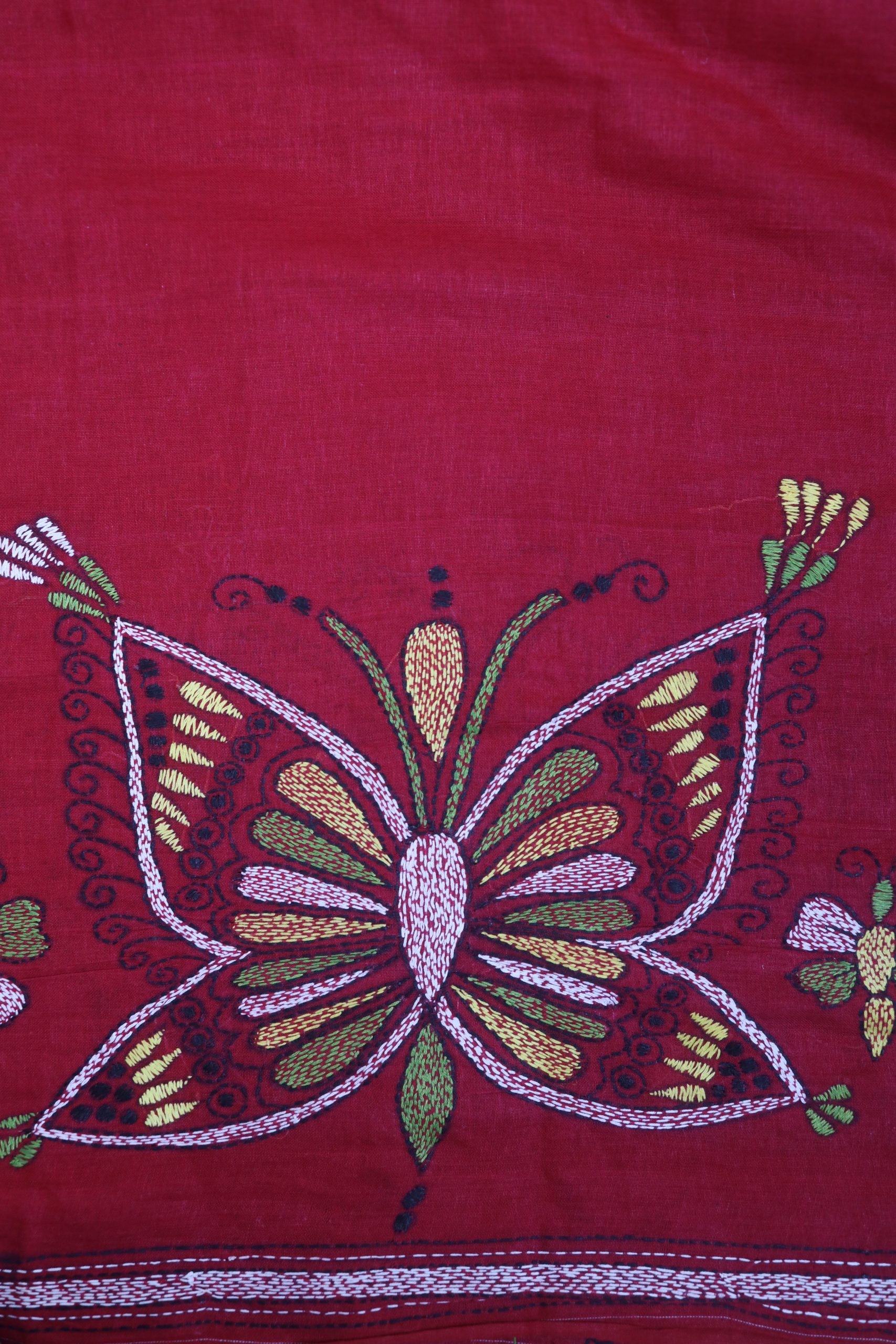 A beautiful Red Cotton Kantha Sari with intricate kantha embroidery of Butterfly Motif in the bottom border of the sari.