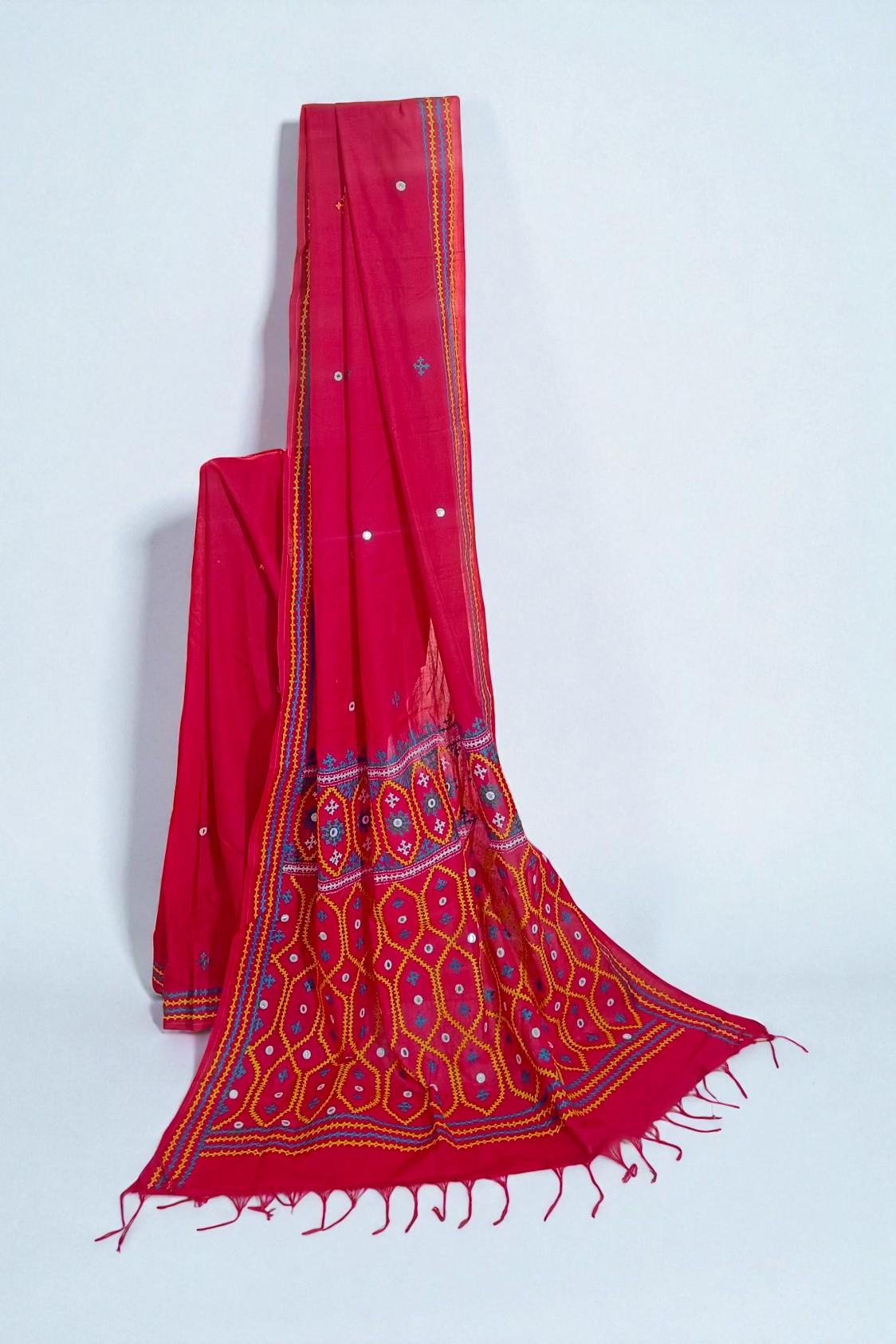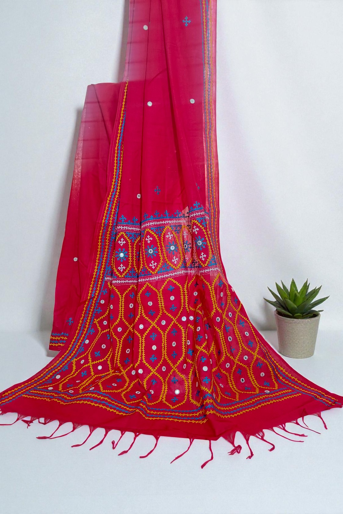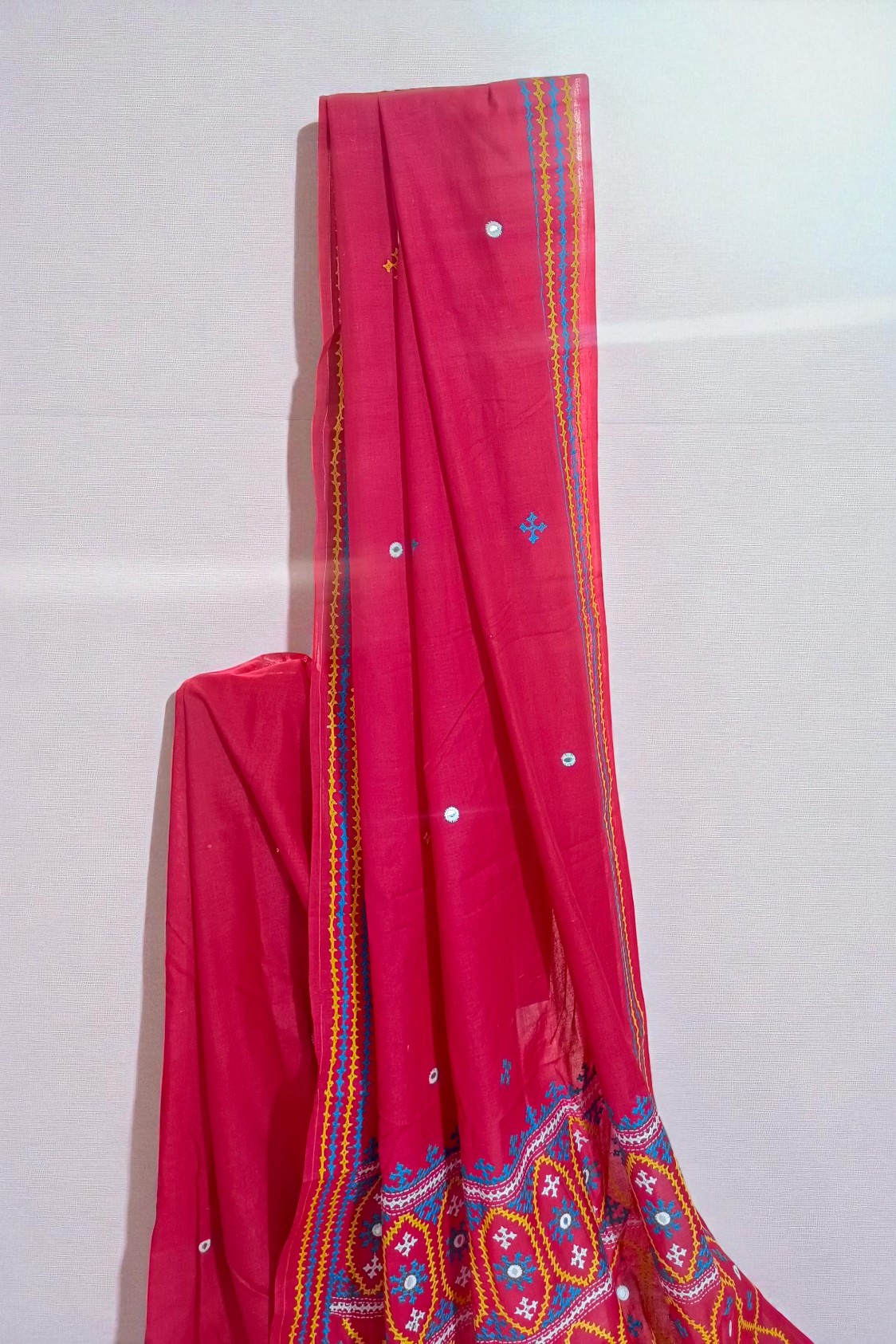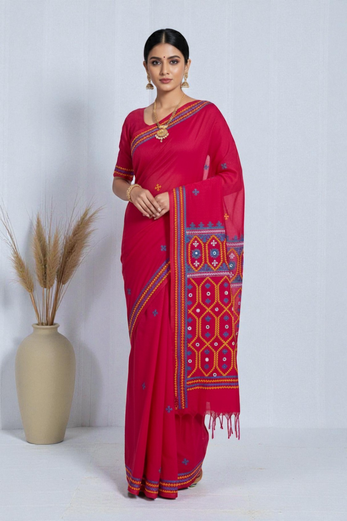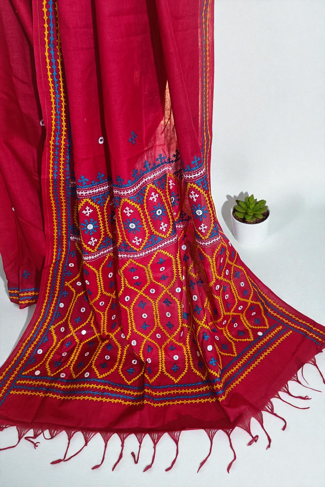 Embrace the vibrant spirit of Gujarat with this breathtaking Handloom Cotton Saree in a stunning Bright Red hue. This piece is a masterpiece, featuring intricate and authentic Kutch Kadhai (Embroidery) that transforms the traditional drape into a work of art.
