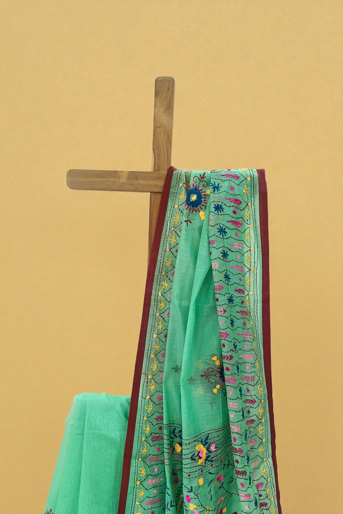 Green and Yellow Kantha Hand Embroidery Saree