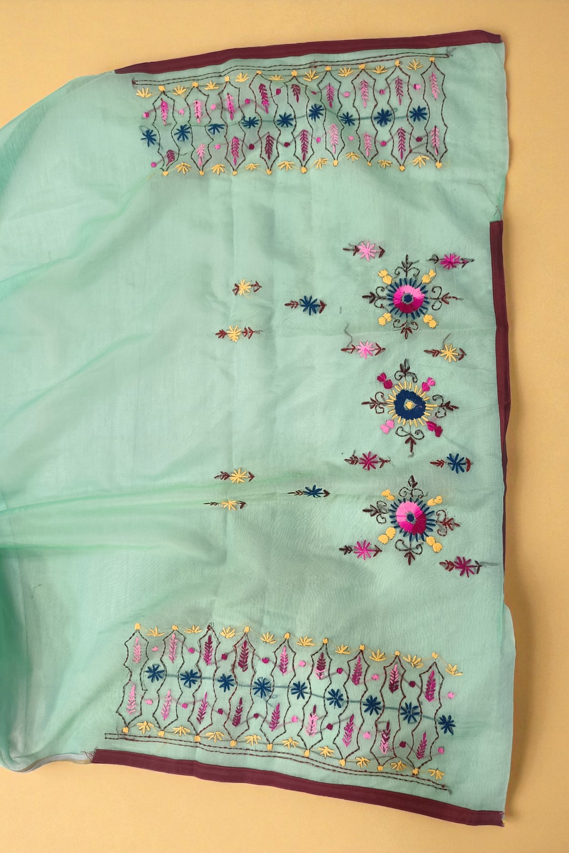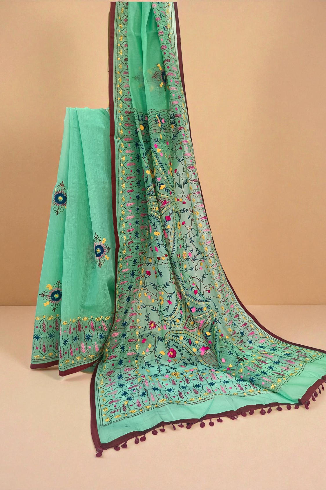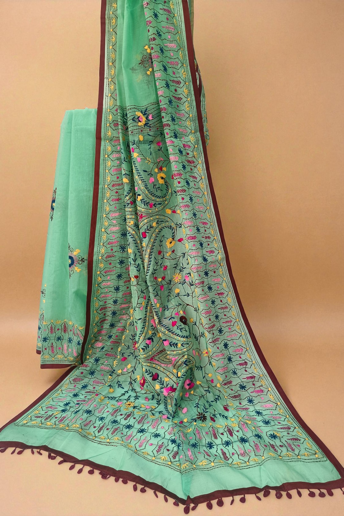 • Work: Authentic Phulkari Embroidery with Brown Piping and Tassels