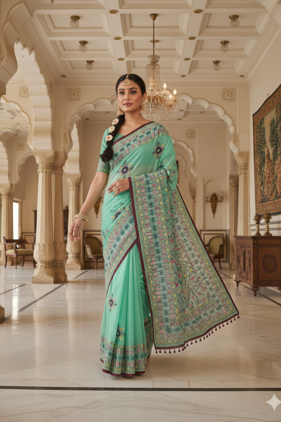 • Certain visuals, including the model wearing the product, have been created or enhanced using Artificial Intelligence, it is for illustration purposes only, any resemblance to any person is unintentional. We have described the features of the saree in the description as best as possible. In addition, we have displayed the images of the actual product as well.