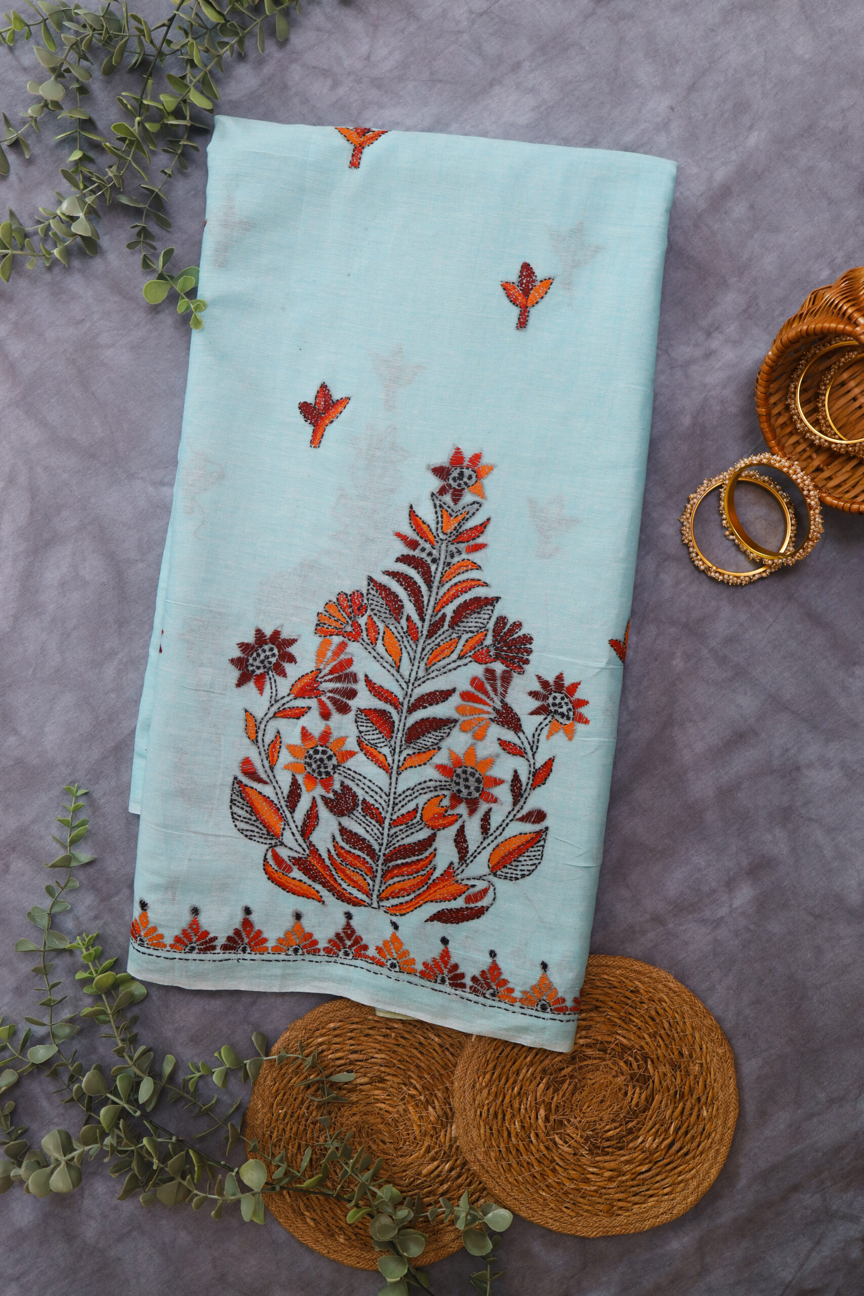 A beautiful Sky blue- light green cotton sari with intricate kantha embroidery floral