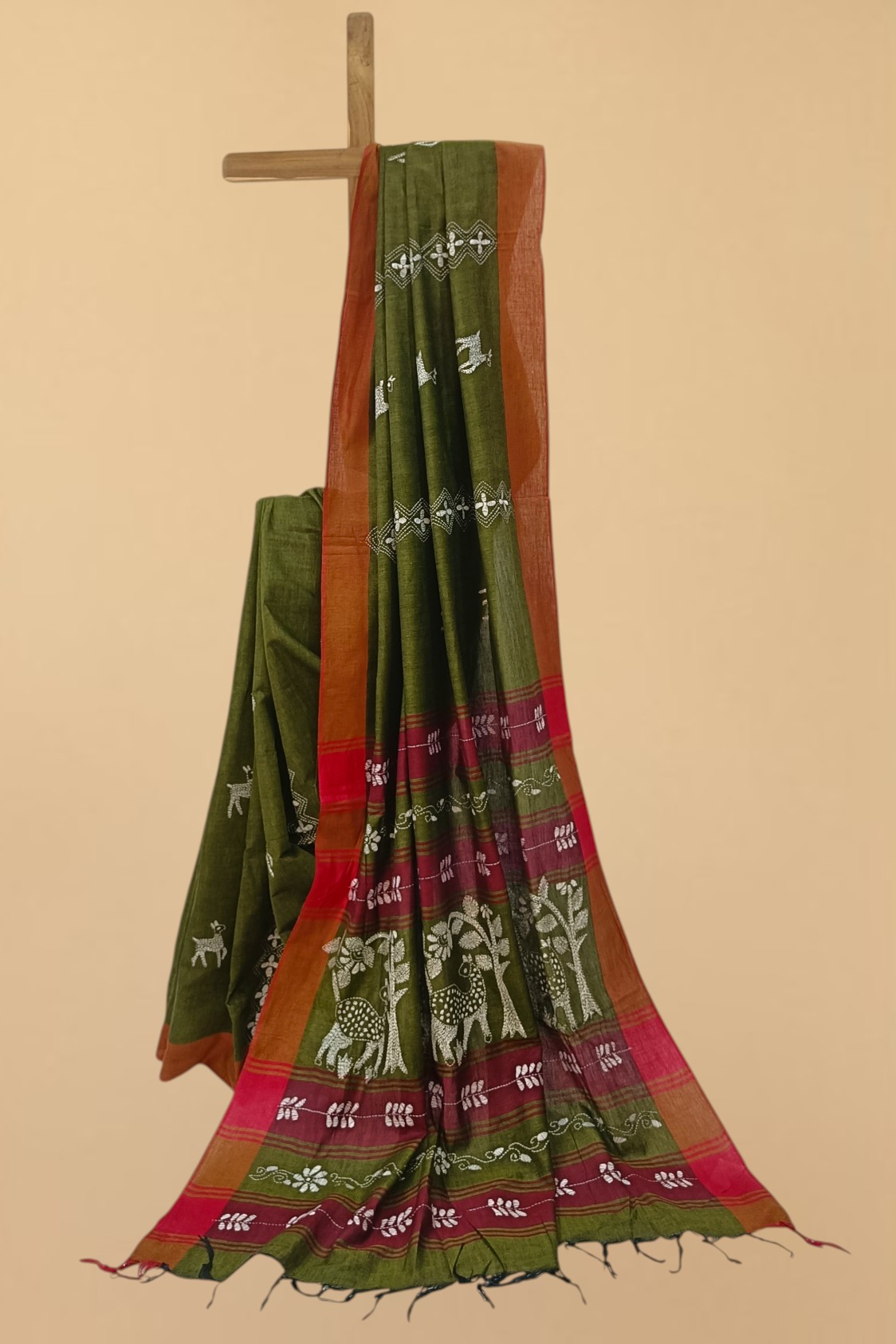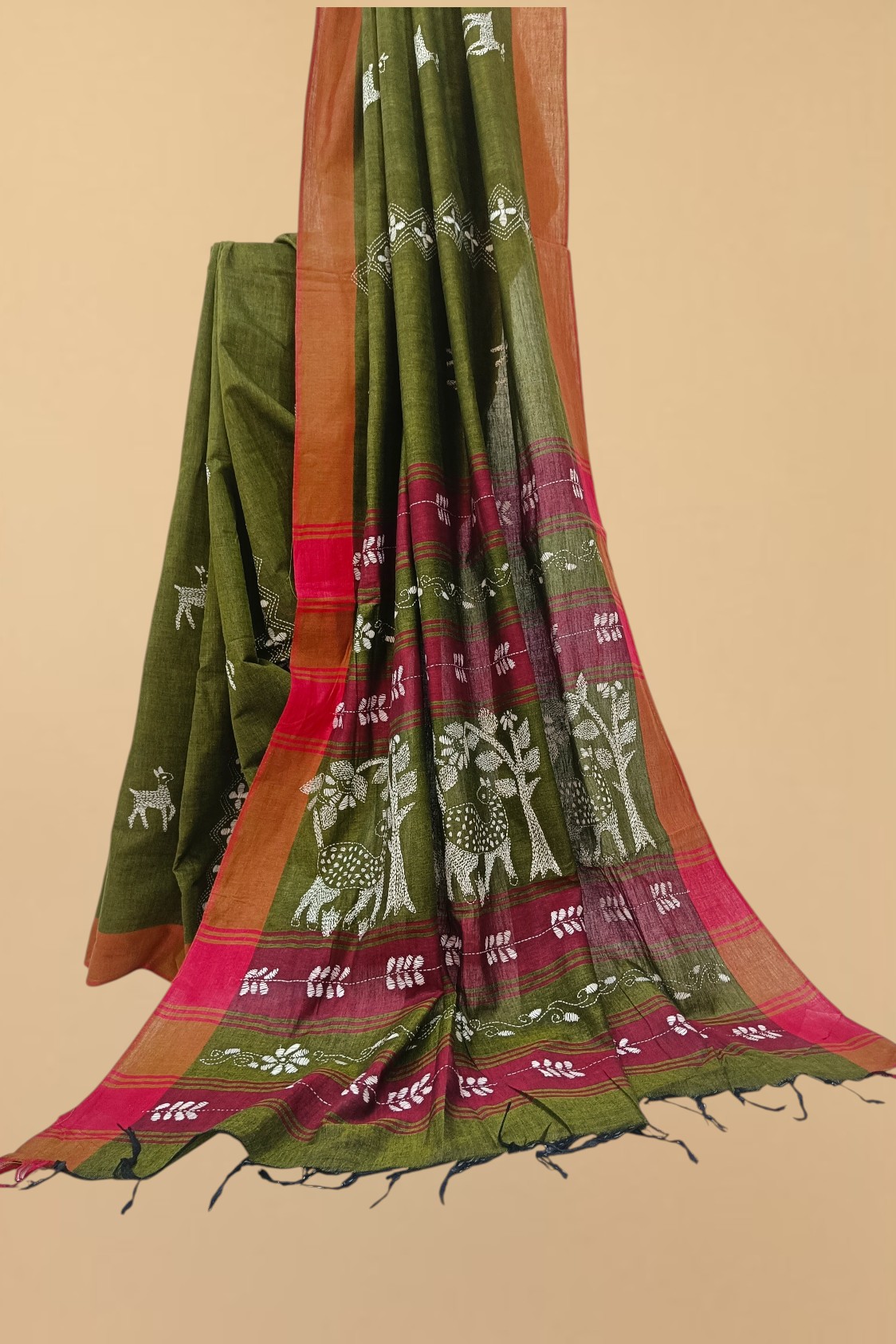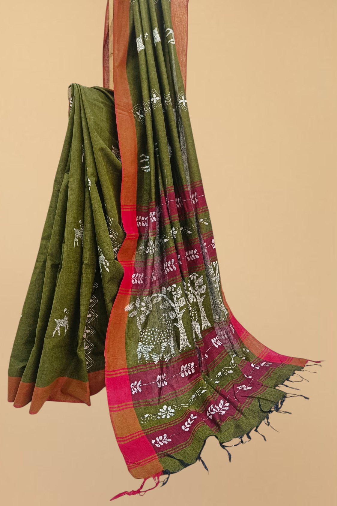 # The Enchanted Glade: Dark Olive & Fawn Kantha Saree