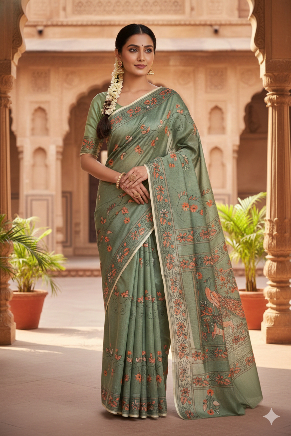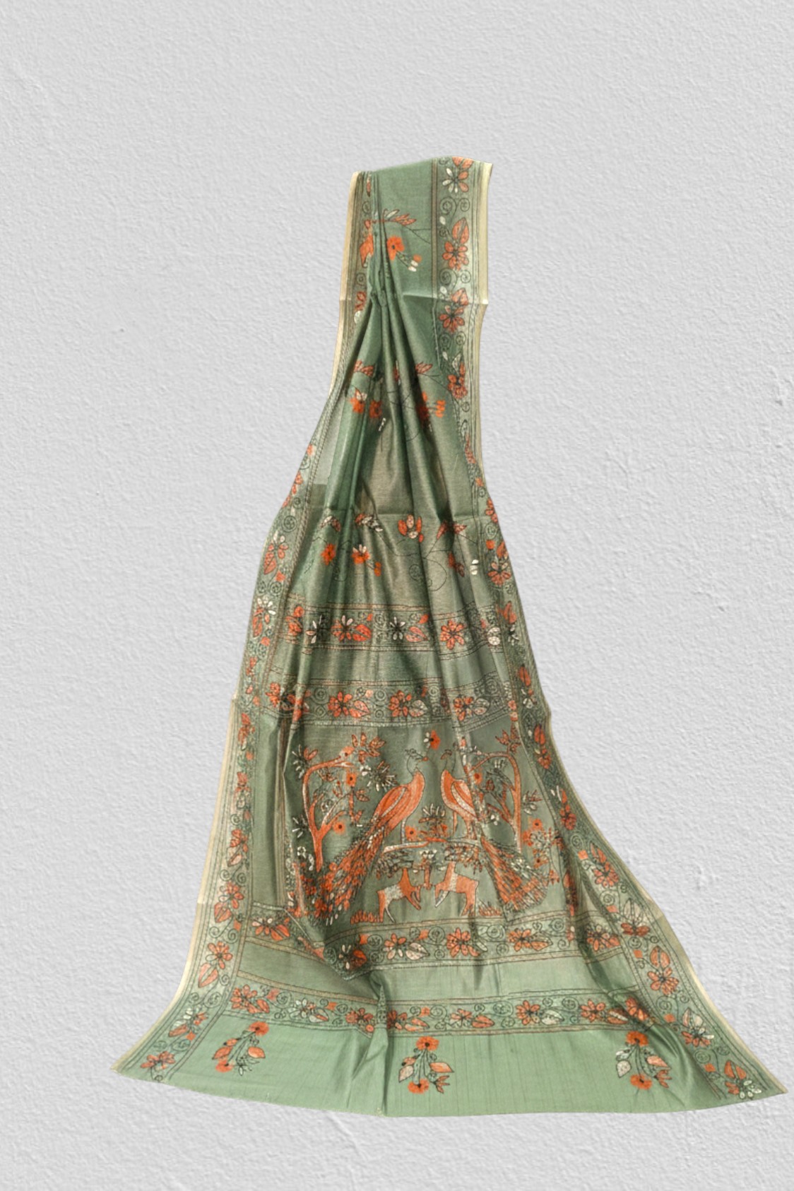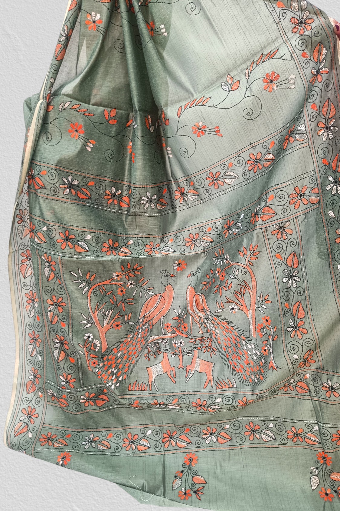 The Enchanted Grove: Sage Green Chanderi Kantha Saree