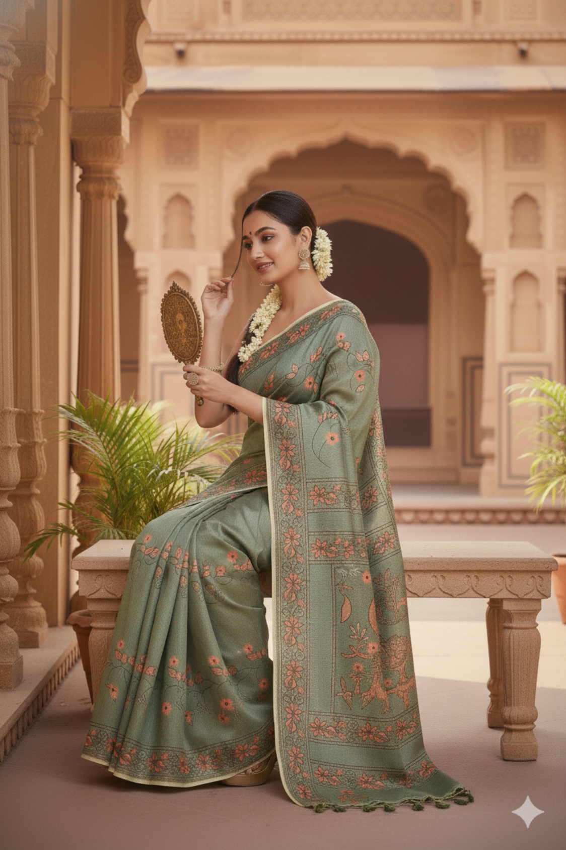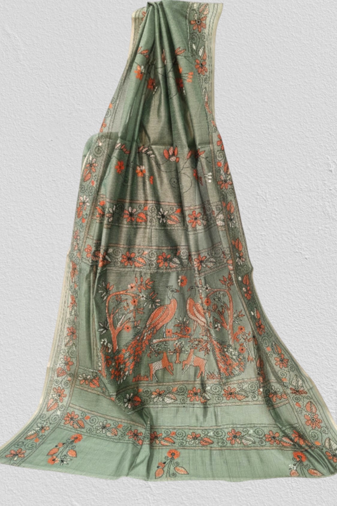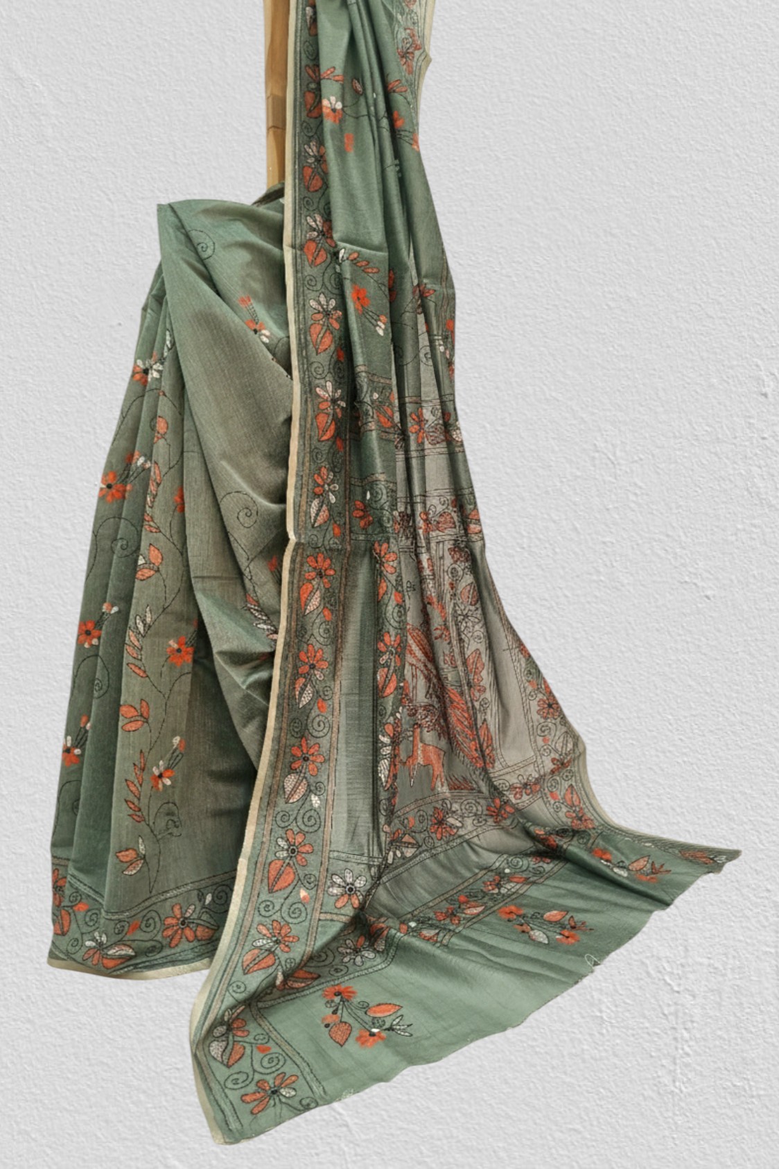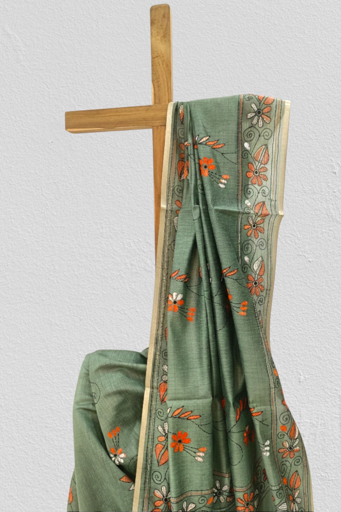 Home Sarees The Enchanted Grove: Sage Green Chanderi Kantha Saree