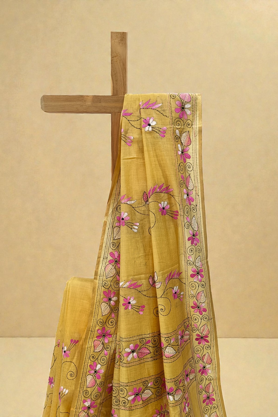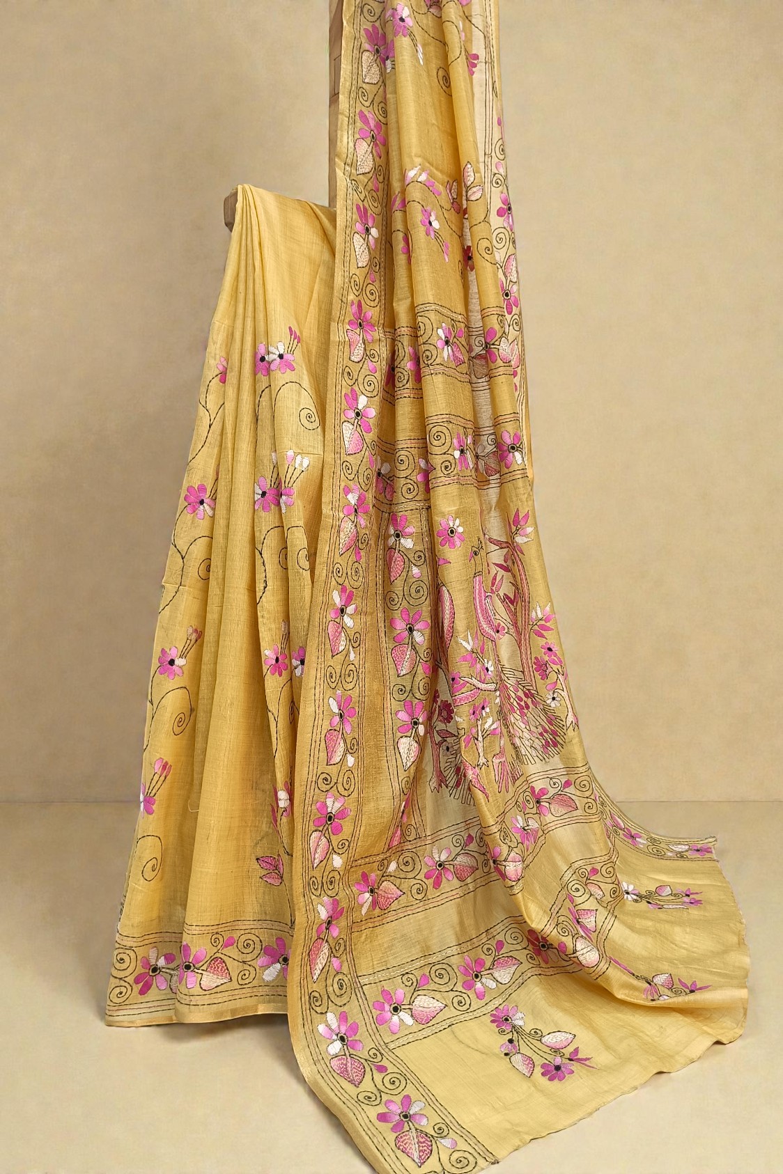 The Gilded Garden: Sandalwood Yellow Chanderi Kantha Saree