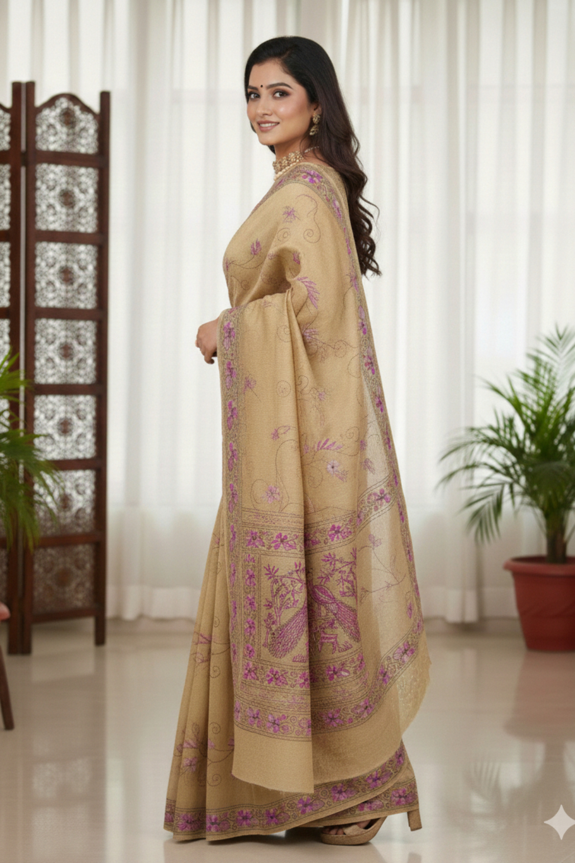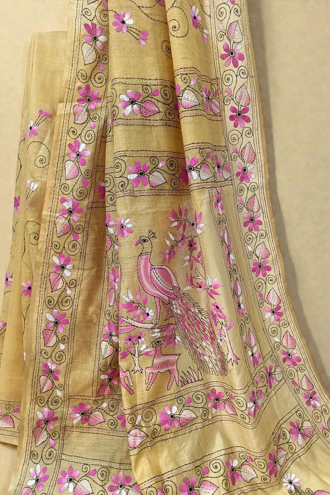 - Majestic Peacock Pallu: The pallu is the crown jewel of this saree, featuring an intricate peacock motif rendered in heavy Kantha work. The combination of Pink and White threads gives the peacock a life-like, regal depth.