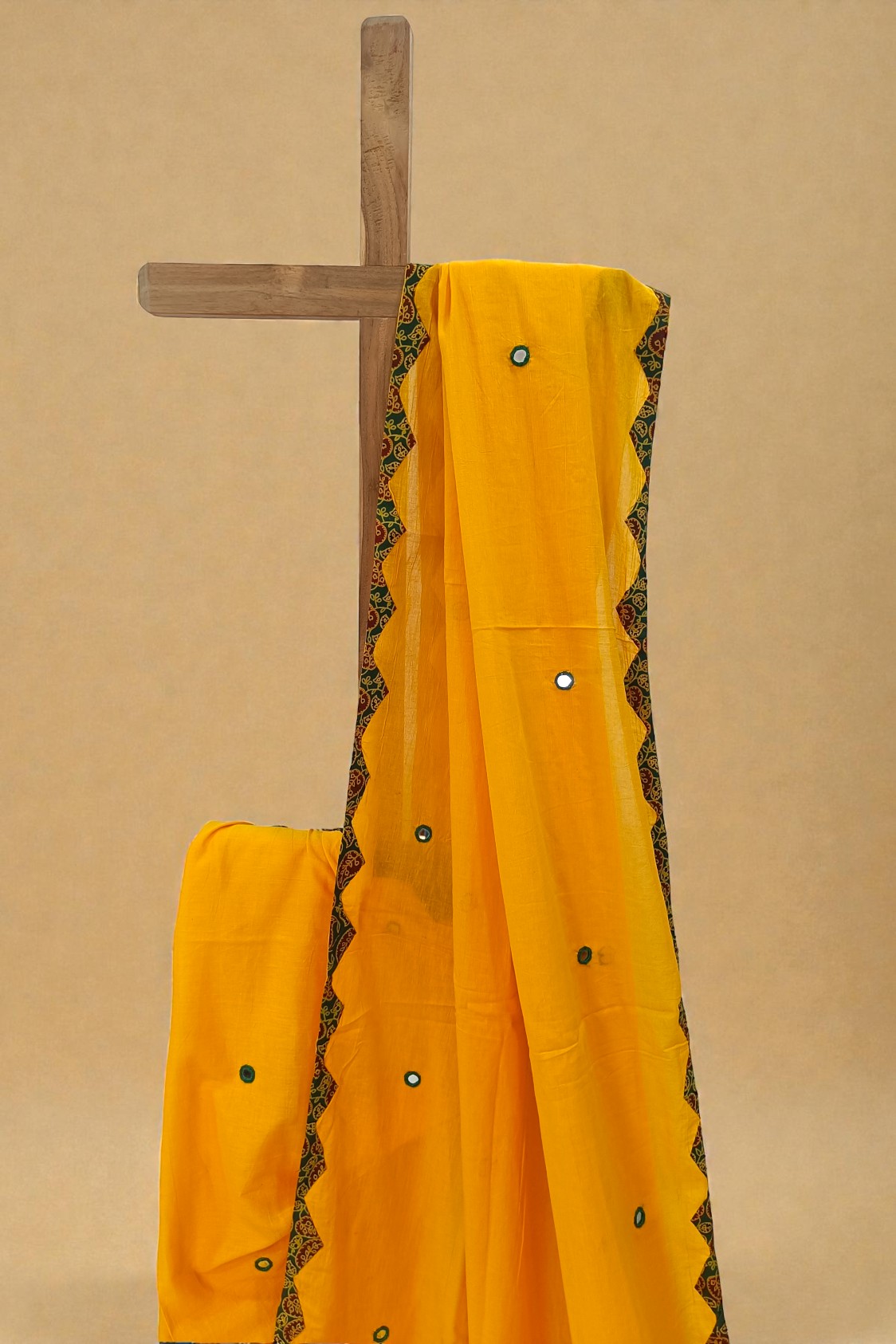 - Applique & Patchwork Detail: The saree is framed by printed Mustard Yellow patchwork along the borders. This layered technique adds a rustic, soulful depth to the bright yellow base.
