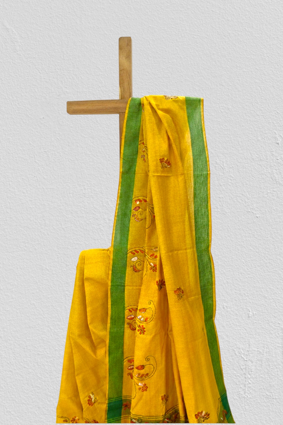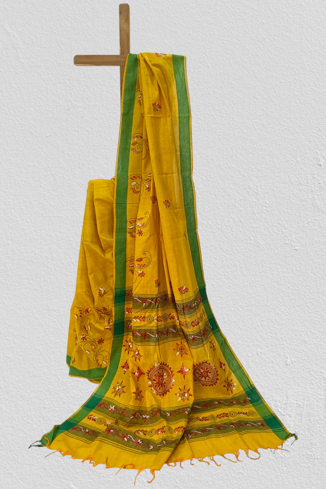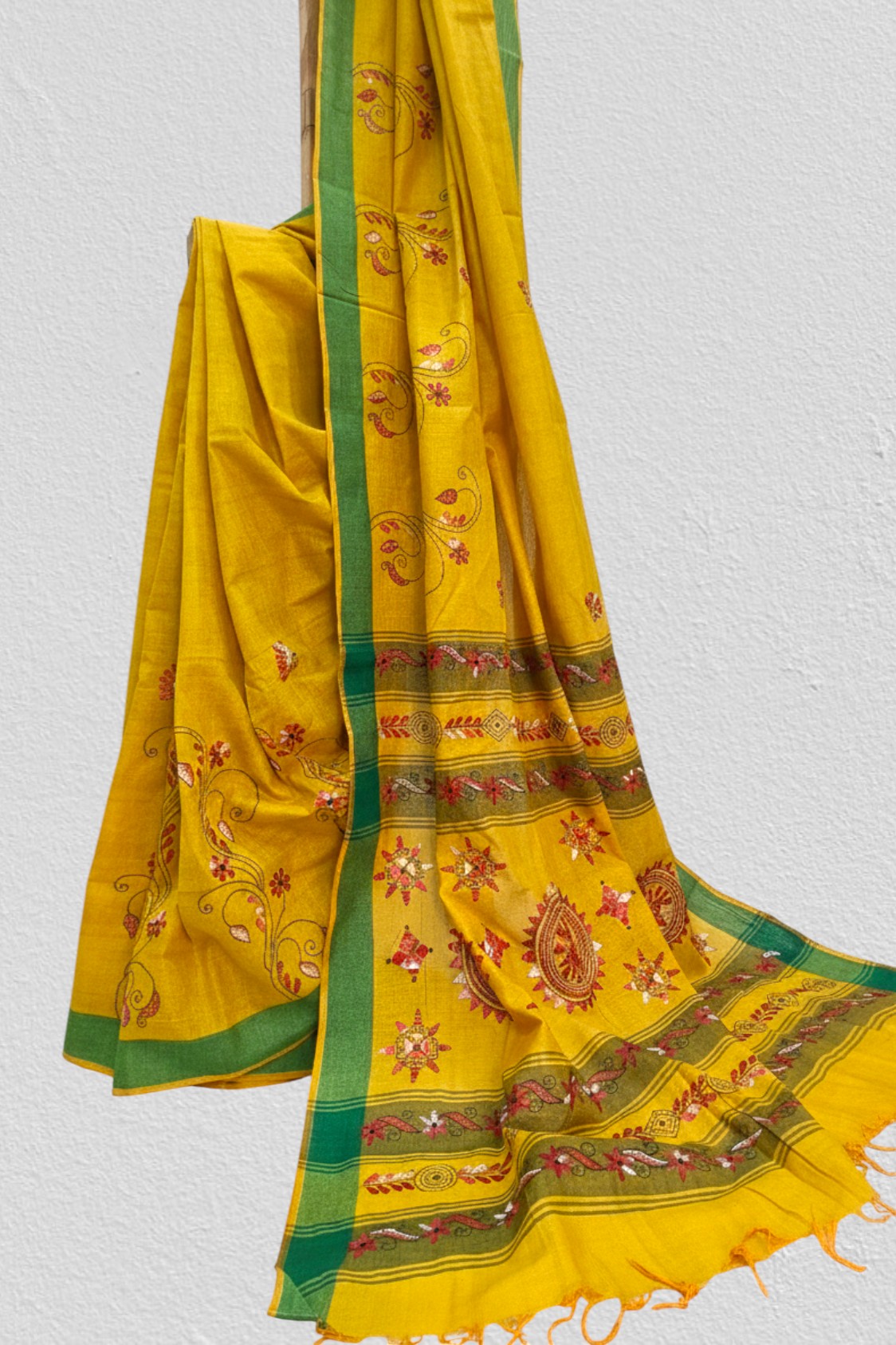 # The Golden Meadow: Sunny Yellow Khadi Cotton Kantha Saree