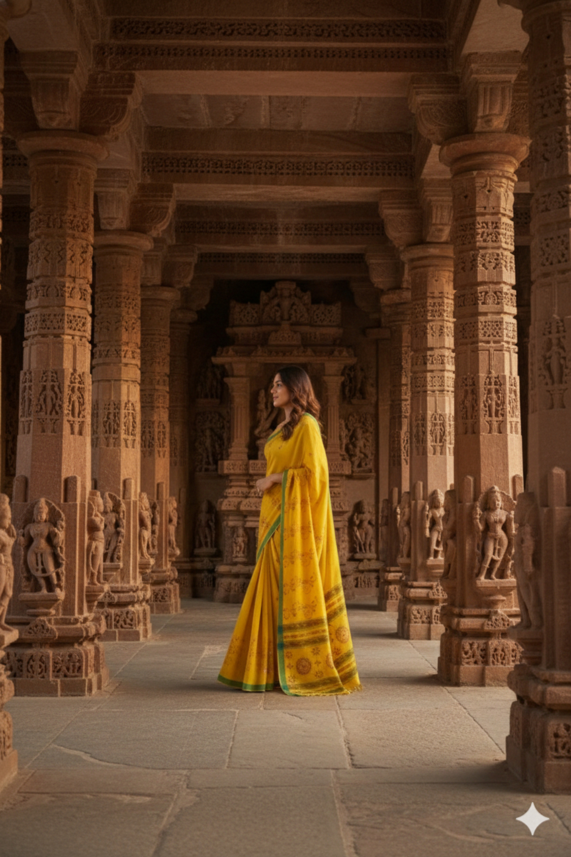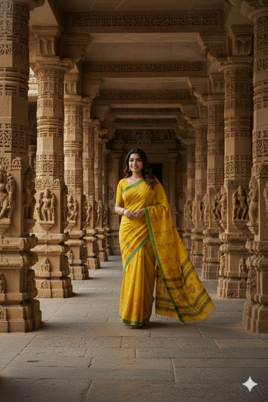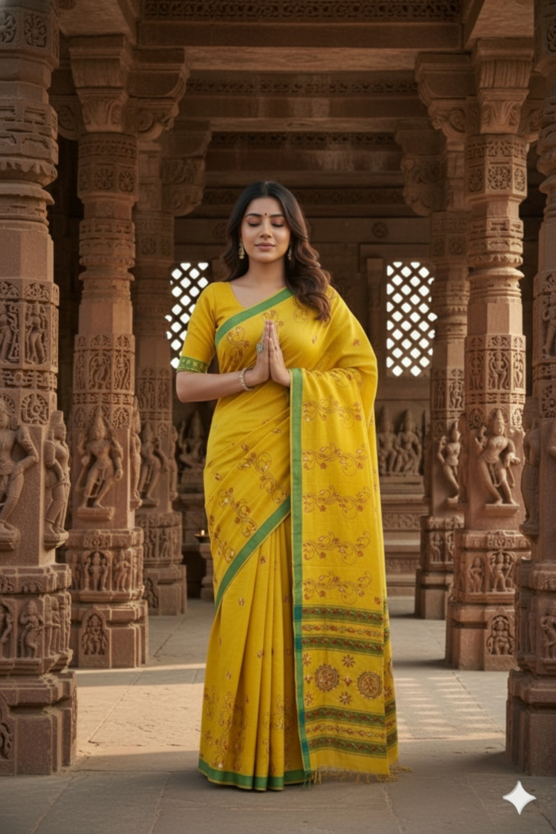 Radiate warmth and artisanal charm with this authentic Khadi Cotton masterpiece. The Sunny Yellow base offers a joyful, energetic canvas that celebrates the natural, textured feel of Khadi. Known for its breathability, this saree is designed to keep you cool and poised throughout the day.