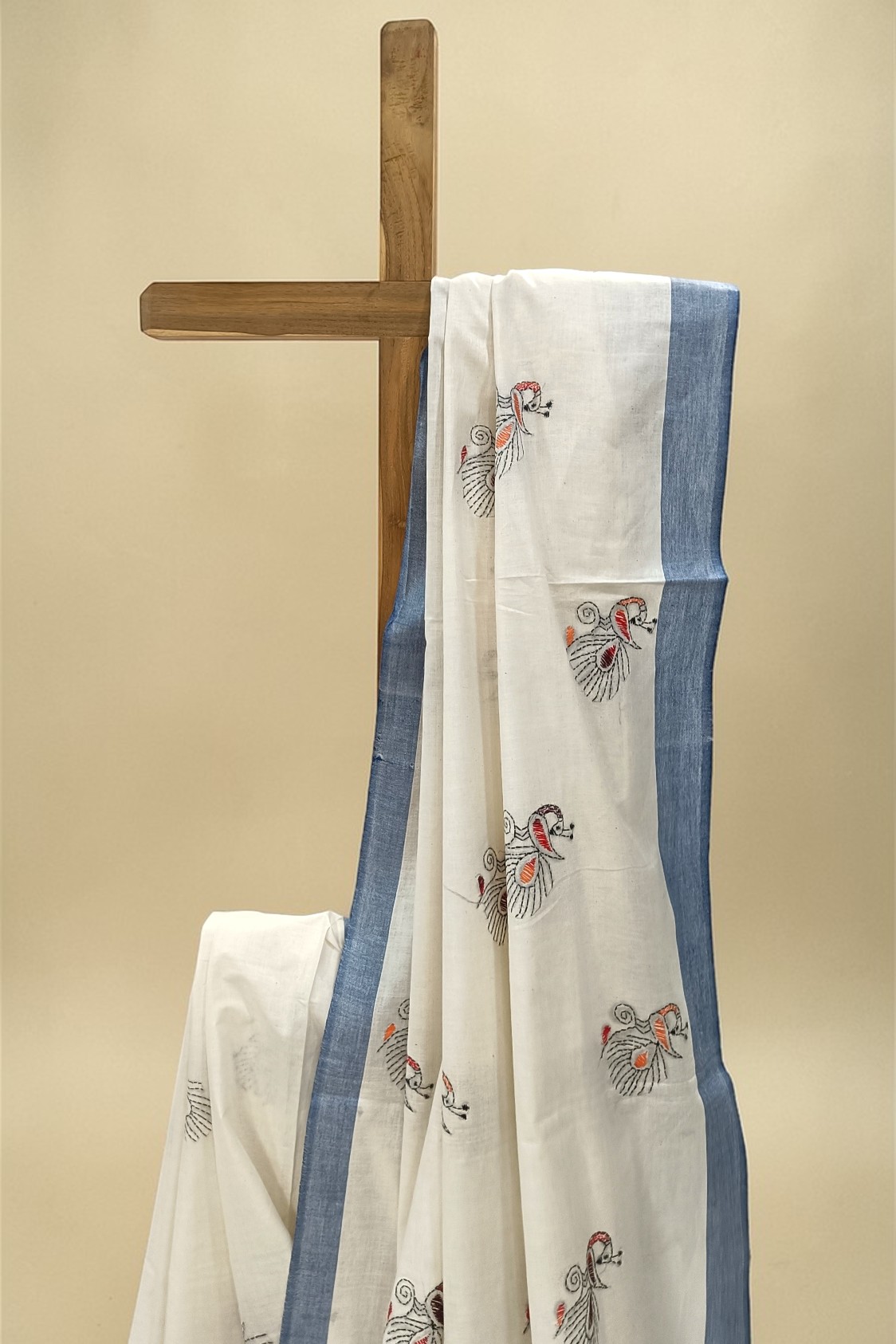 Home Sarees # The Indigo Plume: White Handloom Peacock Kantha Saree